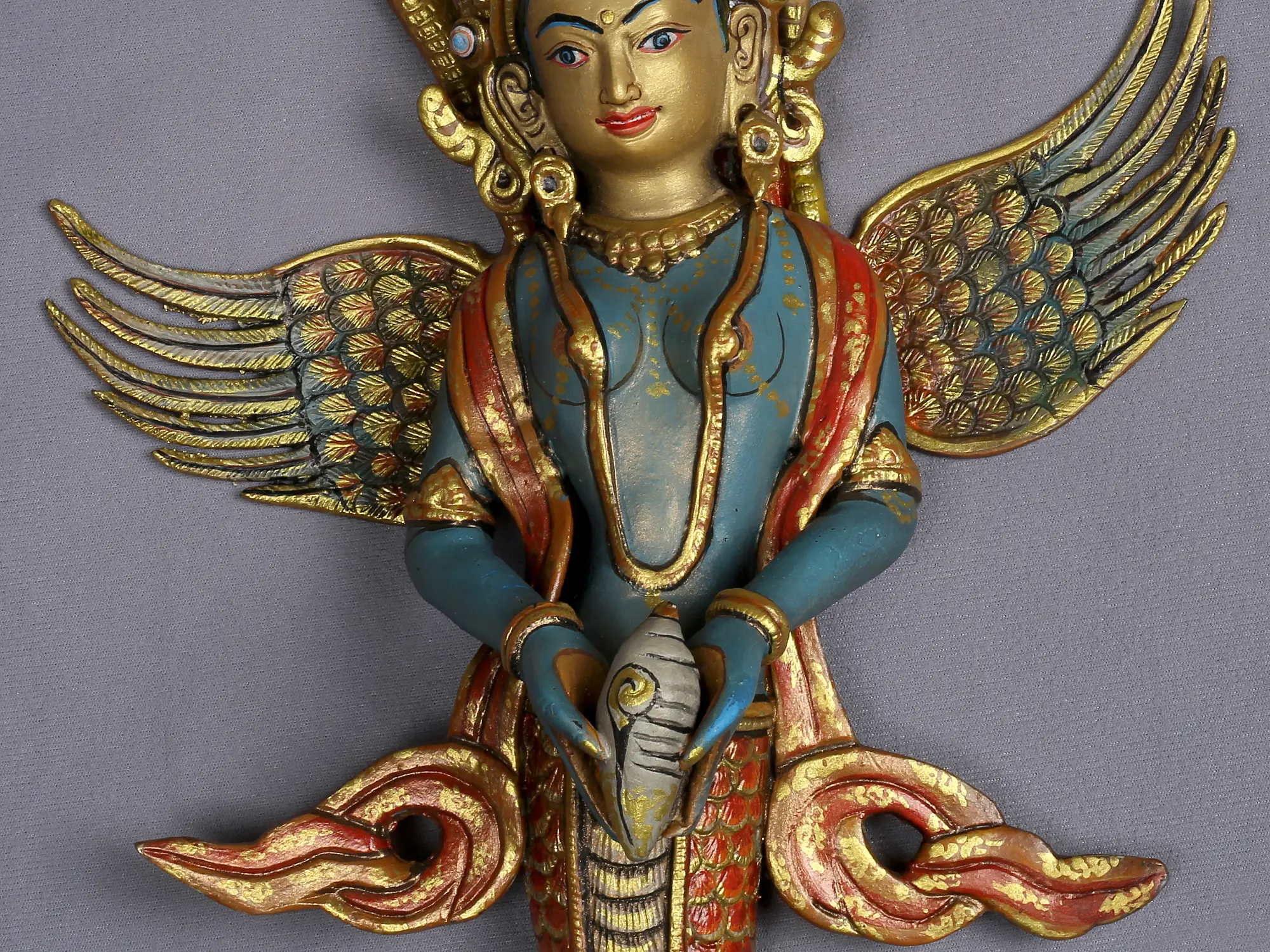 Each element of this statue is meticulously sculpted and painted by skilled artisans in Nepal, carrying forward traditions passed down through generations. The serene expression, the elaborate headdress, and the flowing form of the serpent's tail all speak to a profound understanding of aesthetics and symbolism. The golden sheen highlights the divine aspect of the deity, while the contrasting colors on the serpent's body and the delicate wings create a visually striking and harmonious composition. Holding a conch shell, a symbol of divine sound and purification, she reinforces her role as a benevolent force. This statue is not merely a decorative object but a conduit to the spiritual realm, a piece that can inspire contemplation and bring a sense of peace and protection to any space it graces. It serves as a beautiful reminder of the enduring power of myth and the artistry that brings these tales to life.
