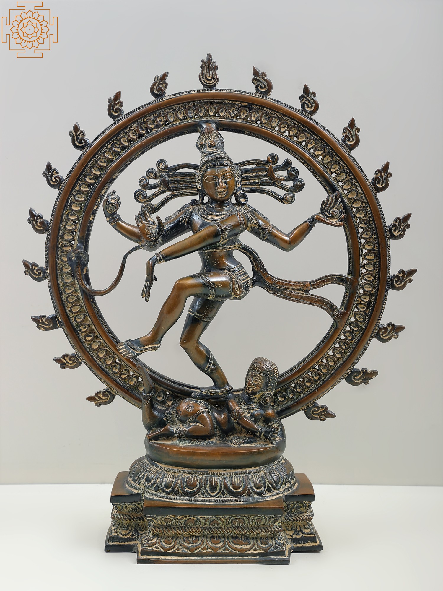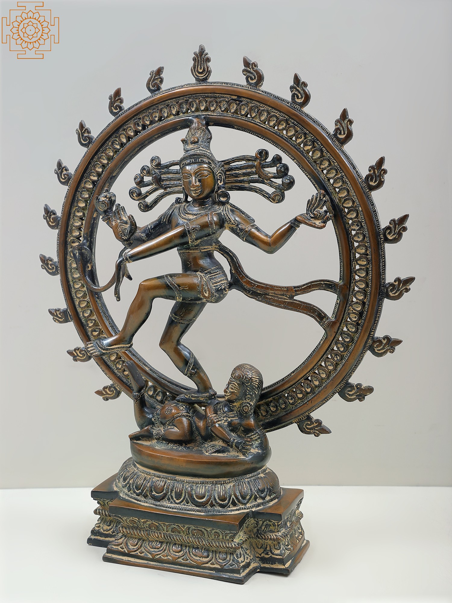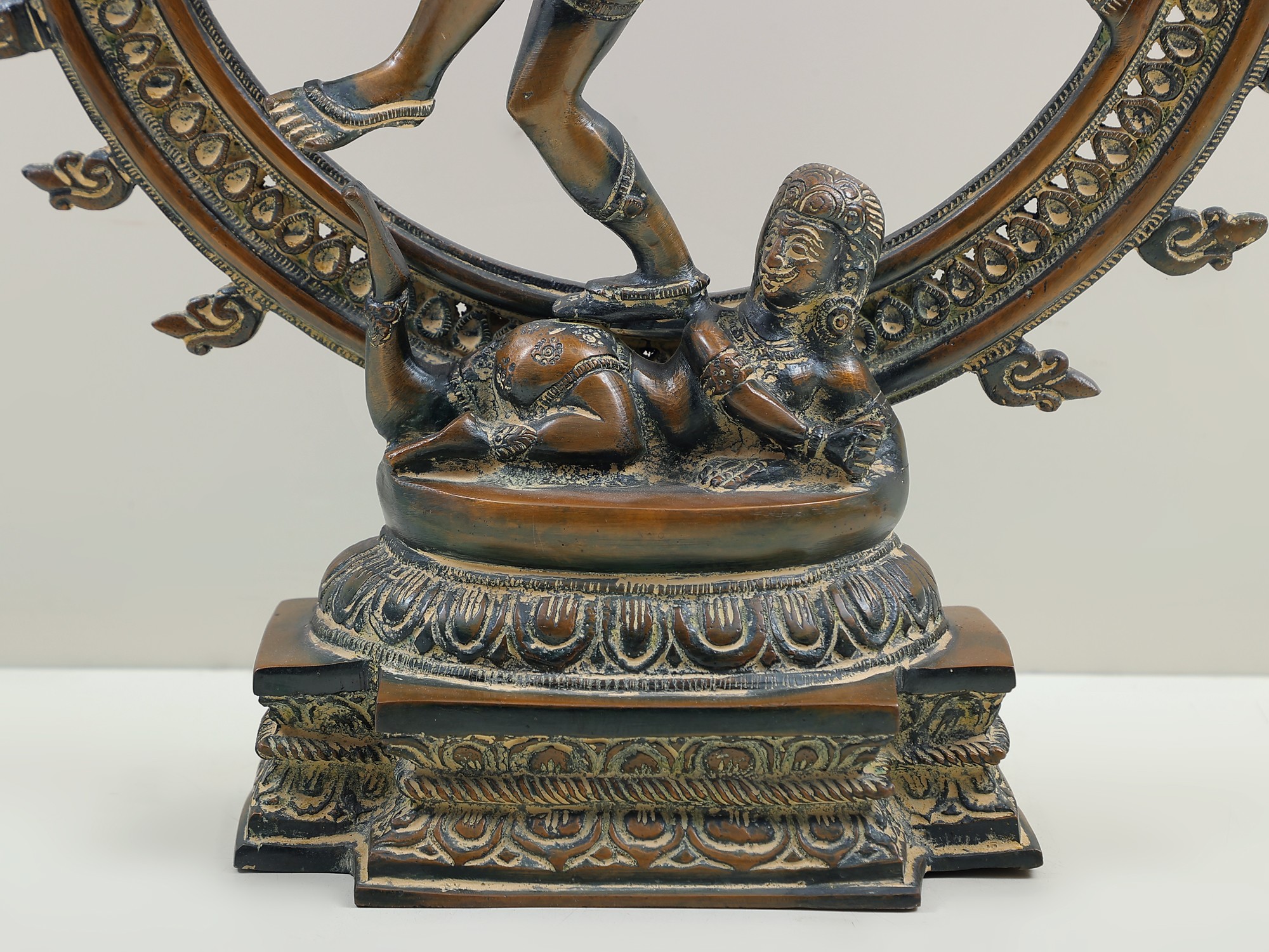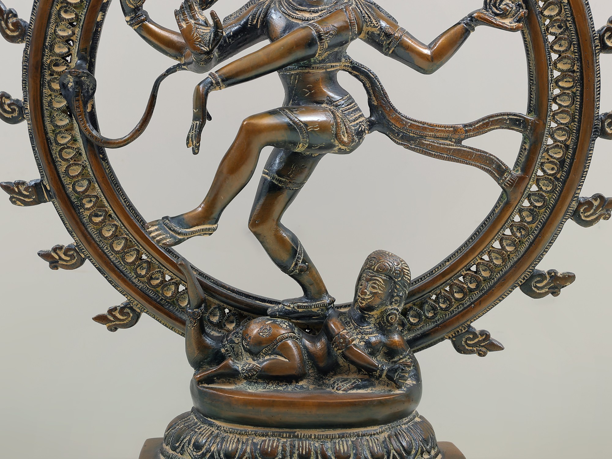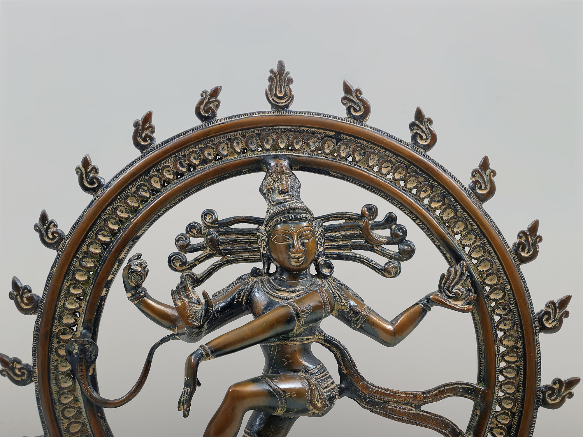 This is a brass statue of Nataraja, a depiction of the Hindu god Shiva, as a cosmic dancer. Nataraja means, the lord of the dance. It is the only form of Shiva worshipped as a human figure. This dance style is known as Tandava. It is the dance of destruction, aggression, creation, solace, and liberation from the evil aspects.