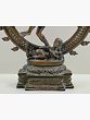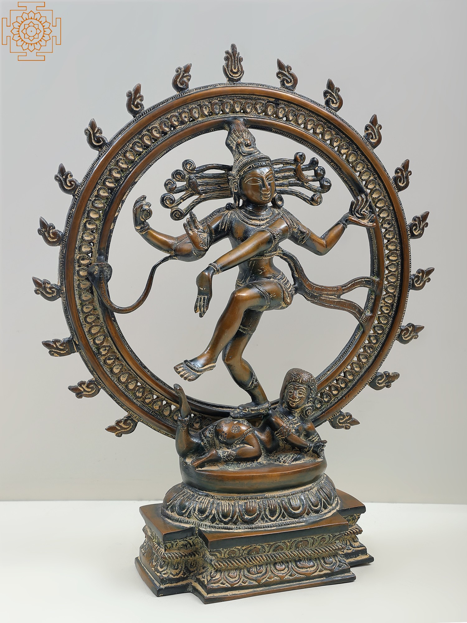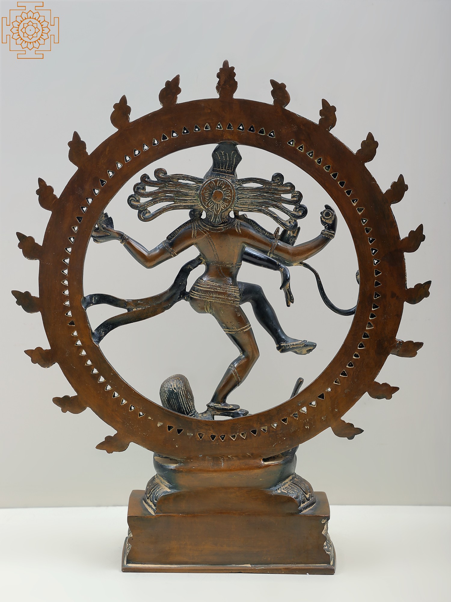 Nataraja is dancing in an exquisite two-layered circular ring with a circular chain of small drop-like pellets in between. The ring is surrounded by bright cosmic flames. This wondrous circular ring is called Prabha Mandala, emitting universal flames that can create and consume everything. This sculpture is placed on an inverted lotus, which is kept on a beautiful three-layered plus-shaped pedestal. This heavenly frame around the statue of Nataraja is making it more statuesque.