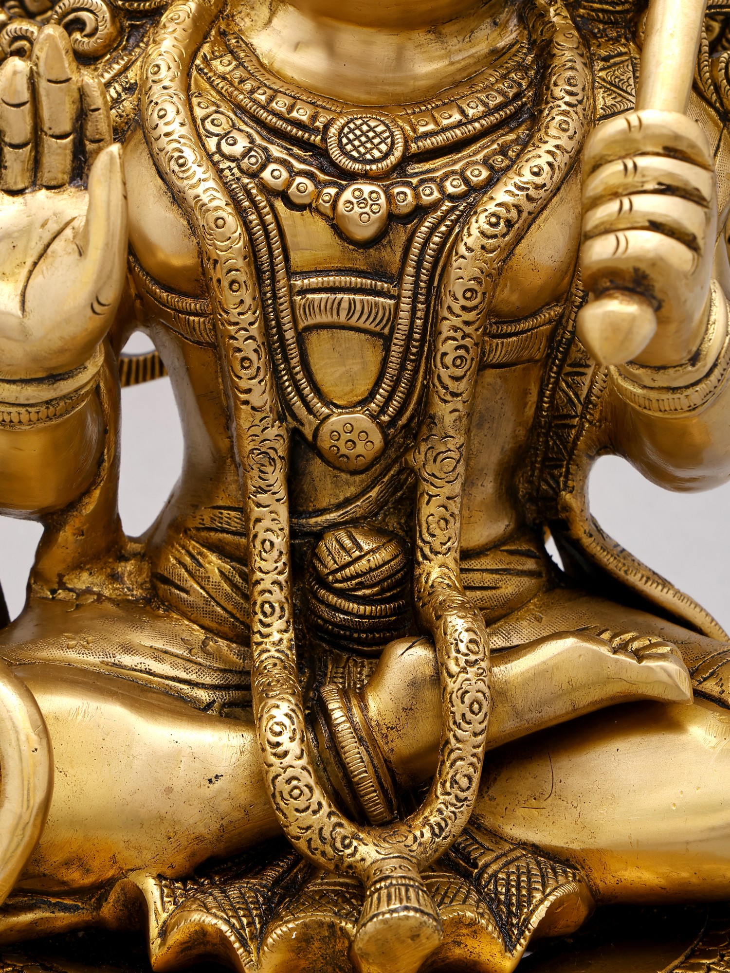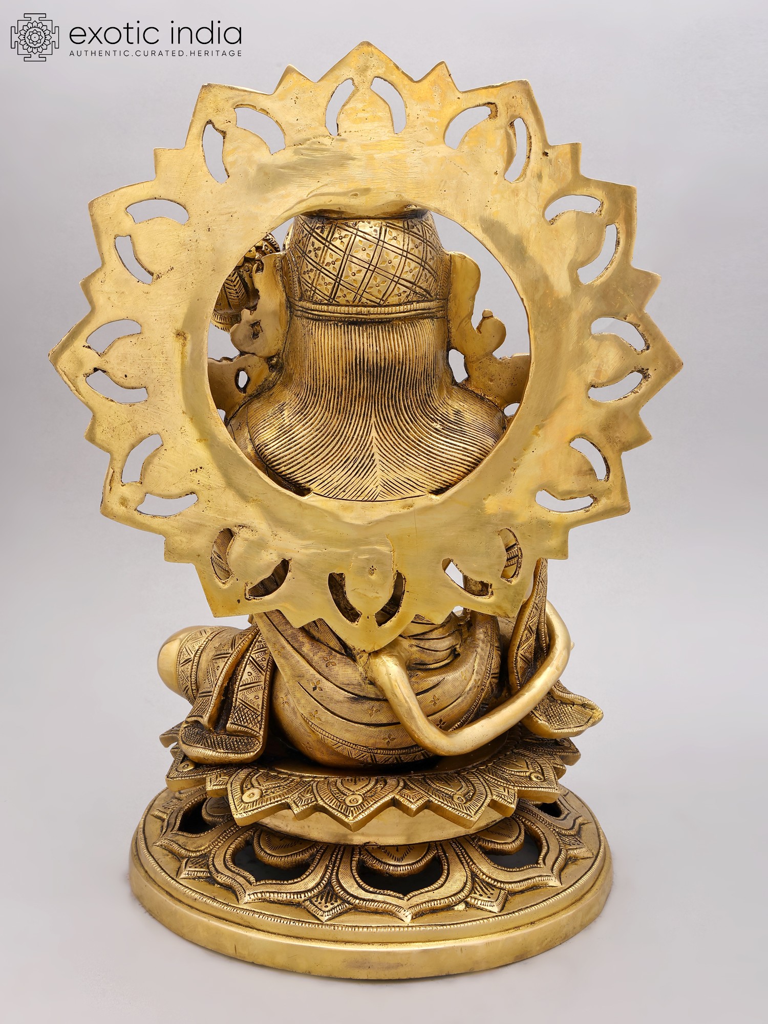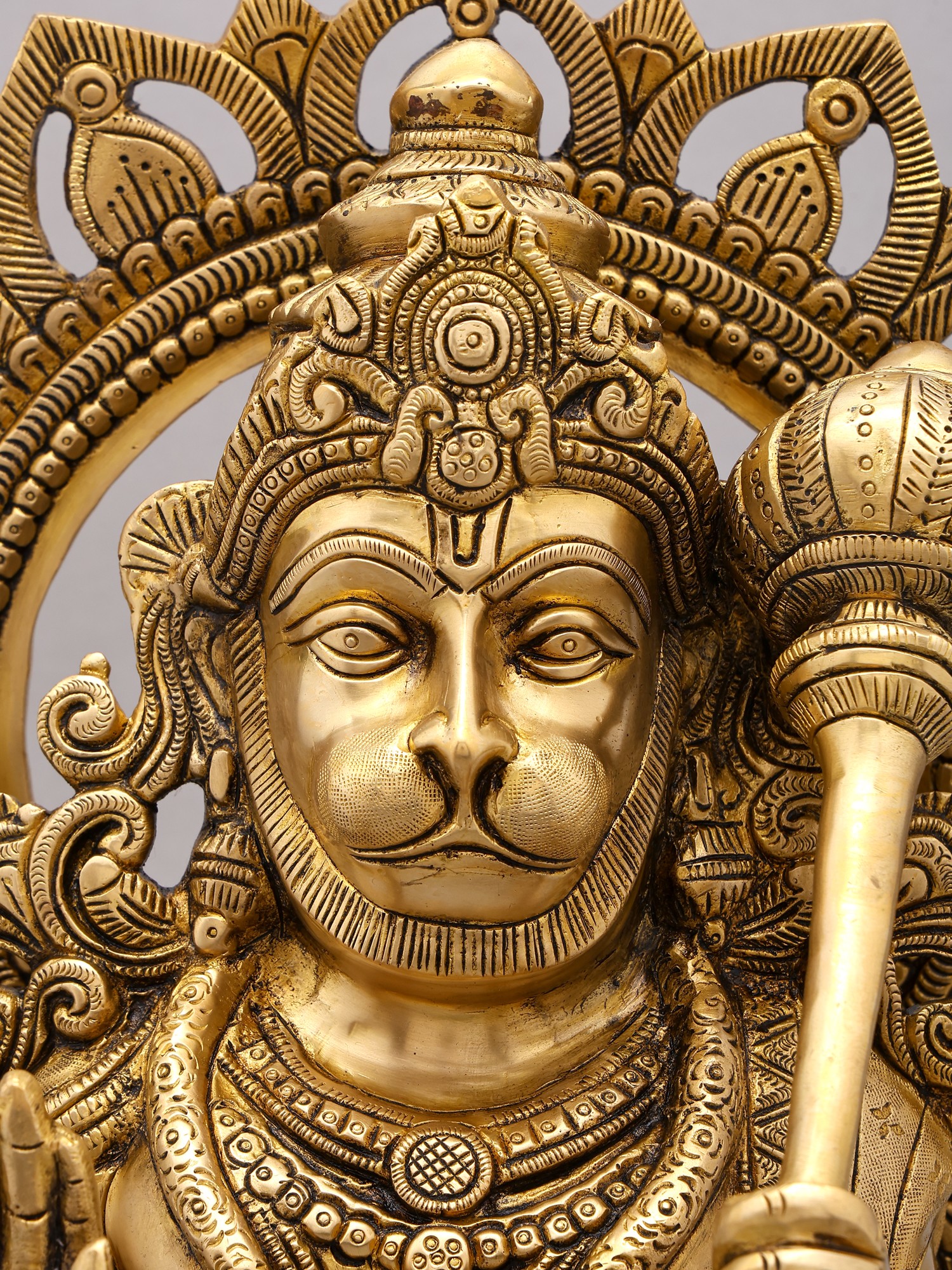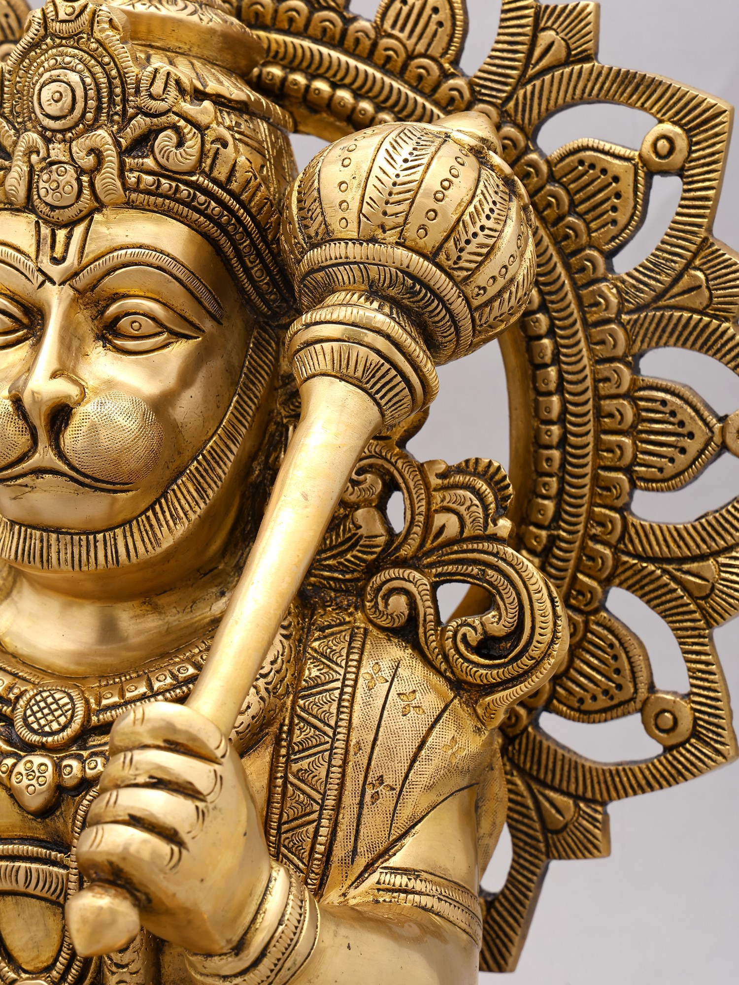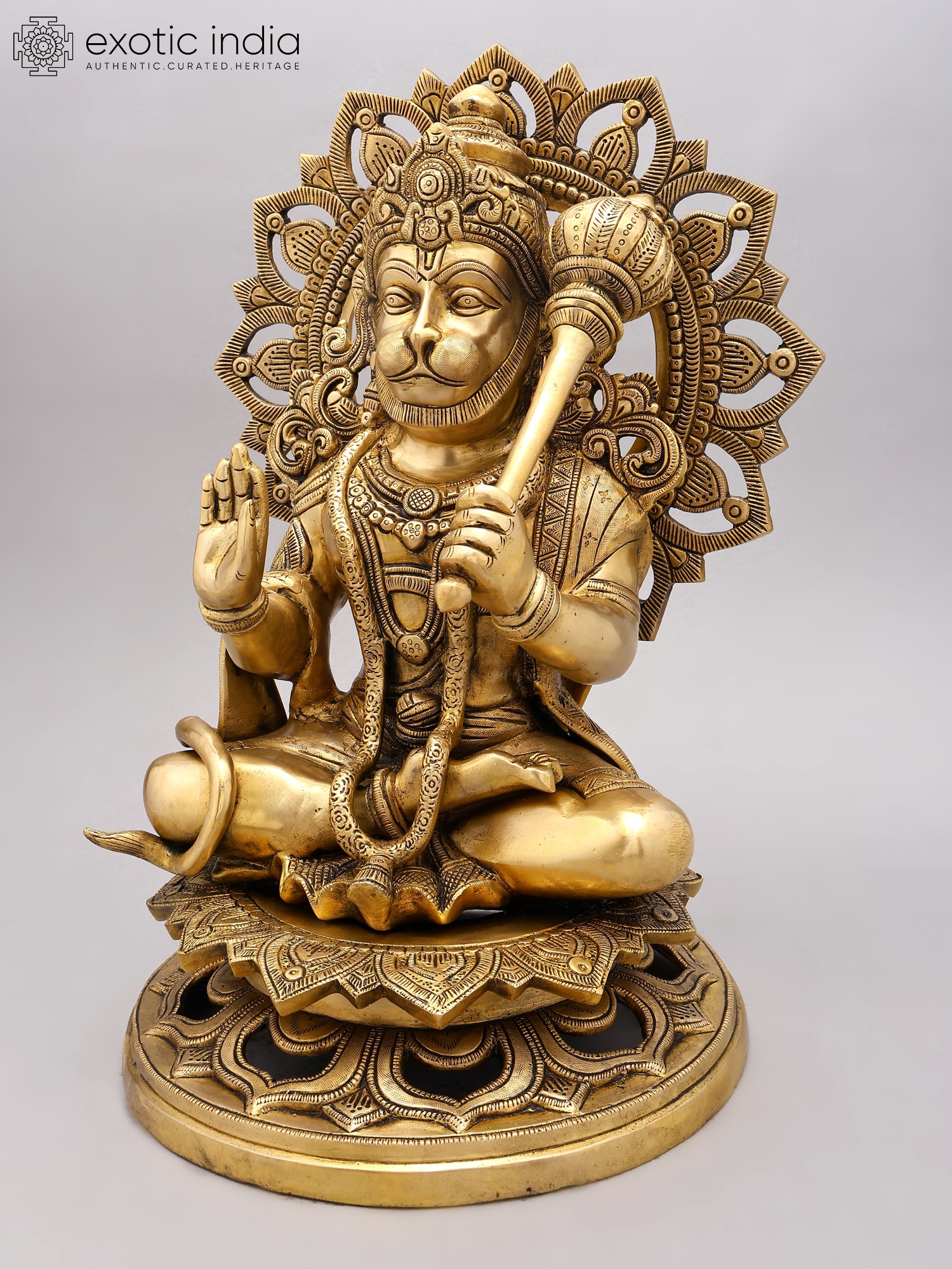 Crafted from high-quality brass, this statue is a remarkable piece of artisan skill. The intricate detailing, from Hanuman’s expressive face and powerful physique to the ornate throne and the radiant halo behind him, showcases the dedication and expertise of the artisans who created it. The meticulously crafted details are indicative of traditional craftsmanship that's been passed down through generations of artists, each adding their own unique touch to the centuries old techniques. The golden glow of the brass enhances the majesty of the statue, adding a sense of reverence and warmth to any space where it is placed. The statue's impressive size (18.0 x 12.5 x 10.8 inches) ensures its presence is commanding yet soothing.