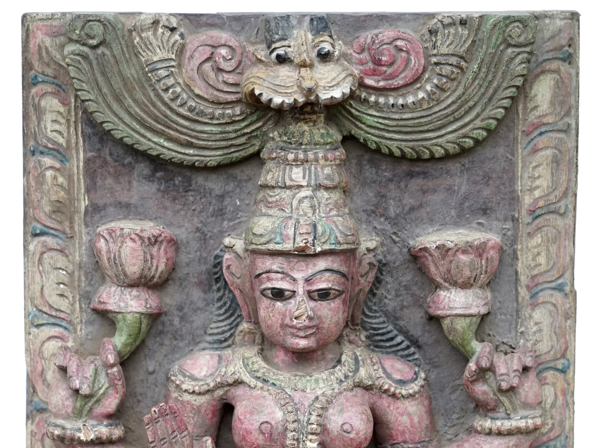 Like a piece of an ancient and sacred shrine, this wooden statue of the goddess Lakshmi emanates an antique, traditional aesthetic appeal. Surrounded by etchings of lotus petals, on a lotus pedestal, the goddess sits on a lotus throne, the omnipresent Padma (lotus born, beautiful like the flower).