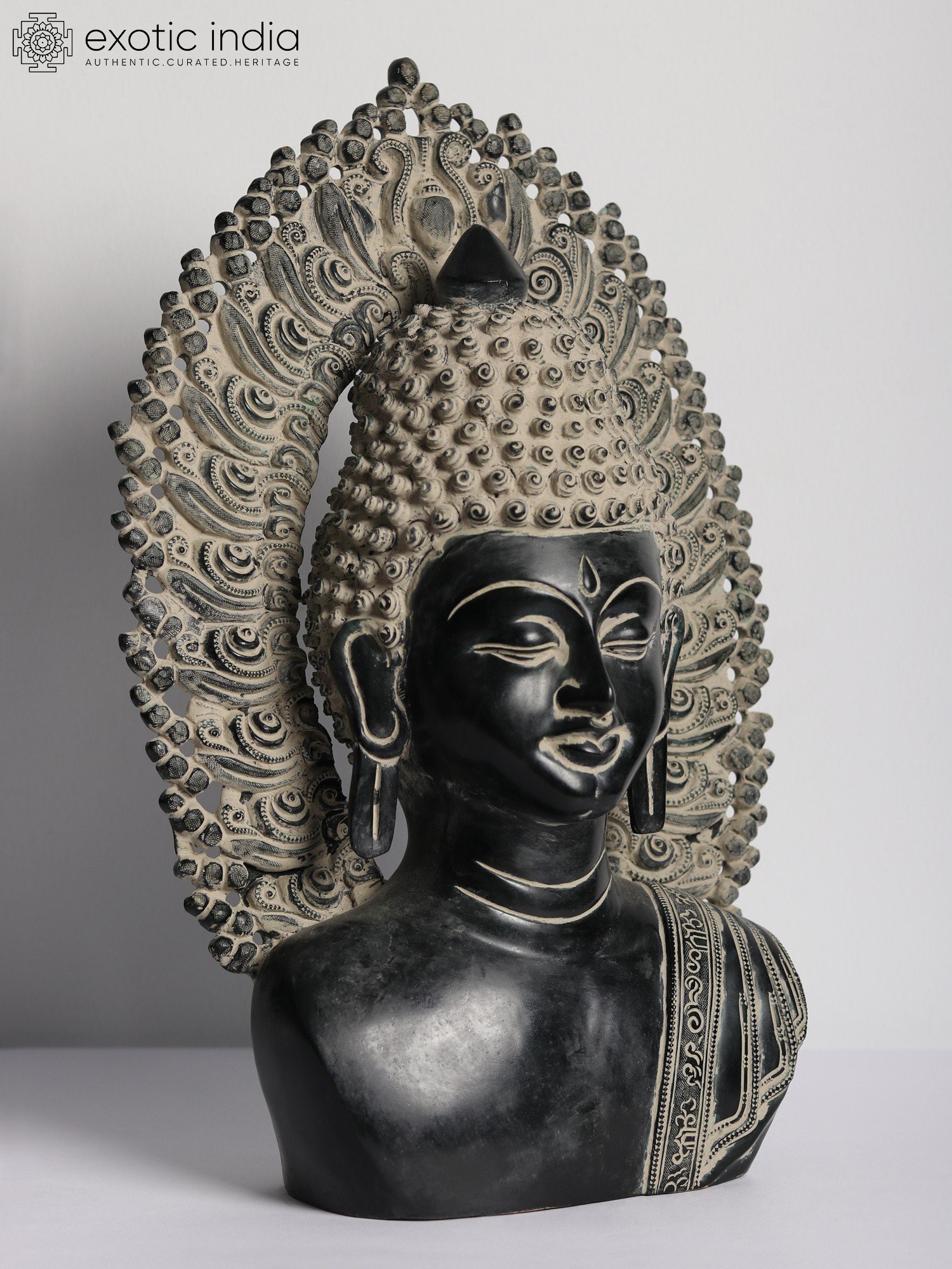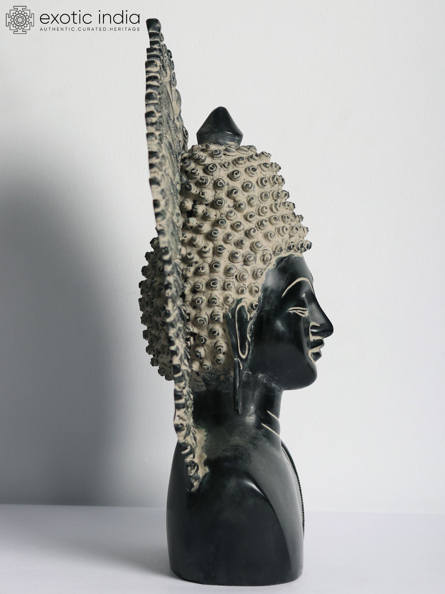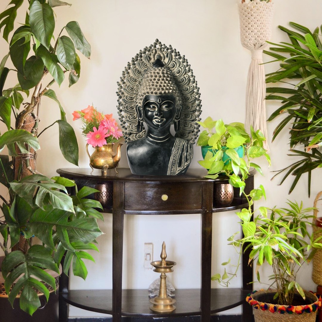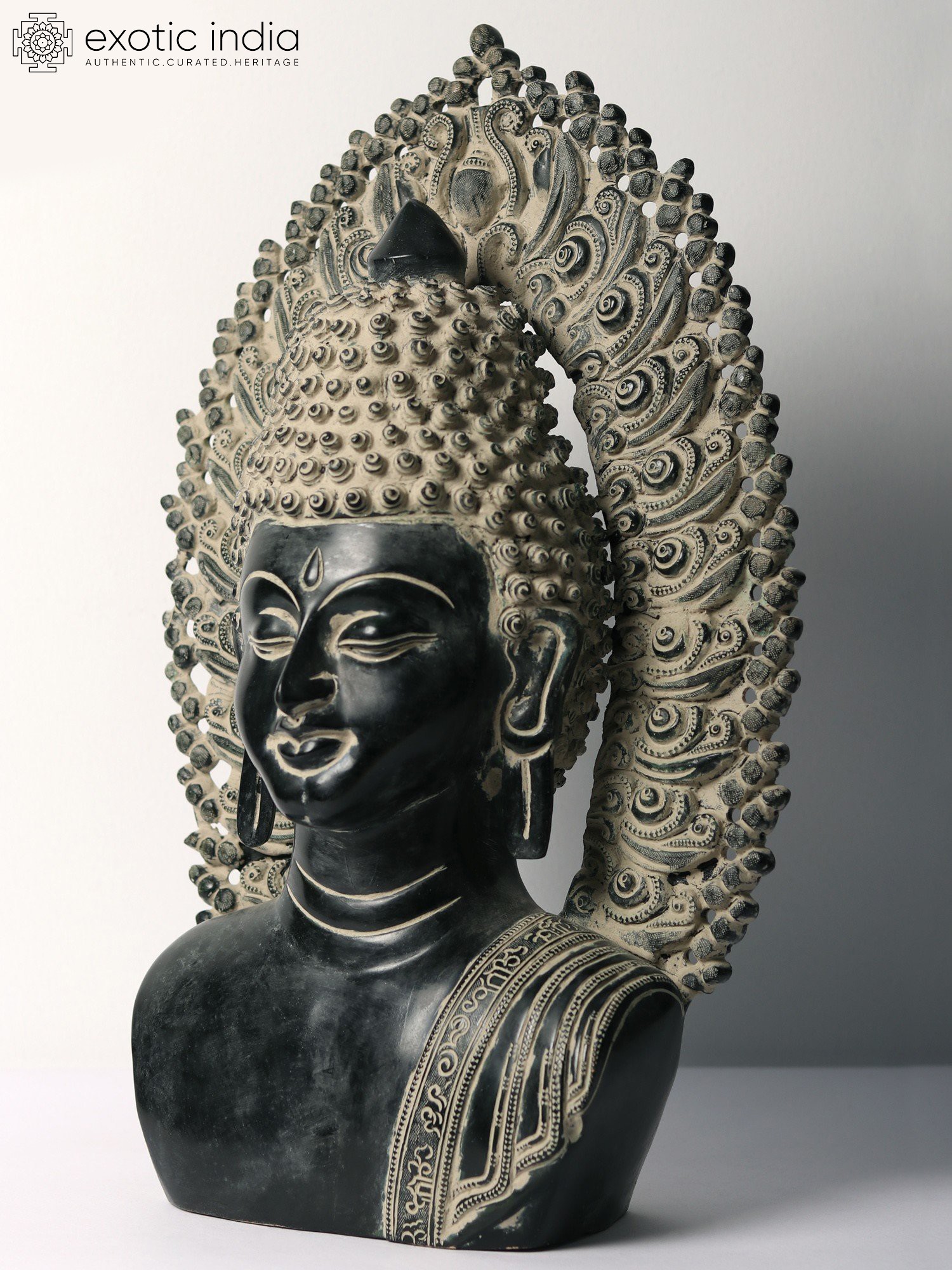 Note the aureole that frames the Buddha bust that you see on this page. It is a compact, intricately engraved number. Each panel along its elongated, gently curving frame has been carved in perfect symmetry with the other. Curvaceous coils like the mouths of numerous lotuses, freshwater foam from which they grow, and the tendrils of unassuming vines along the base. Such a Buddha bust would add to the aesthetics of the space of any devotee.