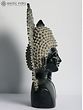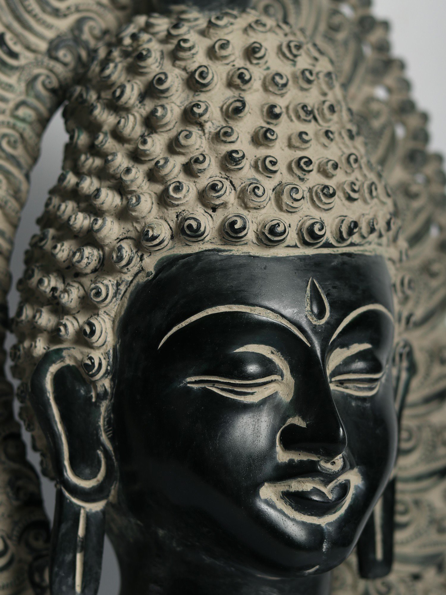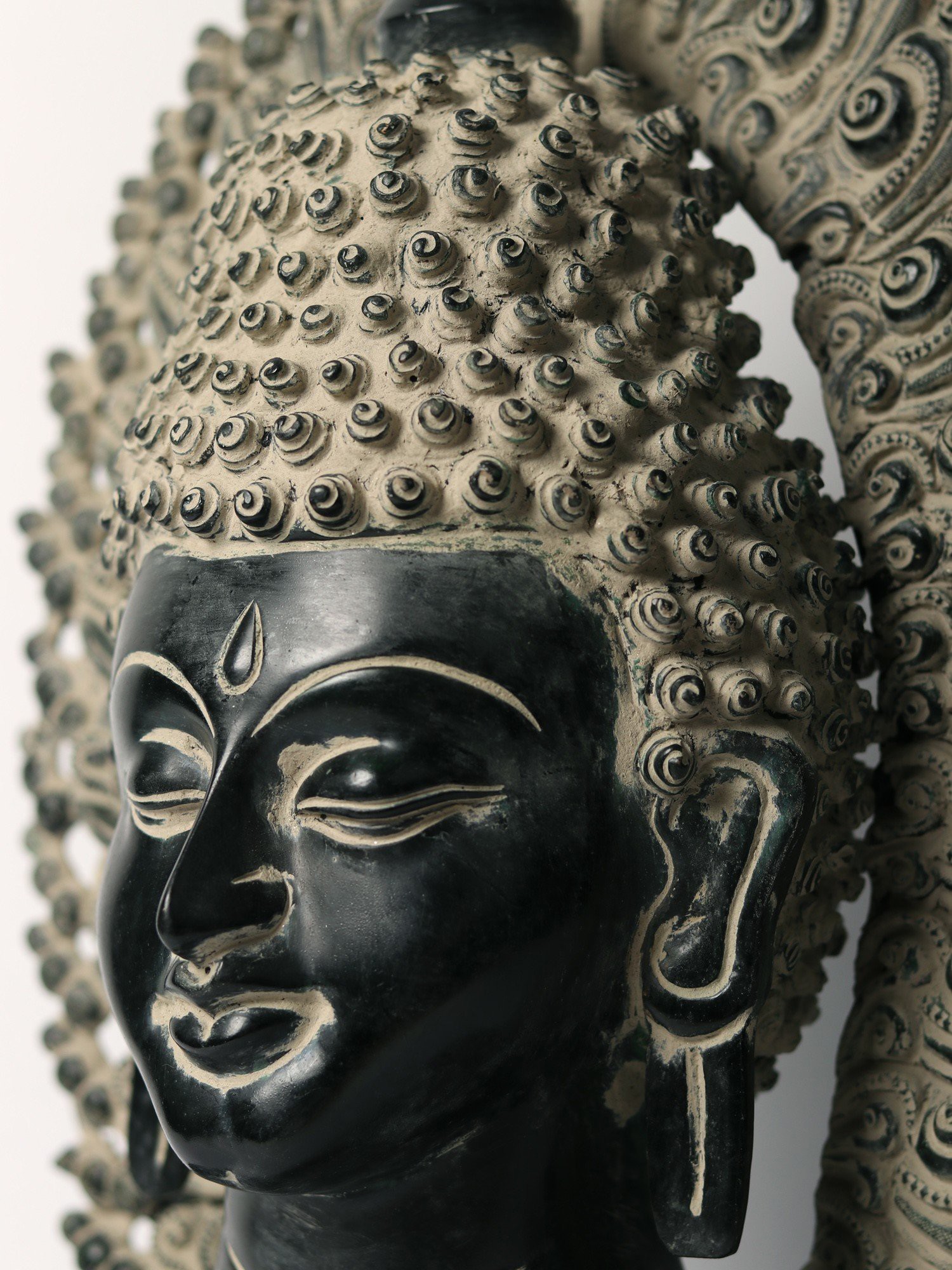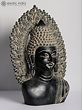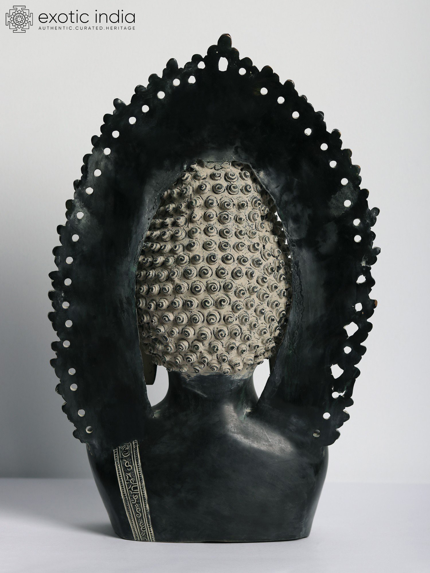 Note the aureole that frames the Buddha bust that you see on this page. It is a compact, intricately engraved number. Each panel along its elongated, gently curving frame has been carved in perfect symmetry with the other. Curvaceous coils like the mouths of numerous lotuses, freshwater foam from which they grow, and the tendrils of unassuming vines along the base. Such a Buddha bust would add to the aesthetics of the space of any devotee.