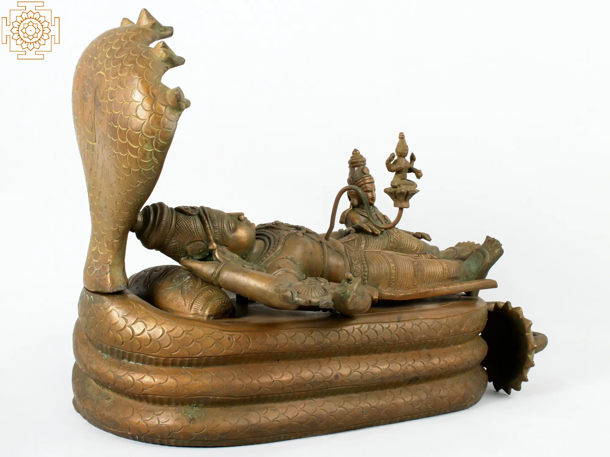 A statement Sheshashayi Vishnu composition. Perfect as home or office decor, or even as the central entity in your pooja room. Upon the thick coils of Shesha, the naga or snake, lies (‘shayi’) the divine srshtidata Vishnu. While His beauteous wife massages His feet, He dreams all of drshyam into being.