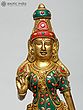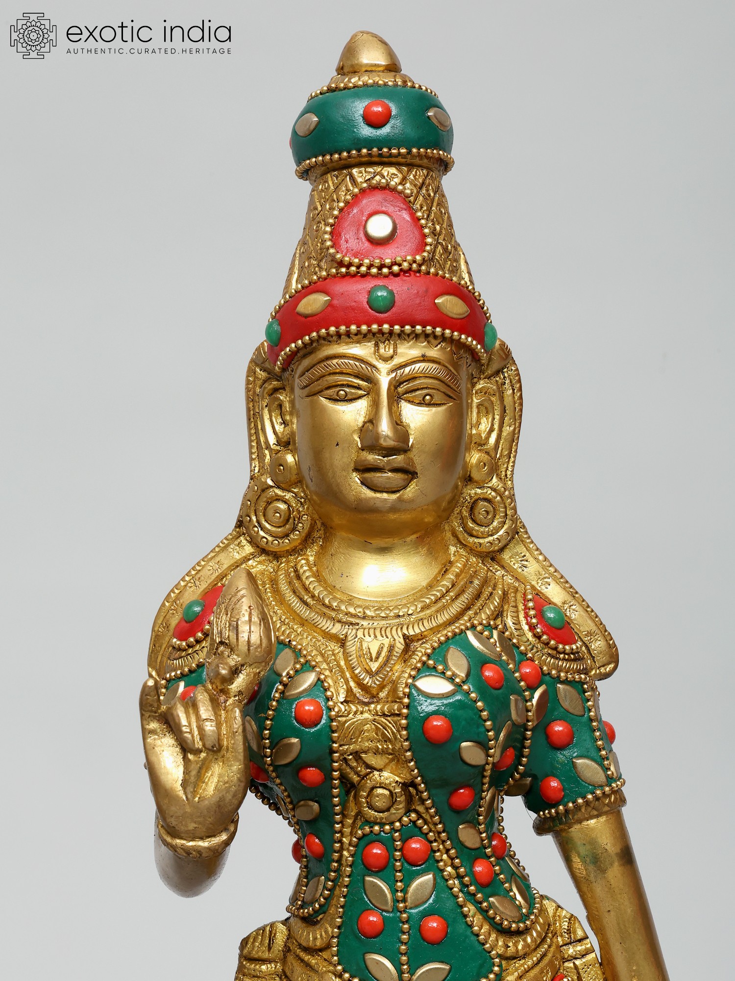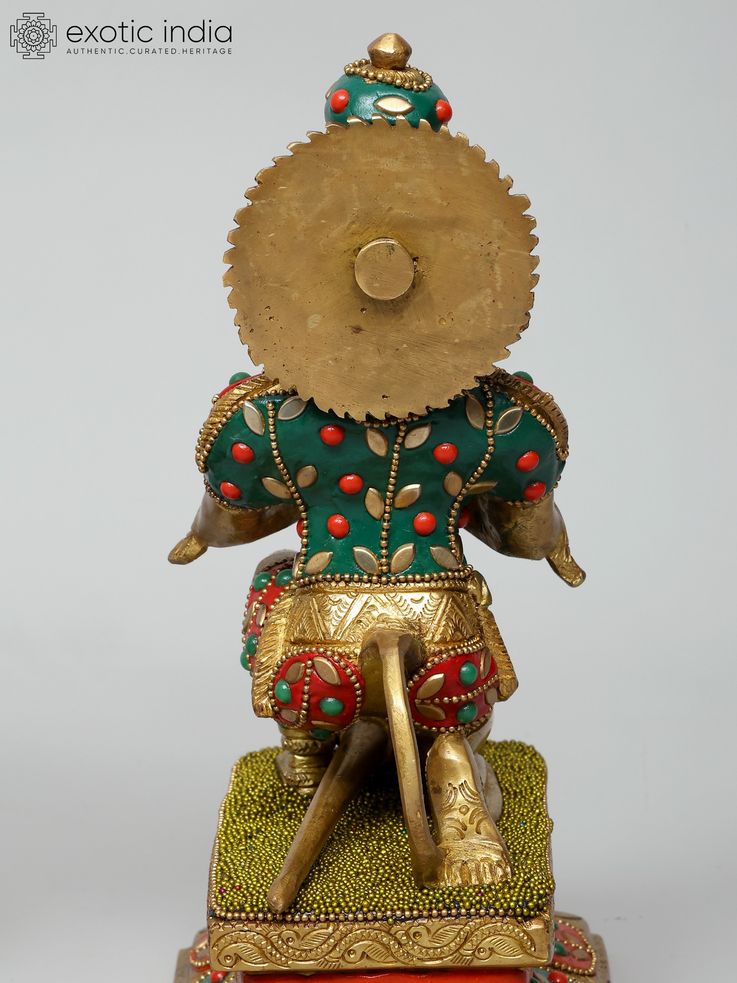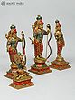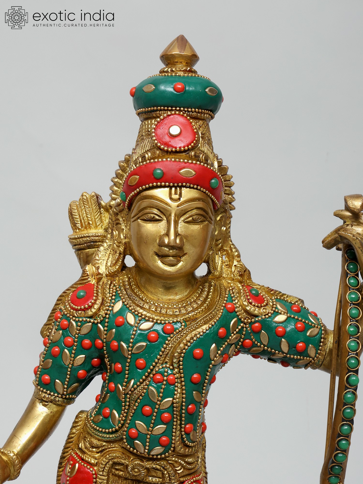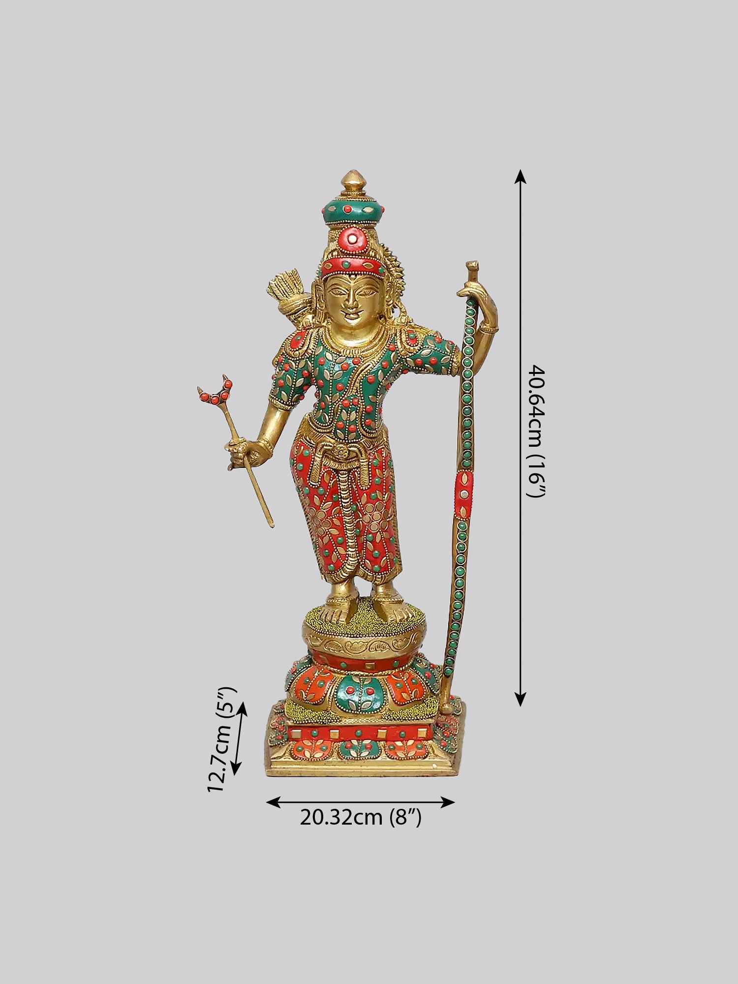 Each statue in this remarkable set is cast in brass and adorned with delicate inlay work. The figures showcase an artistic embellishment, adding depth and radiance to the pieces. The skilled artisans have captured the serene expressions and regal bearing of each deity, bringing the characters of the Ramayana to life. The golden hue of the brass serves as a fitting canvas for the vibrant inlay, creating a visual spectacle that is both captivating and spiritually uplifting. The ornate bases supporting each figure echo the intricate design of their robes and adornments, completing the artistic vision with thoughtful detail.