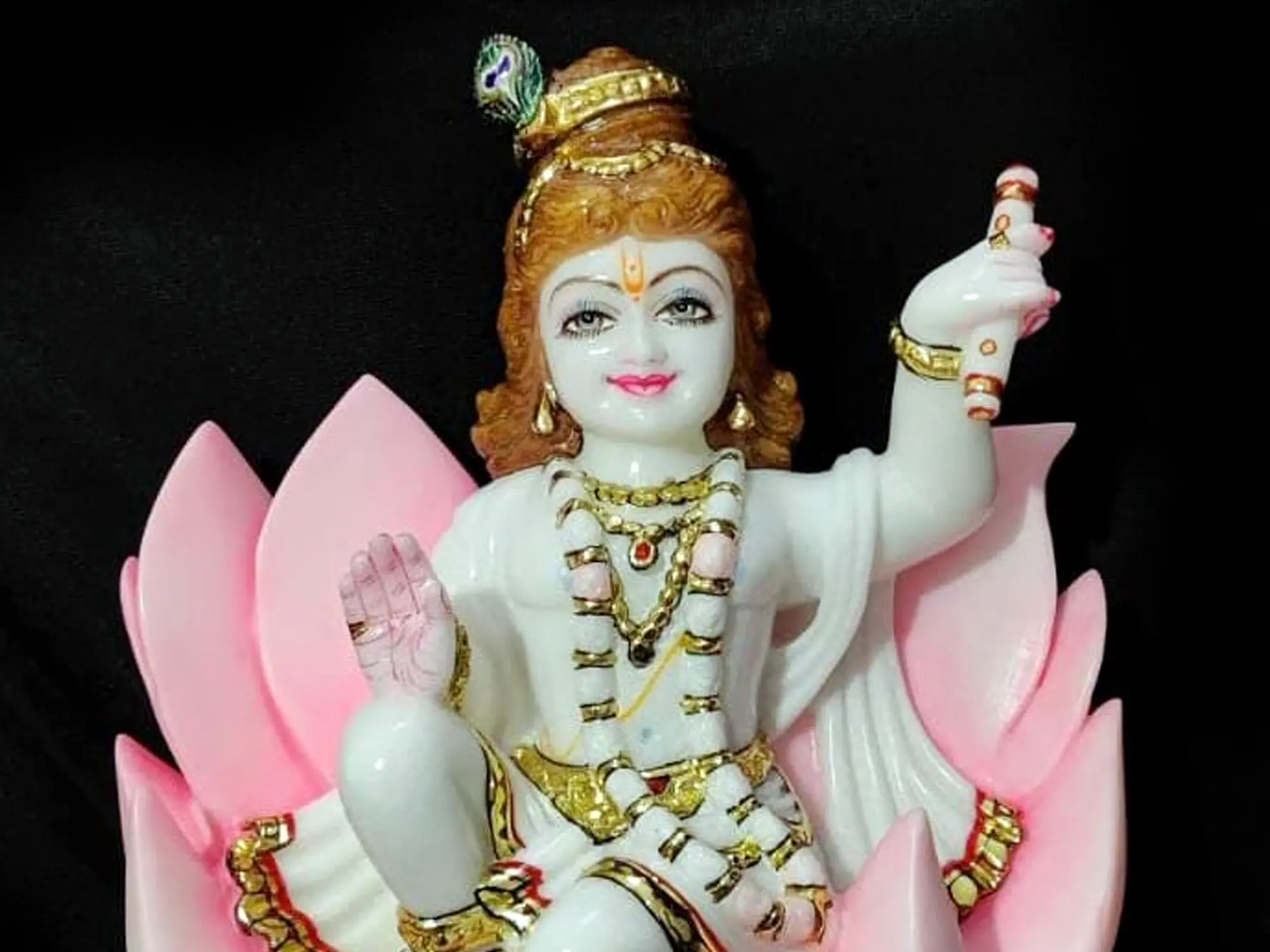 Gaze upon this exquisite representation of Lord Krishna in his youthful, playful form, known as Bal Gopal. This captivating statue captures the divine charm and innocent mischief that defines the beloved deity. Crafted from the finest Vietnam marble, renowned for its purity and luminous quality, this piece exudes an aura of serenity and spiritual grandeur. The marble's smooth, cool surface is a testament to the skilled hands that sculpted it, imbuing it with life and reverence. The posture of Bal Gopal is one of relaxed grace, seated upon a beautifully rendered lotus flower. The lotus, a symbol of purity, enlightenment, and rebirth in many Eastern traditions, here serves as a divine throne for the Lord. Its delicate, layered petals in soft pink hues create a visual feast, contrasting with the pristine white of the marble. Bal Gopal's features are finely chiseled, his eyes sparkling with divine consciousness and a hint of childlike curiosity. He is adorned with intricately carved jewelry, including necklaces and armbands, all finished with touches of gold that glint under the light, reflecting his royal lineage as the prince of the Yadava clan. This particular depiction of Bal Gopal resonates with the stories from the Puranas, where the infant Krishna displayed miraculous powers and captivated the hearts of all those in Gokul and Vrindavan. Tales abound of his playful pilfering of butter, his cosmic giggles that shook the heavens, and his divine protection over his devotees. The peacock feather adorning his hair is a signature element, symbolizing divine beauty, wisdom, and the infinite. The way his hands are positioned, one gently resting and the other raised, suggests a blessing or a moment of divine interaction, inviting devotion and peace into your sacred space.