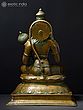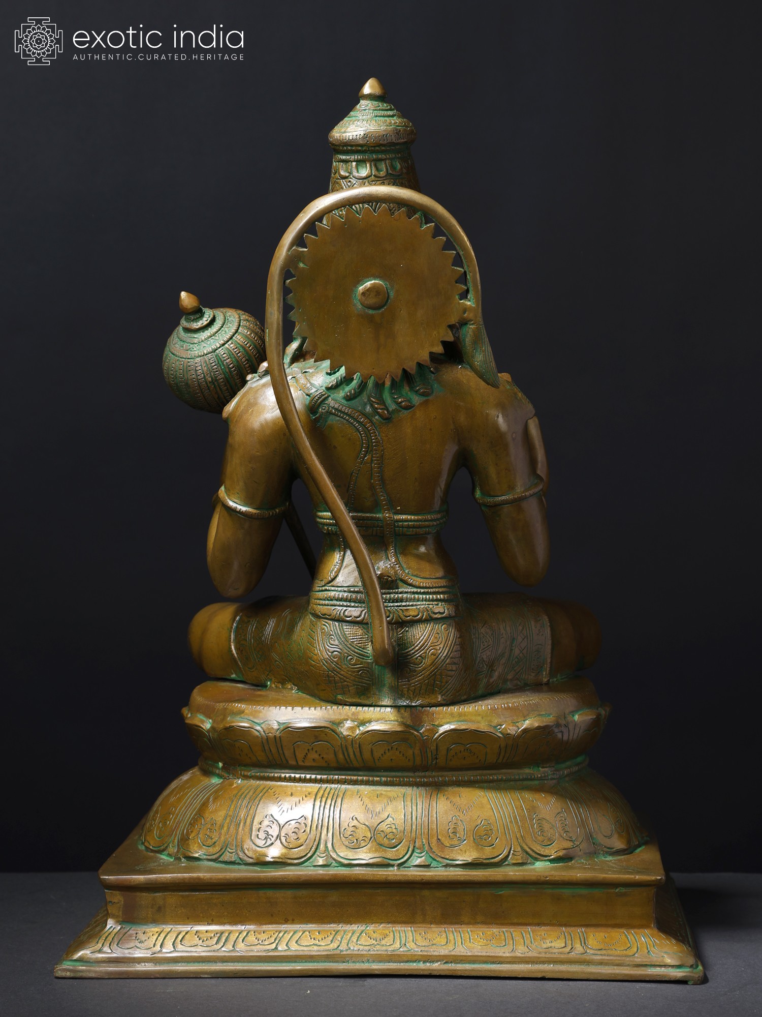 This exquisite 18-inch brass statue depicts Lord Hanuman in a serene seated posture, bestowing his blessings. Hanuman, the devoted devotee of Lord Rama, is a central figure in the epic Ramayana, embodying strength, loyalty, and unwavering devotion. This statue captures his essence perfectly, inviting a sense of tranquility and spiritual connection. The intricate details and the rich patina of the brass create a piece that is both visually stunning and deeply meaningful. The calm expression on his face reflects his profound wisdom and unwavering faith. The *abhaya mudra* (gesture of reassurance) displayed in one hand reassures devotees, signifying protection and fearlessness. His other hand holds the *gada* (mace), a symbol of his immense power, further enhancing the spiritual significance of this captivating piece.