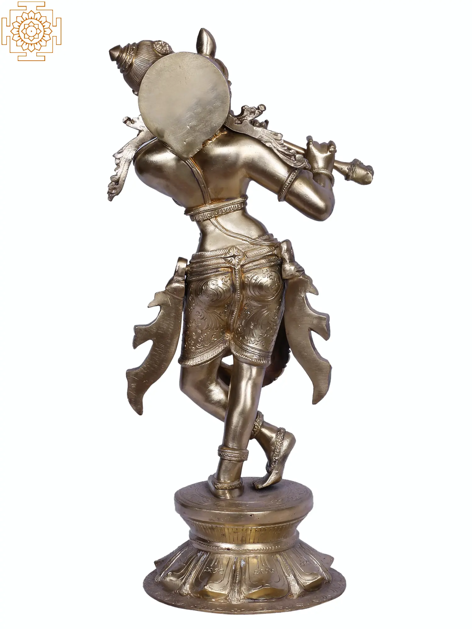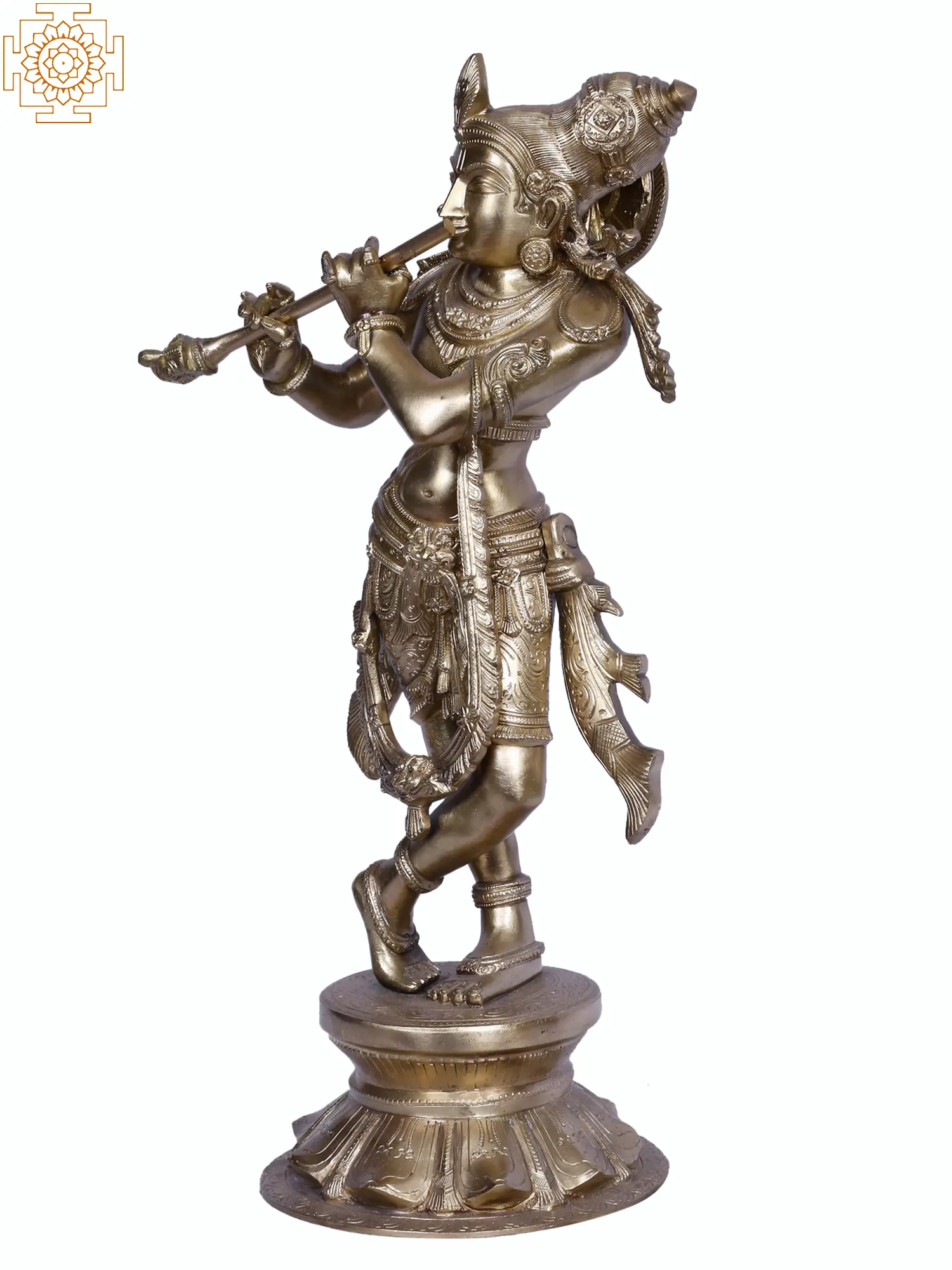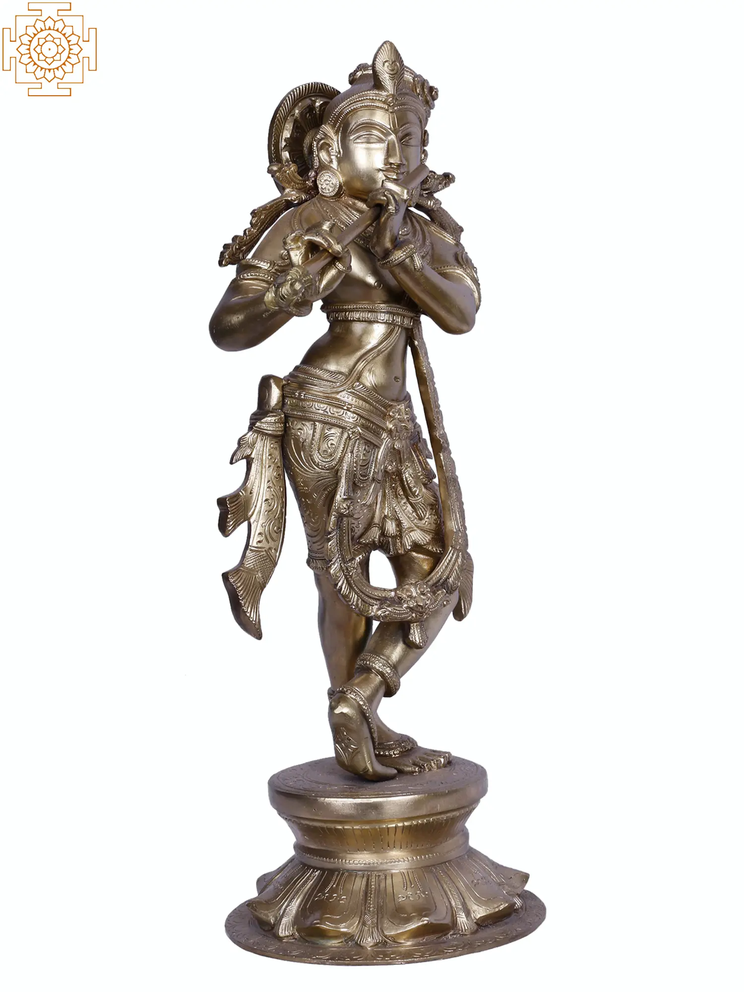 A classical Lord Krishna statue. Sculpted from pure bronze, executed in mesmerising detail. The handsomest, most irresistible cowherd youth of the Vrindavan of Dvaparayuga. In the tribhanga stance stands the muralidhara, the body of the one possessed of (‘dhara’) the flute (‘murali’) jutting out (‘bhanga’) laterally at three (‘tri’) different junctures.