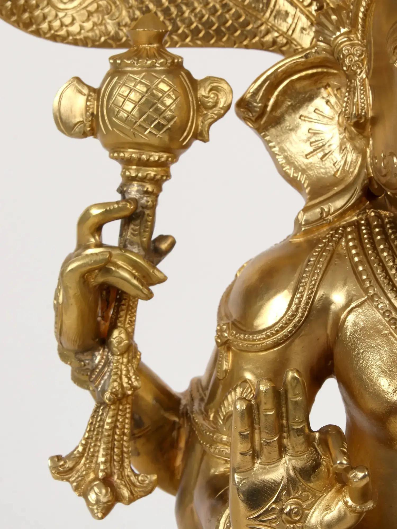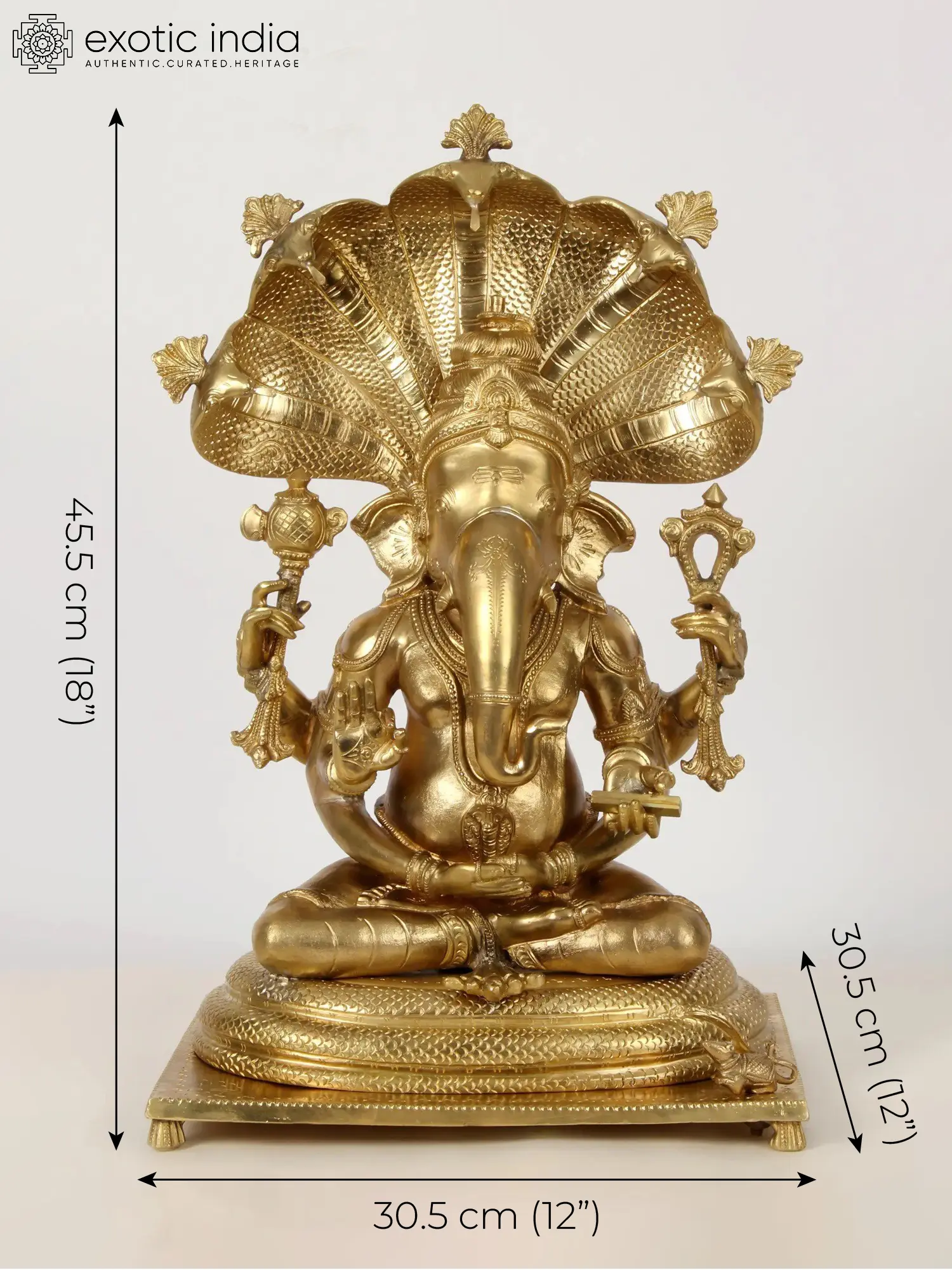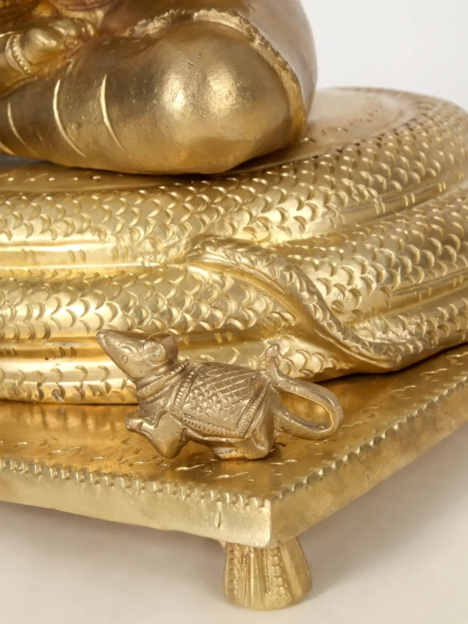 Beneath the seated figure are gathered the coils of Sheshanaga. The five-hooded serpent, who is a staple of the original Vishnu iconography, bares its multitudinous fangs above Ganesha’s crown. One may zoom in on and appreciate the dense, lifelike serrations on the underbellies.