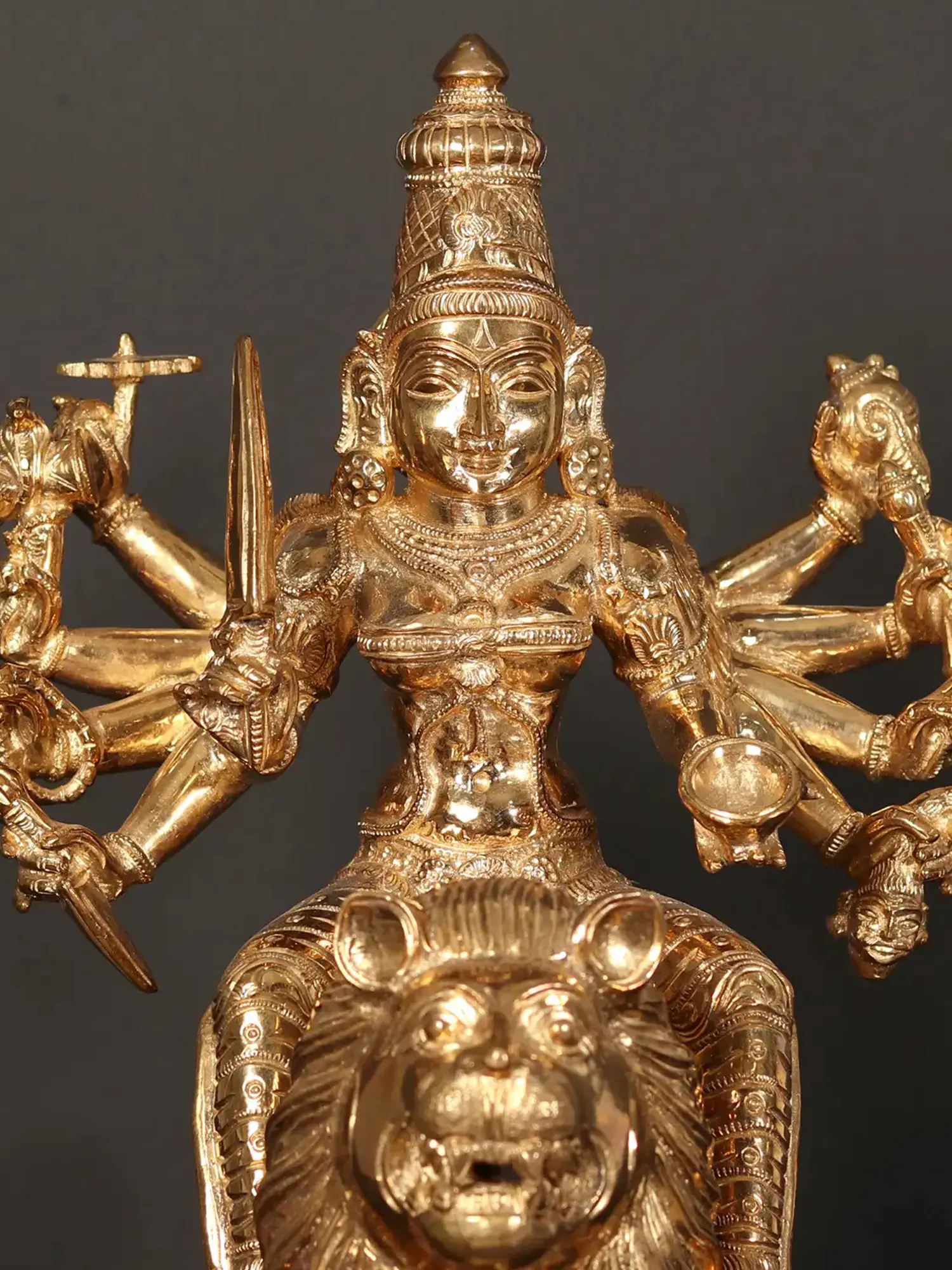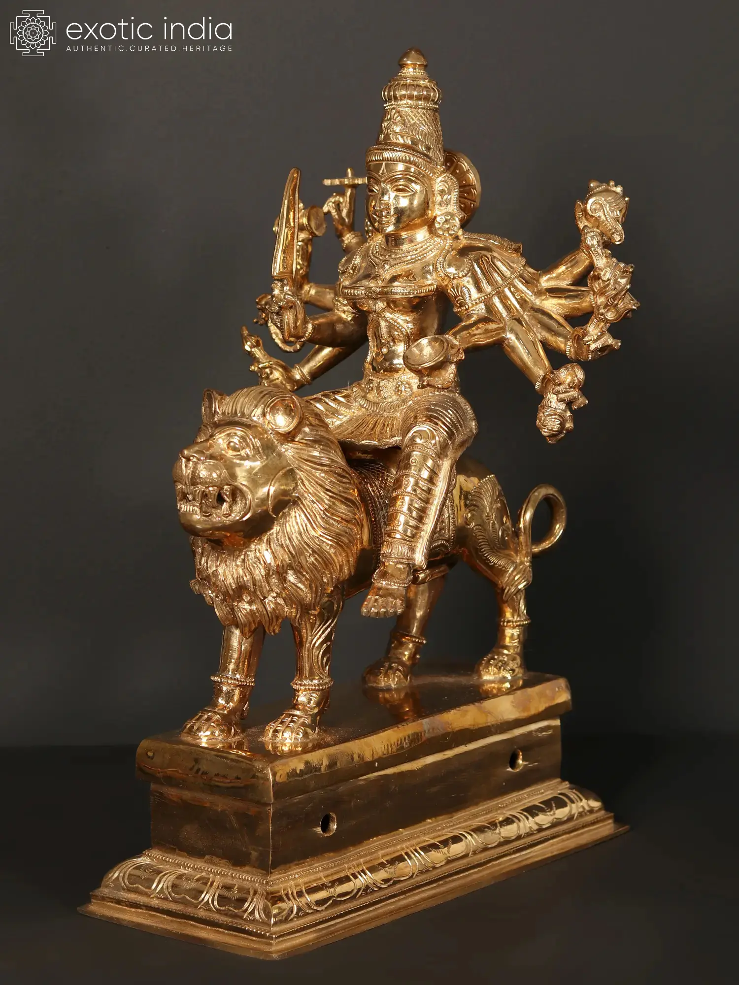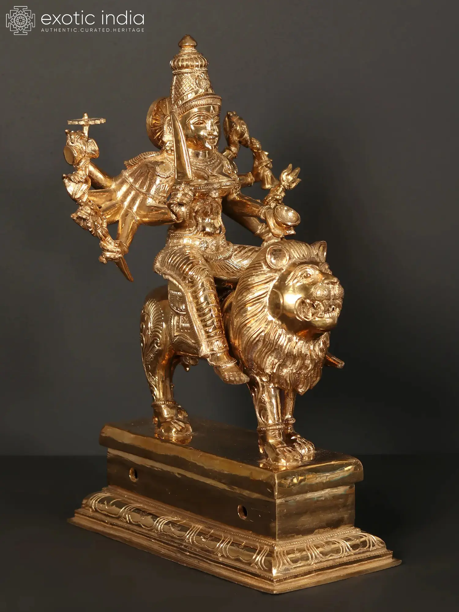 Immerse yourself in the divine aura of our Ten-Armed Goddess Durga, showcasing Mahishasur Mardini seated majestically on a lion. This intricately crafted bronze masterpiece is more than a work of art; it is a profound representation of strength, courage, and divine feminine power. Each of the ten arms holds symbolic attributes, symbolising the goddess's multifaceted nature. As you gaze upon Devi, let the symbolism of the lion and the ten arms evoke a sense of awe and reverence. Place it in your sacred space to invoke the protective and empowering energy of Goddess Durga, creating an atmosphere of strength and spiritual fortitude.
