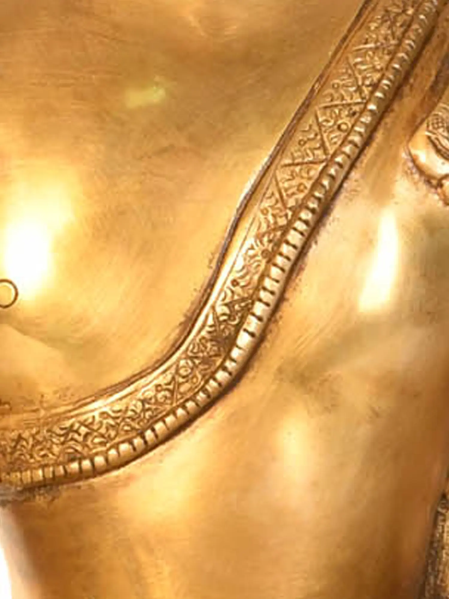 This magnificent brass statue captures the serene and profound moment of the Buddha's enlightenment, depicted in the powerful Bhumisparsha Mudra. Also known as the "Earth-Touching" or "Earth-Witness" gesture, this mudra is deeply symbolic within Buddhist tradition. It represents the Buddha's victory over the temptations and distractions of Mara, the demon king, who sought to prevent him from achieving Buddhahood. As Mara unleashed his armies and illusions, Siddhartha Gautama remained steadfast, finally touching the earth with his right hand, calling upon the Earth itself as his witness to his enlightenment and his right to attain the highest state of being. This act signifies the ultimate grounding of truth and the unwavering determination of the enlightened mind.