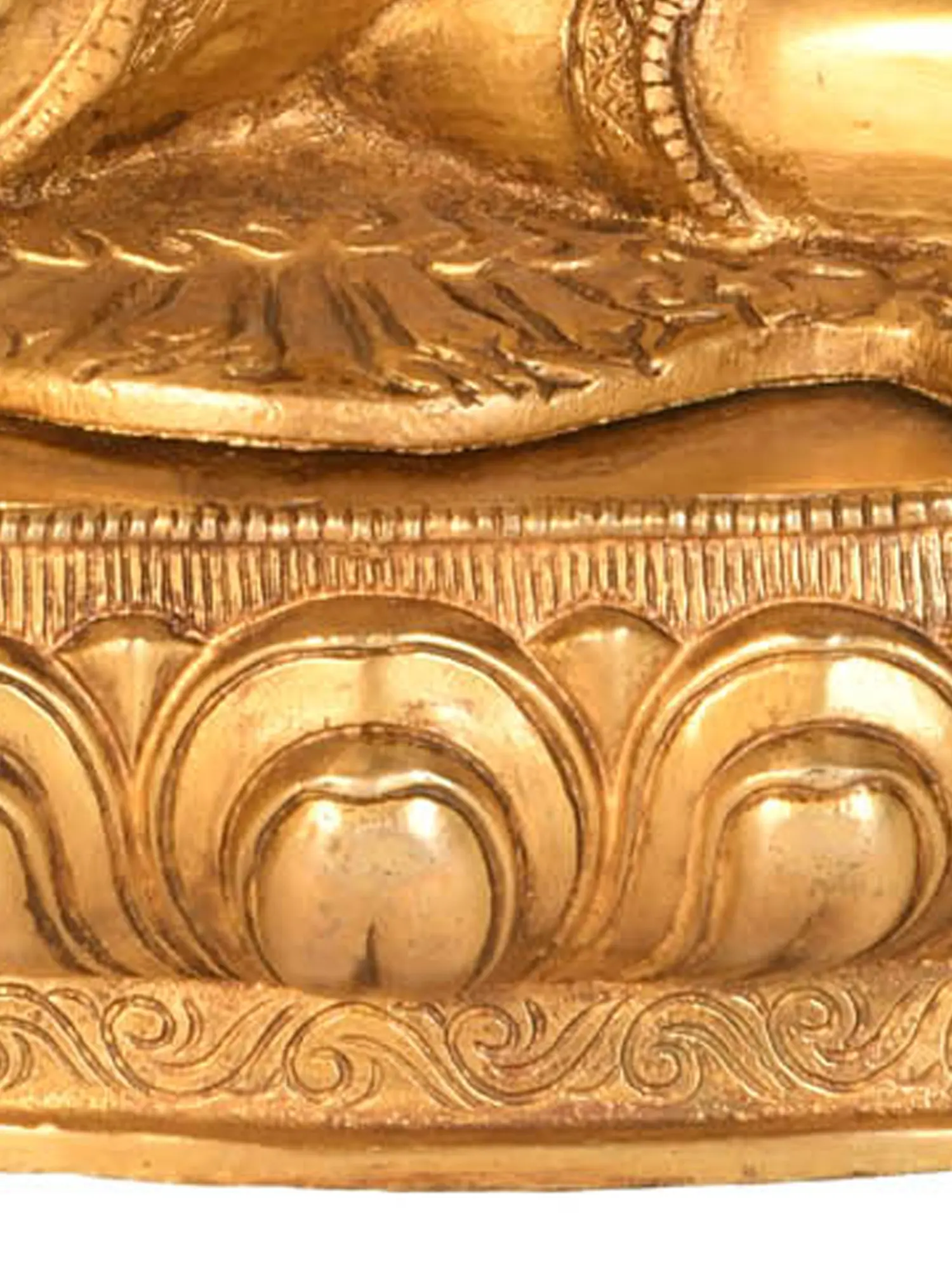 Each detail of this exquisite statue is a testament to the skill of Indian artisans. Cast in lustrous brass, the sculpture radiates a warm, golden glow, imbued with the sanctity of traditional craftsmanship passed down through generations. The serene countenance of the Buddha, with half-closed eyes in deep meditation, conveys an aura of profound peace and wisdom. The intricate detailing of his monastic robes, adorned with delicate patterns, speaks to the rich aesthetic traditions of Tibetan Buddhism. The posture, seated in the lotus position, further signifies his elevated spiritual state, while the gentle curvature of his form suggests a dynamic yet calm presence.