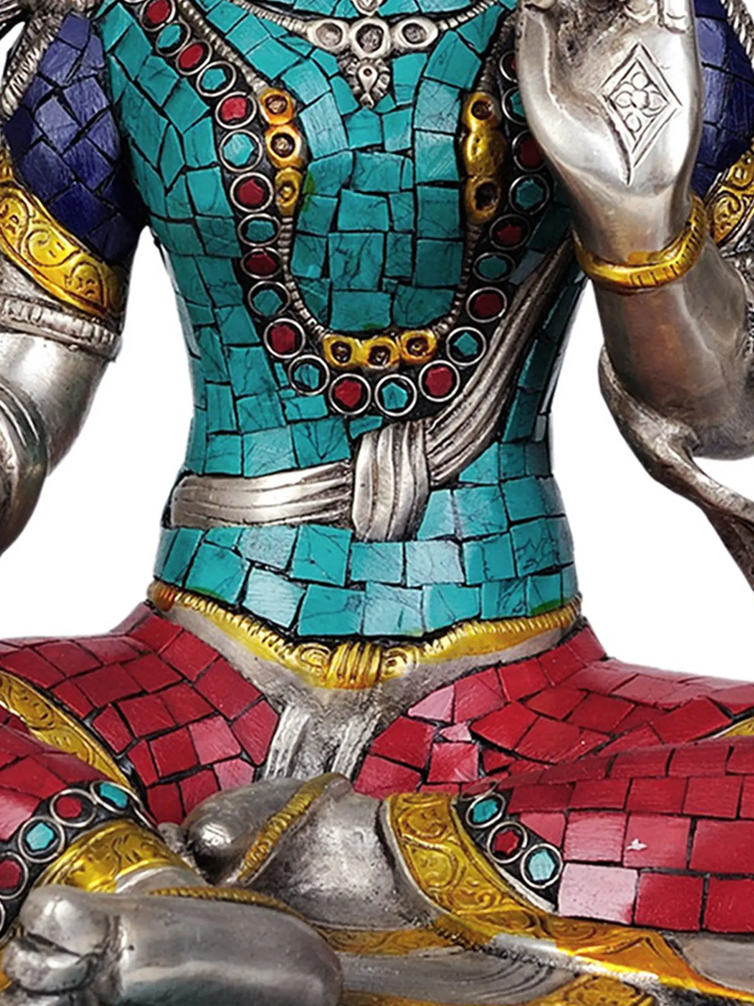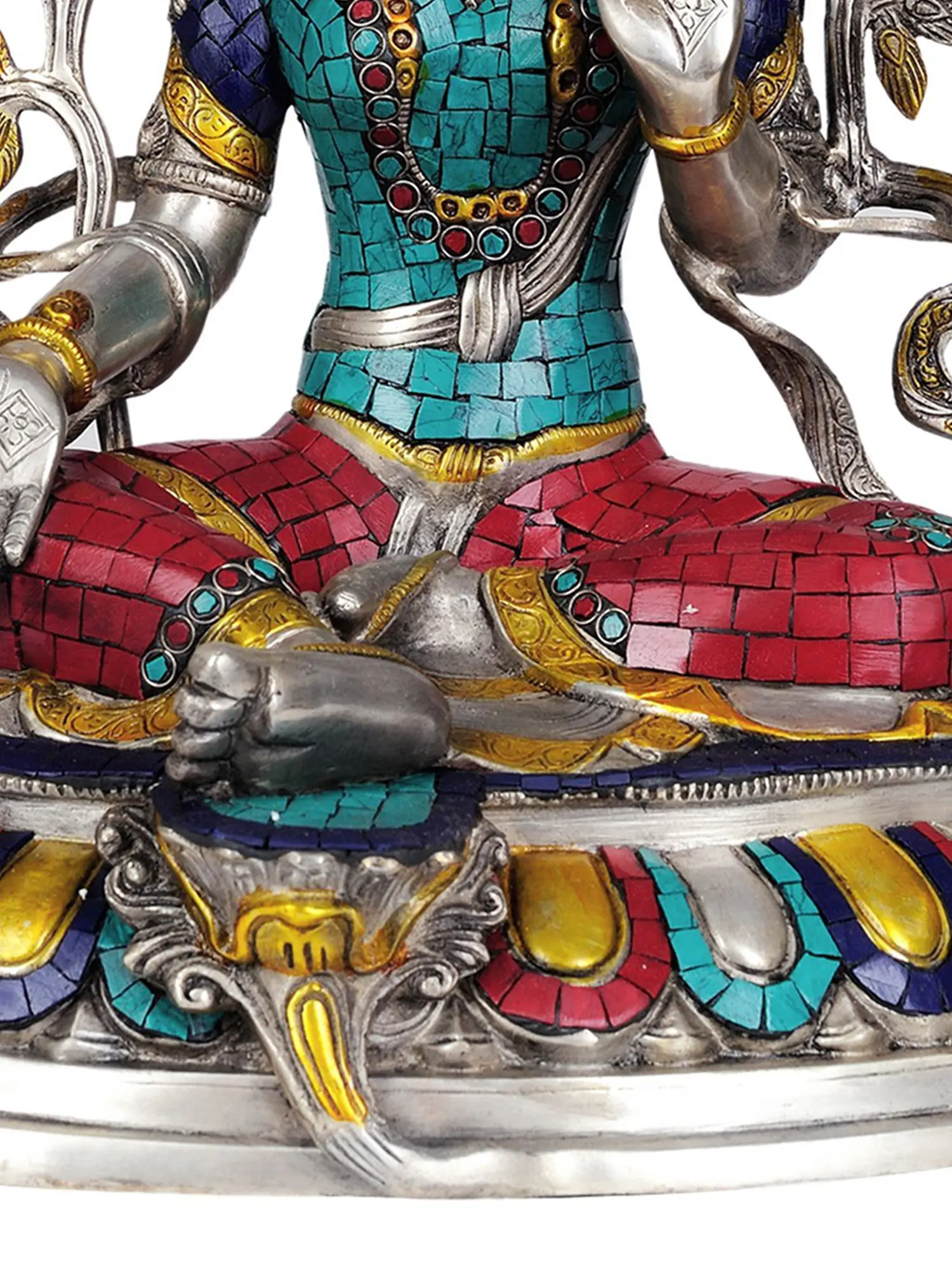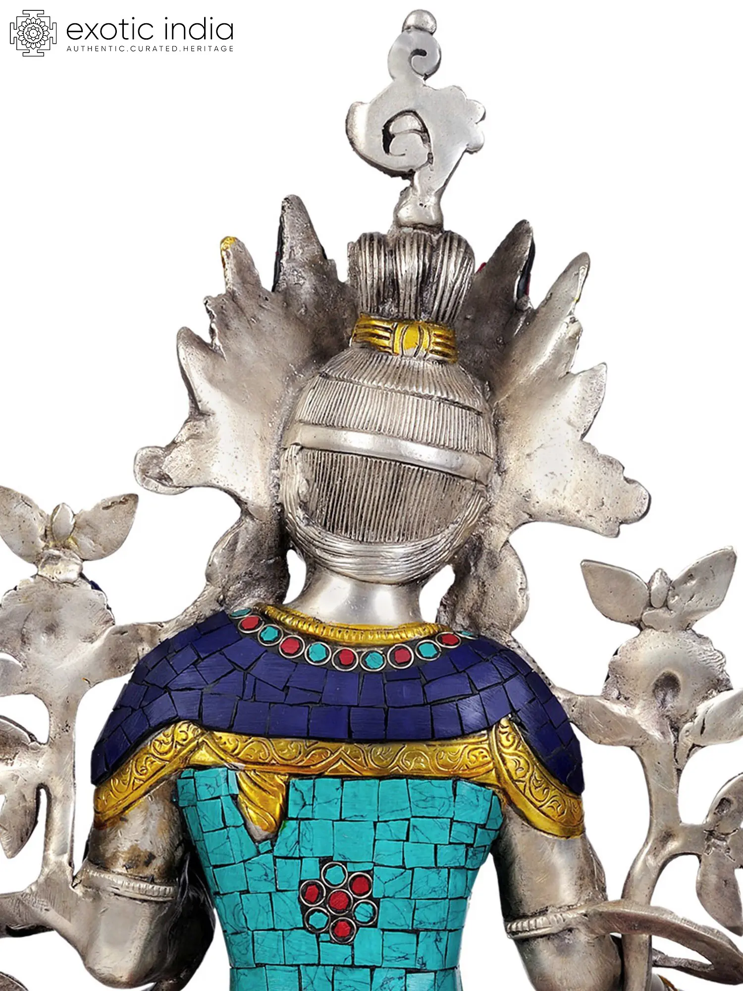 This stunning sculpture showcases a level of artistry that elevates it beyond a mere decorative object. The statue is meticulously crafted in brass. The silver hue gives it an elegant appearance. The inlaid work further enhances the statue's visual appeal. The craftsmanship reflects the rich artistic traditions of the Tibetan culture. Every piece of inlay has been carefully placed. The various elements come together seamlessly. This blend of materials and techniques creates a captivating interplay of textures and colors. The result is a visual representation of spiritual beauty. This makes it a treasured addition to any collection. Whether displayed in a personal meditation space or as a focal point in a living room, this piece is sure to inspire contemplation and admiration.