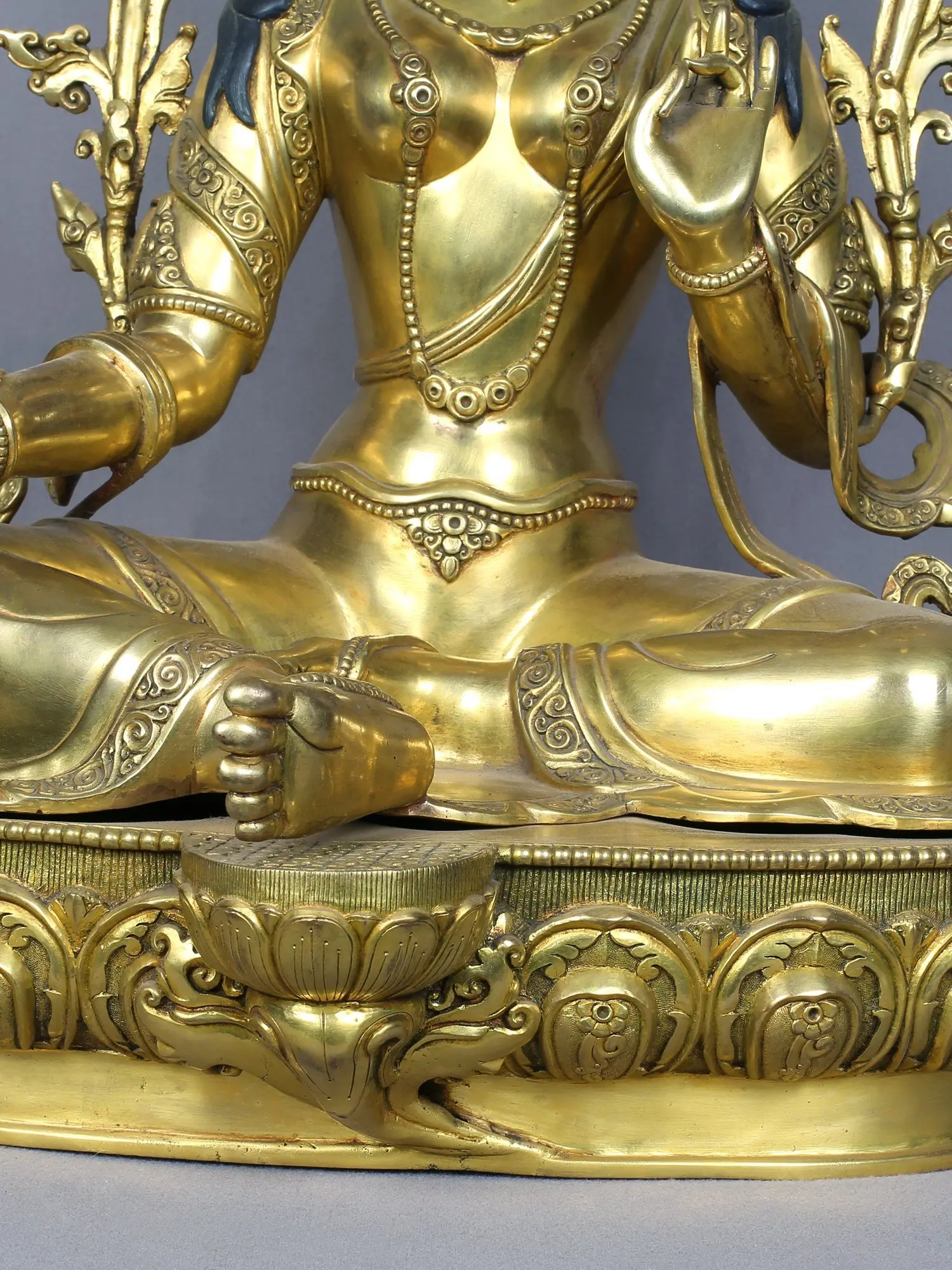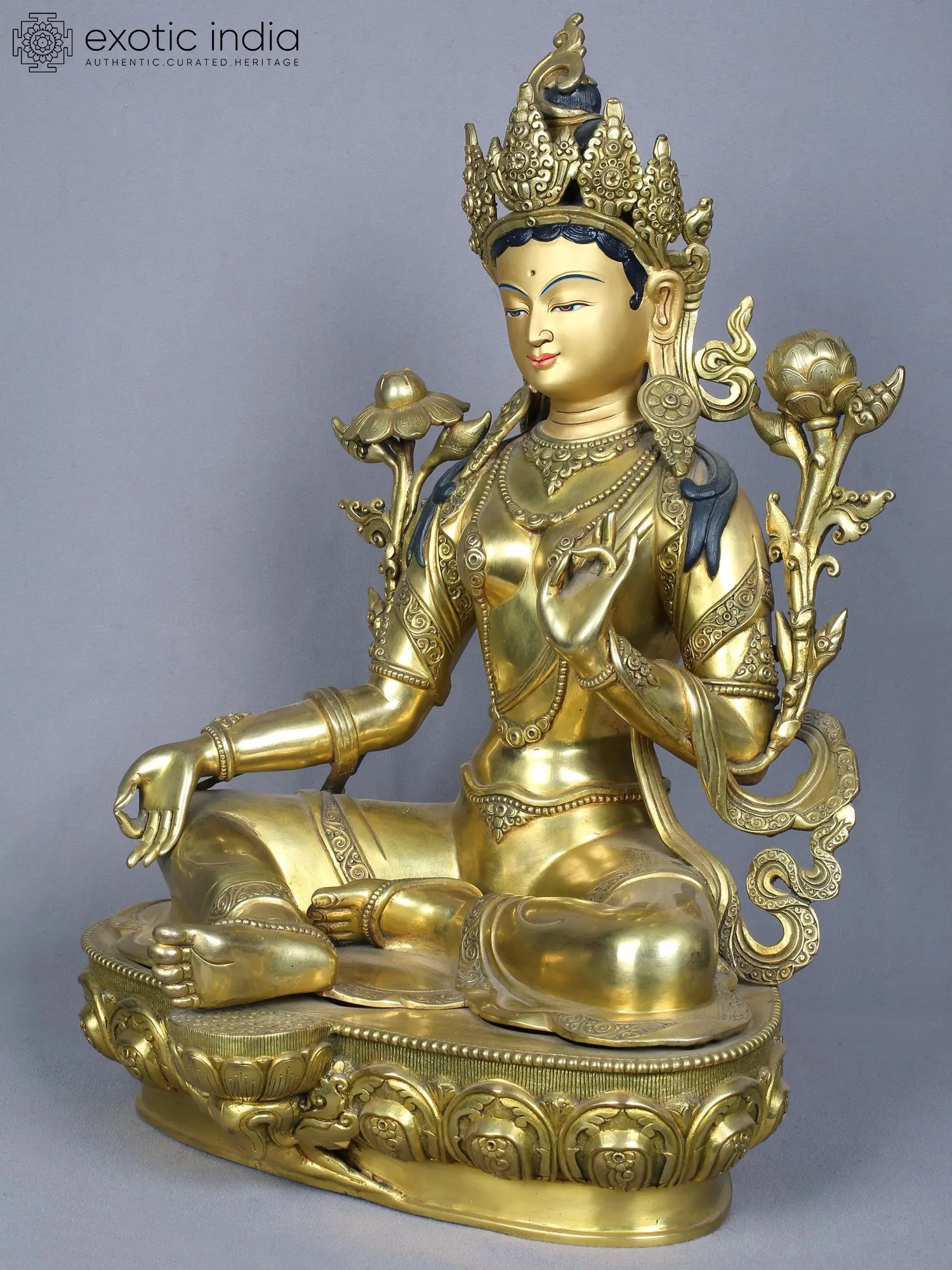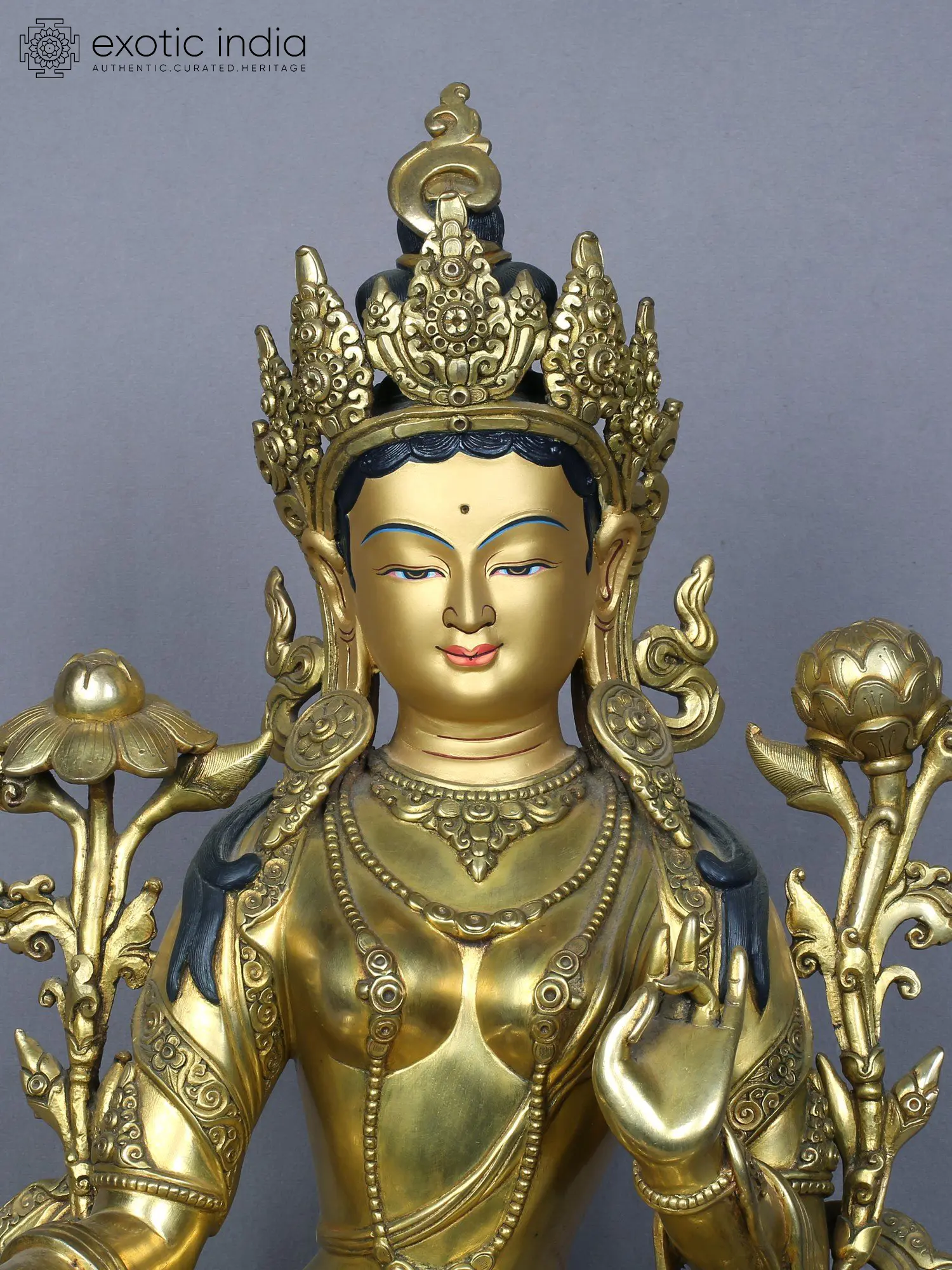 With her lotus-adorned hands poised in graceful gestures, she beckons seekers to embark on a journey of transformation and liberation. As the embodiment of compassionate action, Green Tara's presence inspires courage and offers solace to all who seek refuge in her benevolent embrace. In the sacred realm of devotion and aspiration, Green Tara shines as a beacon of hope, guiding souls toward the shores of enlightenment with unwavering compassion and unwavering grace.
