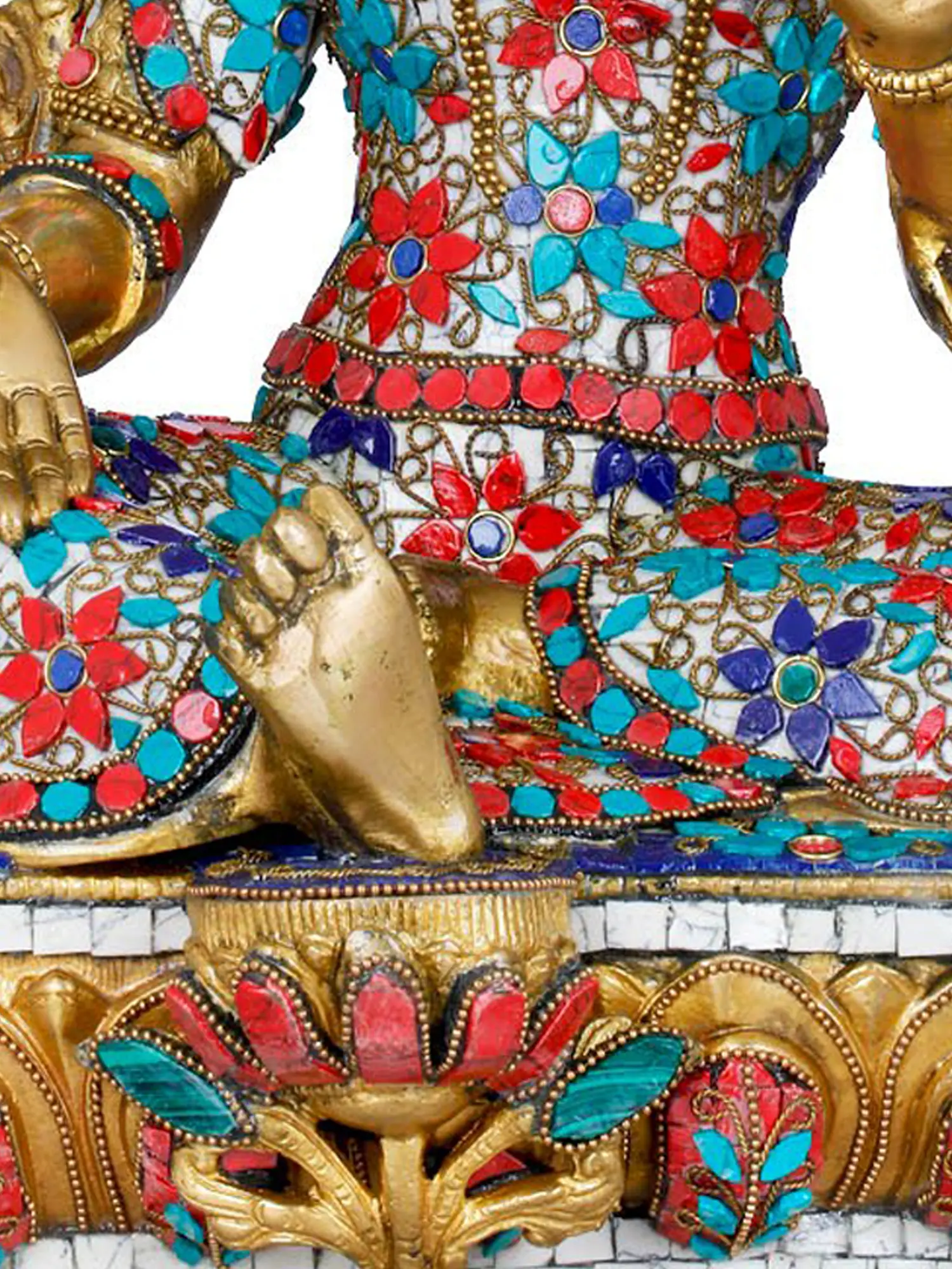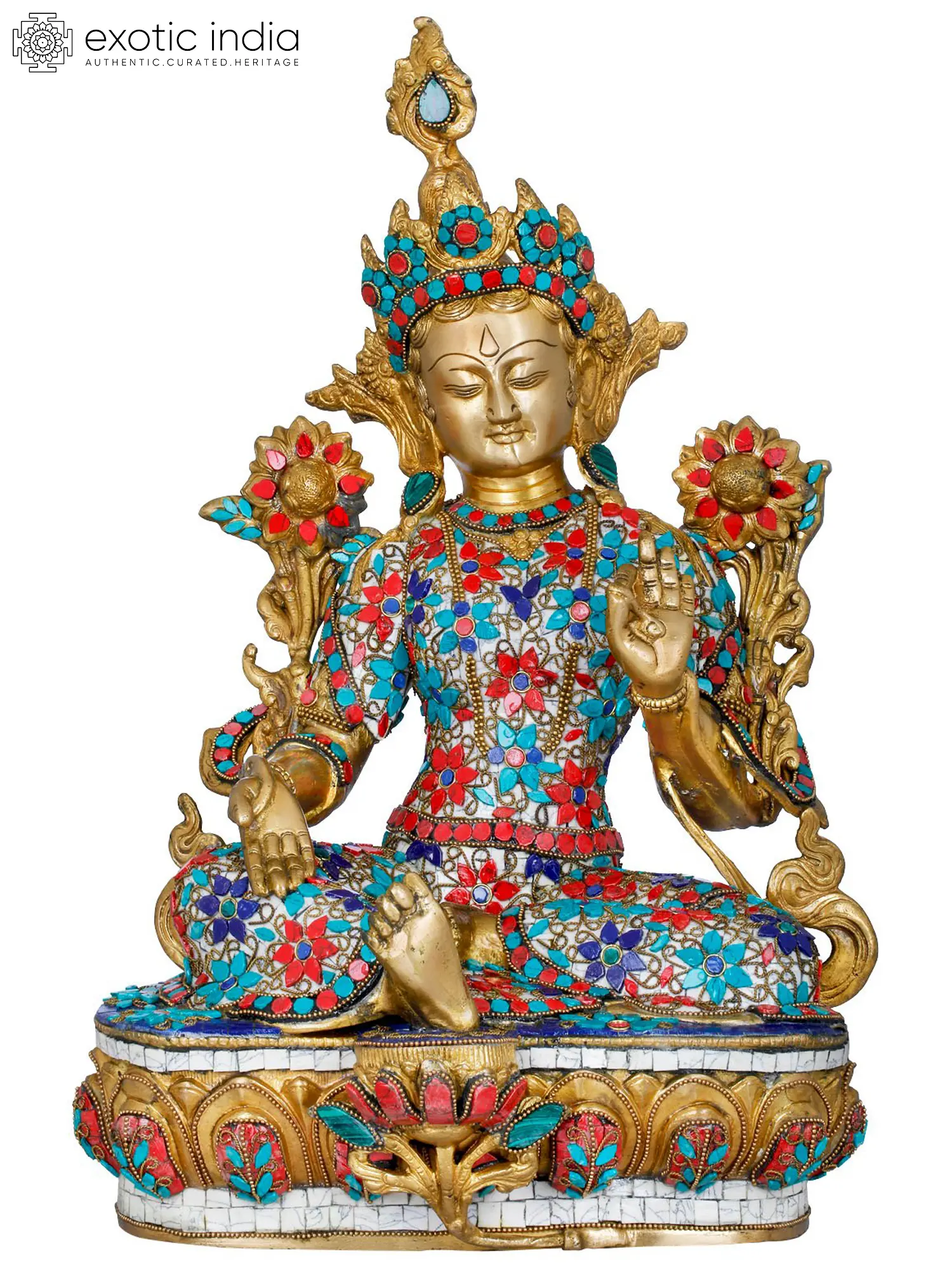 The statue is richly adorned with intricate inlay work, featuring vibrant turquoise, coral, and lapis lazuli stones. These precious materials are meticulously set to depict floral patterns and elaborate ornamentation, enhancing the divine beauty of Green Tara. Her countenance is serene and benevolent, with downcast eyes that suggest deep contemplation and empathy. Her elaborate crown and flowing robes are further embellished, reflecting the divine royalty and spiritual opulence associated with her. The use of brass, a material that has been revered in Indian craftsmanship for centuries, adds a sense of timelessness and spiritual depth to the sculpture. The patina of the brass, combined with the brilliance of the inlaid stones, creates a visually stunning piece that is both a work of art and a sacred object.