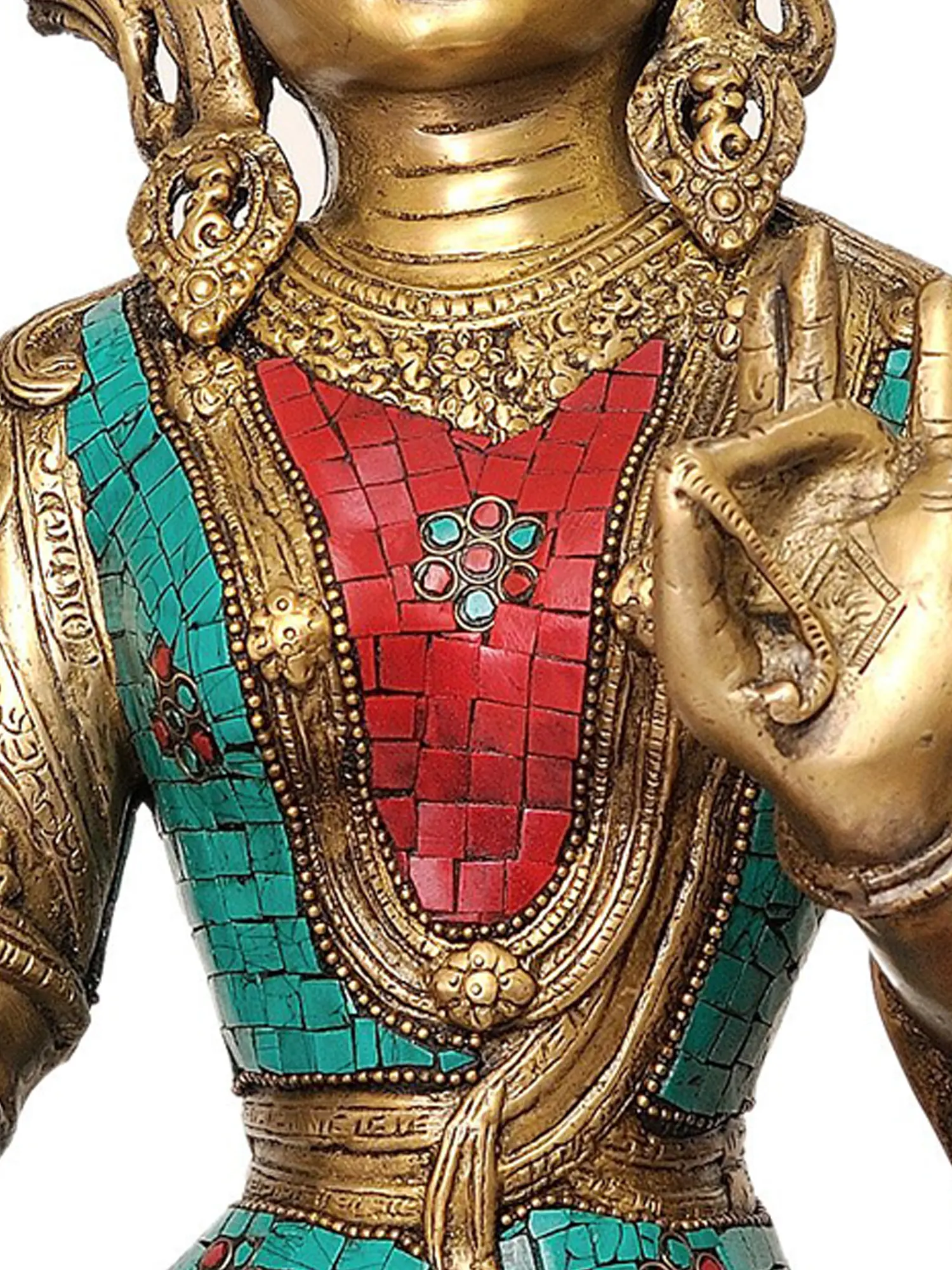 This exquisite 18-inch statue is a testament to the skill and devotion of Indian artisans. Crafted from high-quality brass, it boasts a lustrous sheen that speaks to its enduring value. The intricate detailing of Tara's serene countenance, her graceful posture, and the delicate folds of her garments are all rendered with exceptional care. What truly sets this piece apart is its stunning inlay work. Vibrant red and turquoise stones are meticulously embedded into the brass, bringing the deity to life with a captivating splash of color. The multi-tiered crown adorning her head, itself a miniature work of art, is also adorned with these precious stones, further emphasizing her divine majesty. The presence of stylized floral motifs and flowing cosmic energy waves further enhances the statue's visual appeal and symbolic depth. The careful placement of each stone, the subtle patination of the brass, and the overall harmonious composition make this statue not just an object of devotion, but a true masterpiece of art. It is a perfect addition to any altar, meditation space, or as a significant decorative piece for those who appreciate the profound beauty and spiritual resonance of Buddhist art. Each statue is handmade in India, ensuring a unique and authentic representation of this beloved deity.