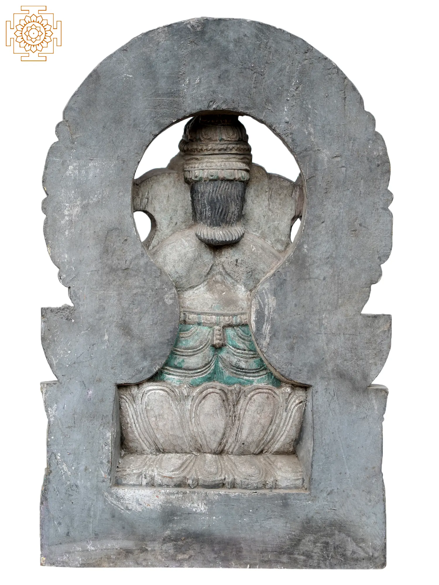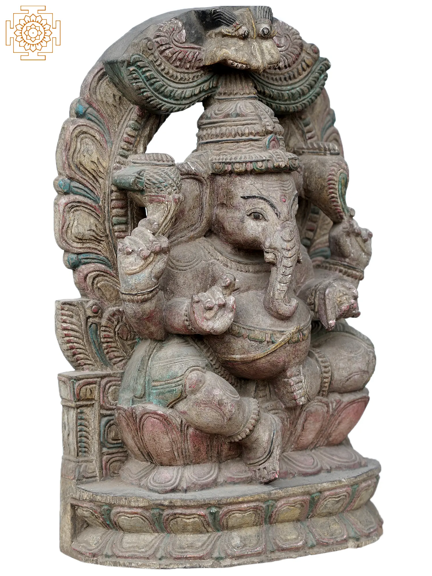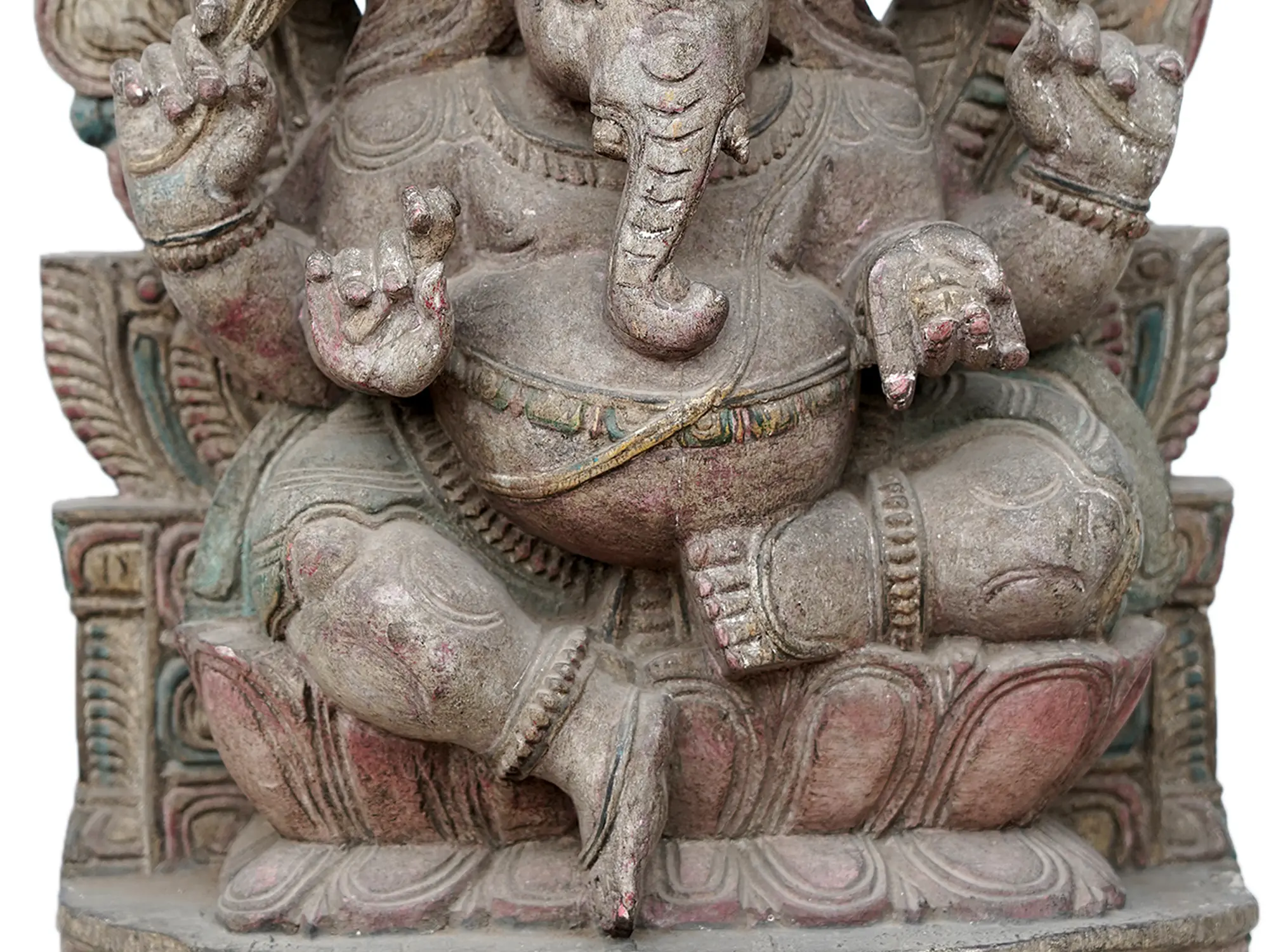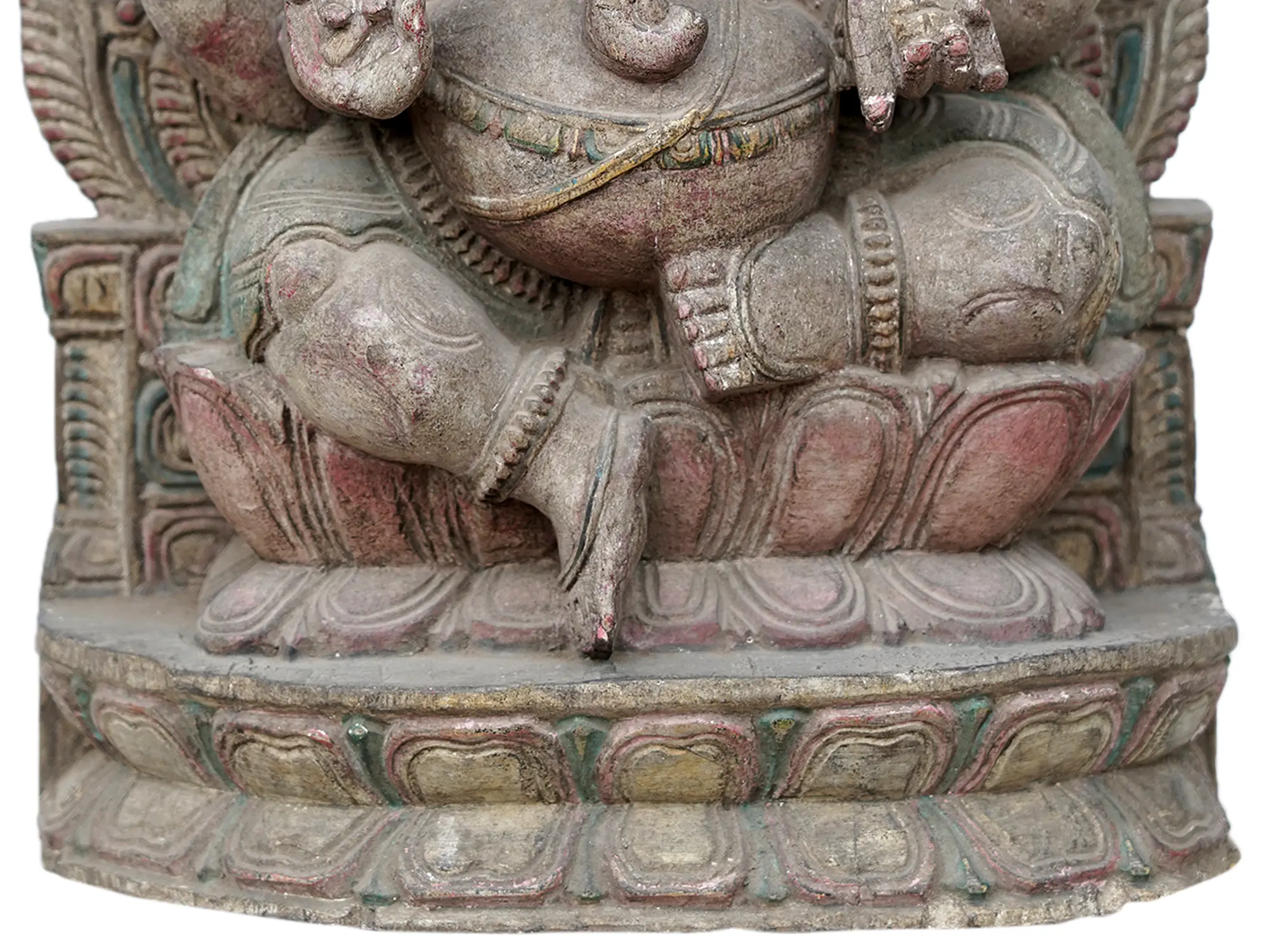 Lord Ganesha, a divine embodiment of grace and power, sits serenely in the Lalitasana posture upon a resplendent lotus, firmly affixed to a magnificent Kirtimukha throne. His form exudes an enchanting charm, with a generous belly that symbolises abundance and his majestic trunk gracefully curled. His eyes, windows to cosmic wisdom, shimmer with timeless knowledge, while his ears, large and attentive, hear the whispers of the universe. He wields a goad and a noose, instruments of guidance and restraint. His broken tusk, a testament to sacrifice, rests in his right hand, while his left cradles a sweet Modak, a promise of blessings. Adorned with regal jewels and a princely crown, this vivid wooden statue signifies Ganesha’s role as the remover of obstacles and the bestower of prosperity, wisdom, and sweet fulfilment.