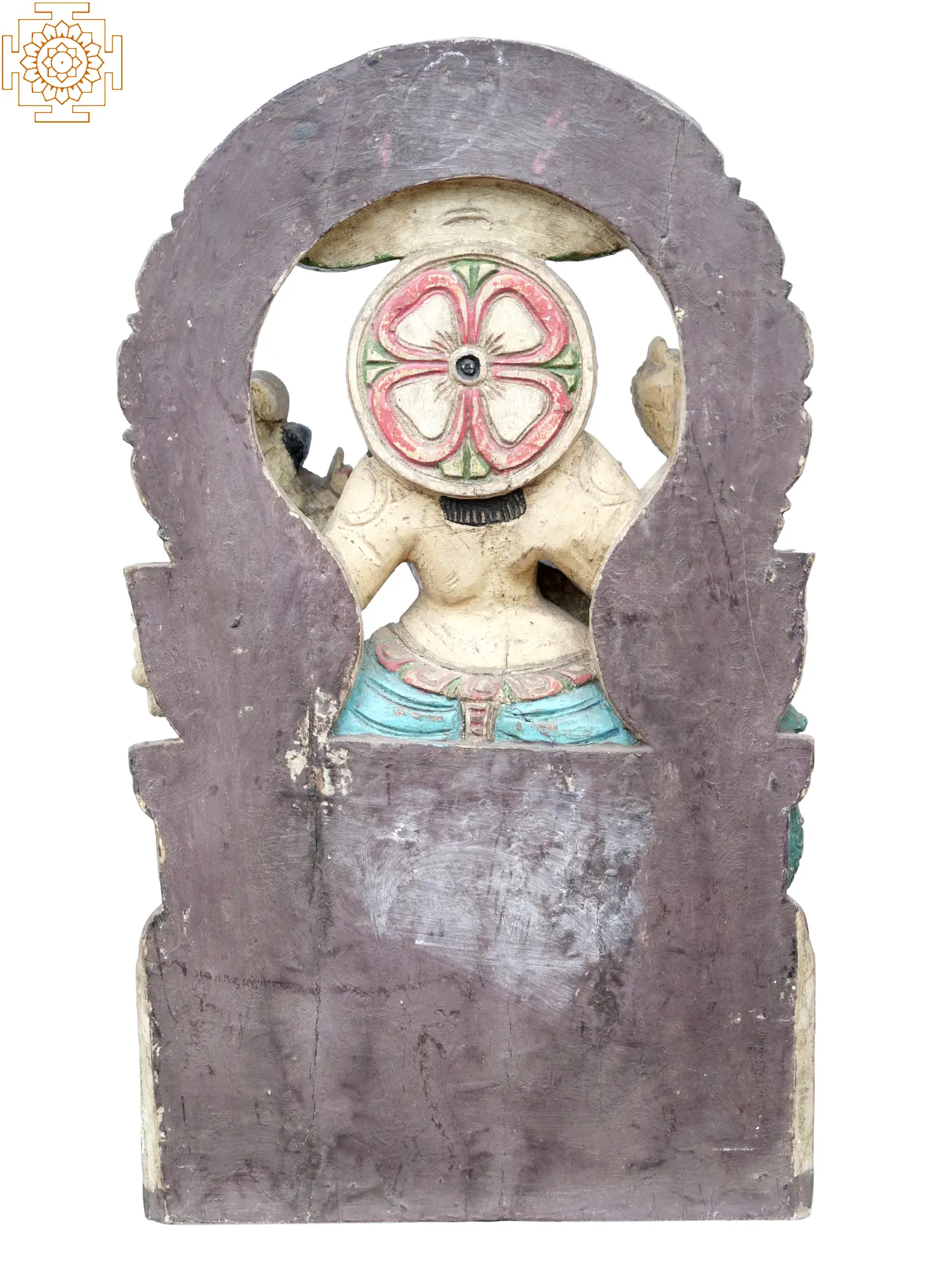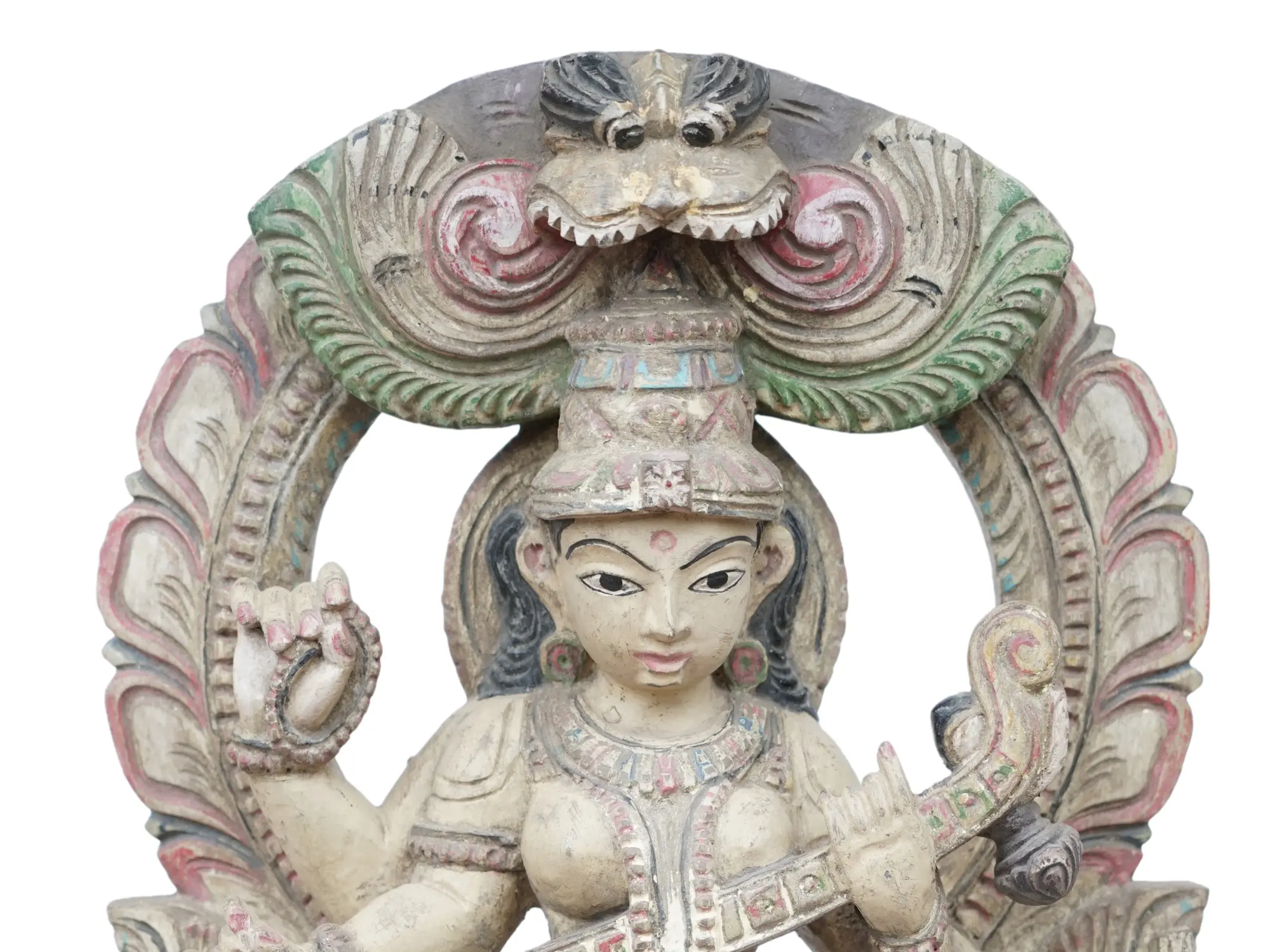 Saraswati is revered as the mother of the Vedas, the goddess who bestows the gift of eloquence and creativity. Legends tell of her emergence from the forehead of Lord Brahma, the creator, to guide humanity with her wisdom. She is often associated with the swan, a symbol of purity and discrimination, and the lotus, representing spiritual awakening and enlightenment. This sculpture, with its vibrant traditional colors and the intricate details of the wood carving, is a testament to these profound associations. The ornate arch behind the goddess, possibly symbolizing a celestial halo or a stylized peacock feather, further enhances her divine aura. The subtle hints of blue and pink in her attire, along with the earthy tones of the wood, create a harmonious blend that is both visually striking and spiritually resonant. The piece is a celebration of the artistic traditions that have preserved the essence of this beloved goddess through generations.