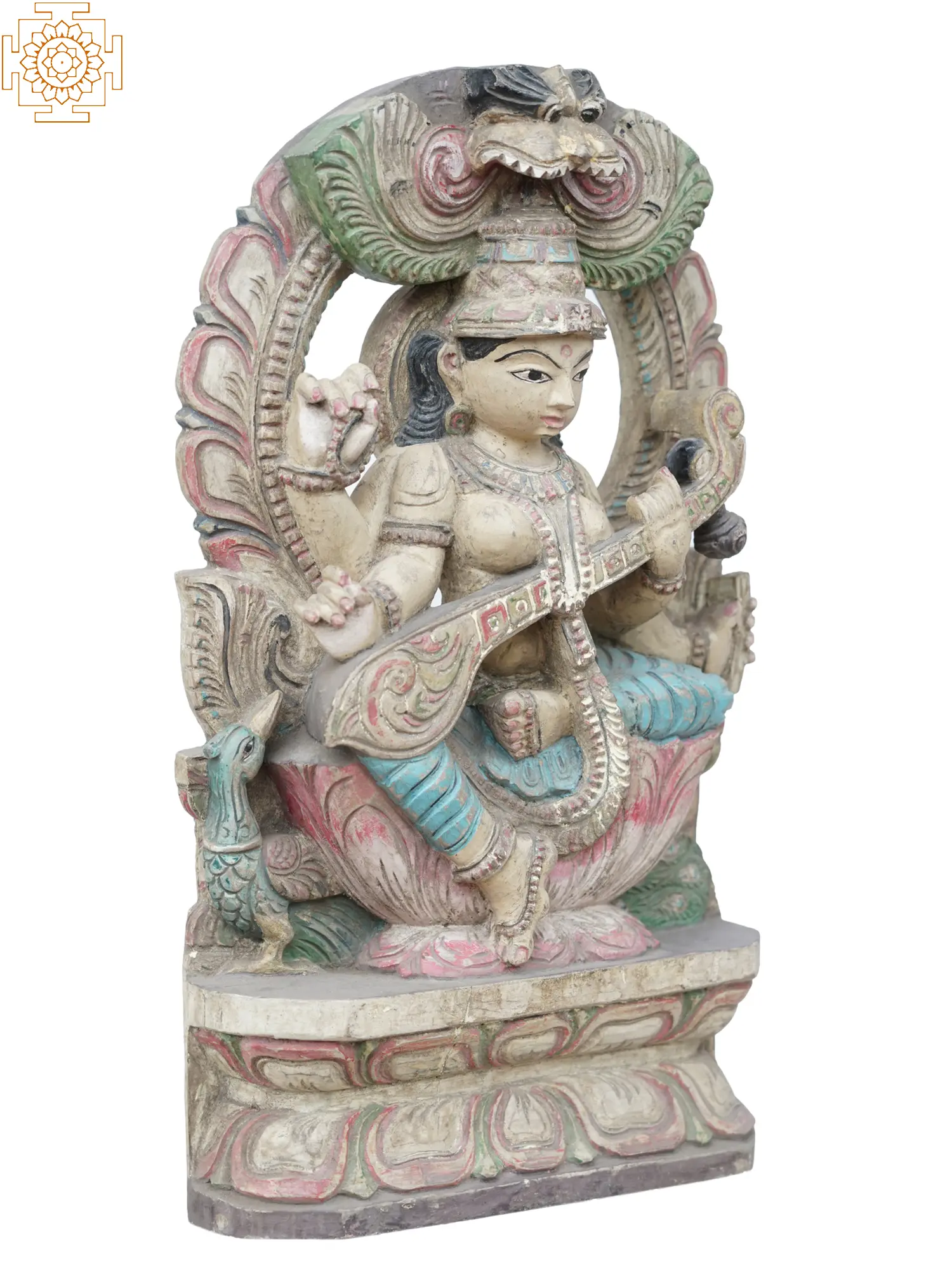 18'' Traditional Coloured Saraswati Idol Playing Sitar | Wooden Statue