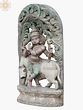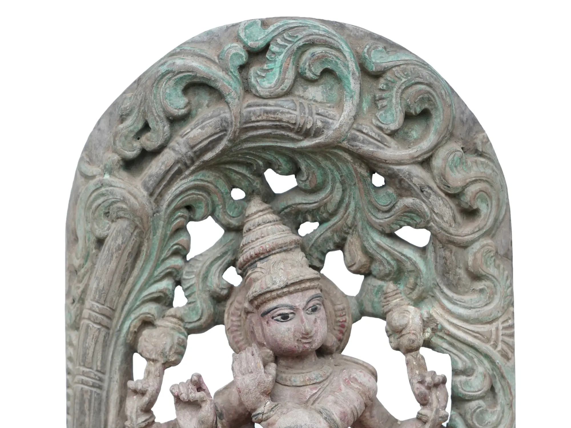 The intricate carving of the ornate arch behind Krishna and the cow speaks volumes of the artisan's skill. Lush, swirling motifs reminiscent of foliage and celestial patterns frame the divine scene, drawing the eye towards the central figures. The subtle hints of aged green patina lend a sense of age and spiritual depth, as if the sculpture has witnessed centuries of devotion. This artistry is not merely decorative; it is infused with the profound symbolism of Hinduism. The presence of Krishna, the Supreme Being, with the cow, representing the earth's bounty and purity, embodies a harmonious existence. Such depictions are often found in temples and homes, serving as focal points for prayer, meditation, and the cultivation of spiritual awareness. This piece serves as a tangible link to ancient tales and the enduring philosophy of divine love and selfless service. ––––––––––––––––––