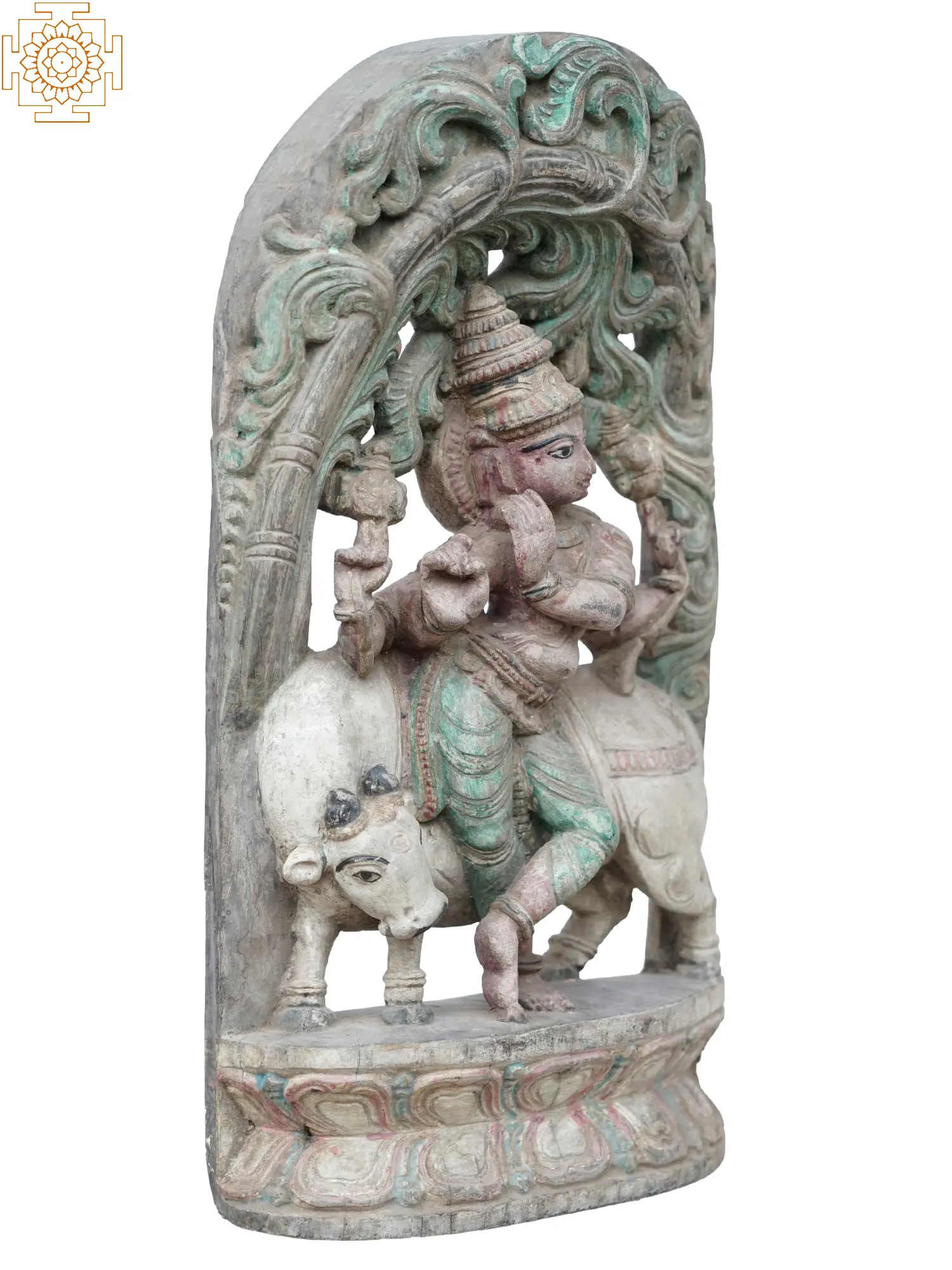 24" Lord Krishna Playing Flute with Cow | Wood Carving