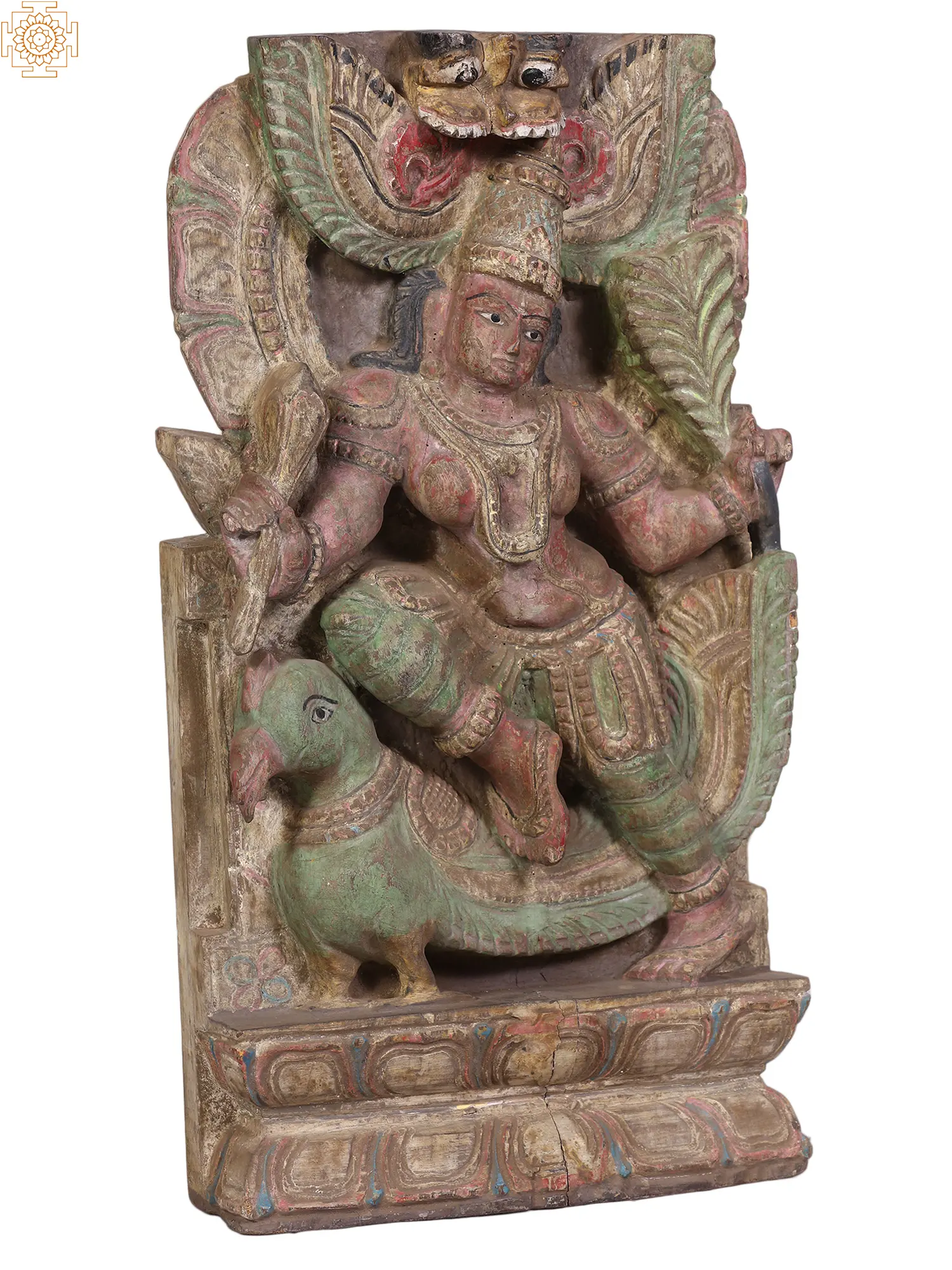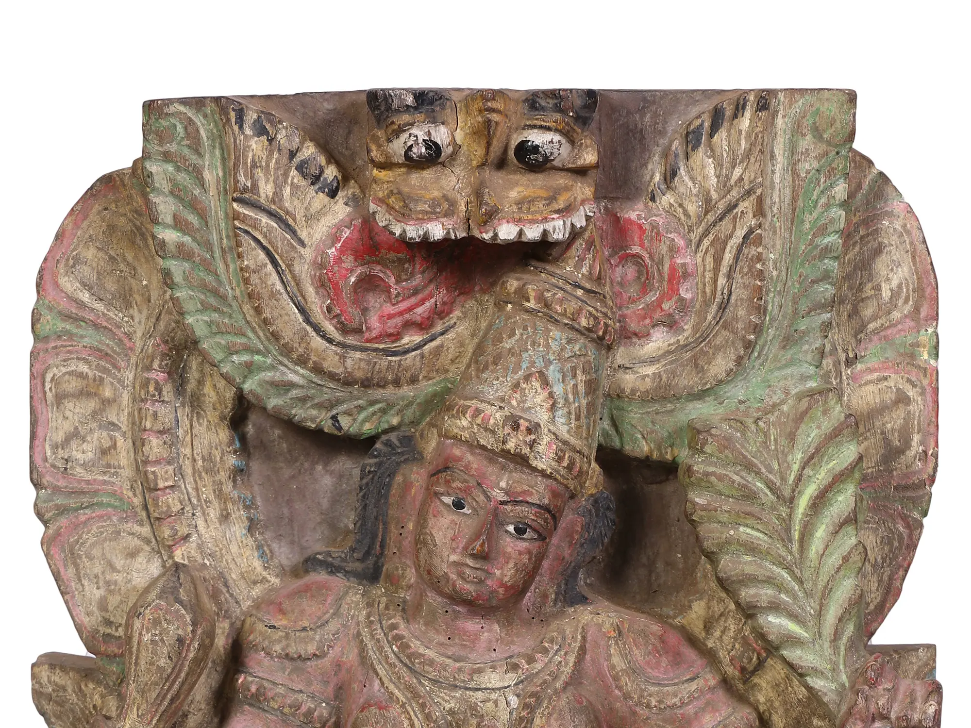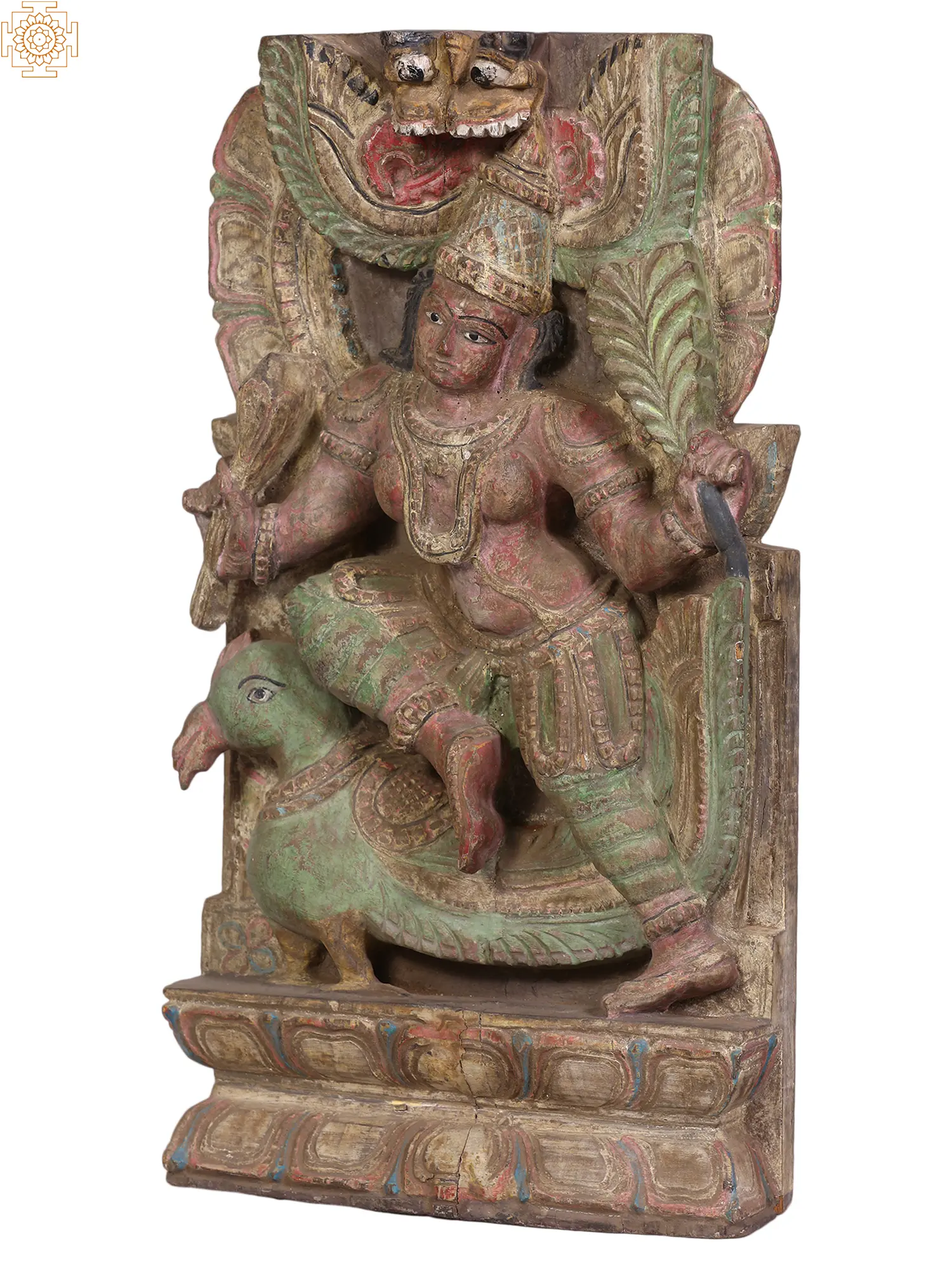 Originating from the fertile artistic landscape of South India, this sculpture is a proud representative of traditional wood carving techniques. The choice of wood as the medium allows for a depth of detail and a tactile quality that synthetic materials cannot replicate. Each stroke of the chisel has brought to life the divine figure and her mythical steed, imbuing the piece with a soul and narrative. The base upon which the Apsara and parrot are mounted is also elaborately carved, suggesting a lotus pedestal, a common motif in Indian art symbolizing purity, enlightenment, and divine beauty. The colors, though faded by time, were likely once vivid, used to highlight the features and textures of the carving, reflecting the vibrant aesthetic of South Indian temple art and folk traditions. This sculpture is more than just an object; it is a piece of history, a fragment of a devotional practice, and a window into a world of ancient stories and beliefs.