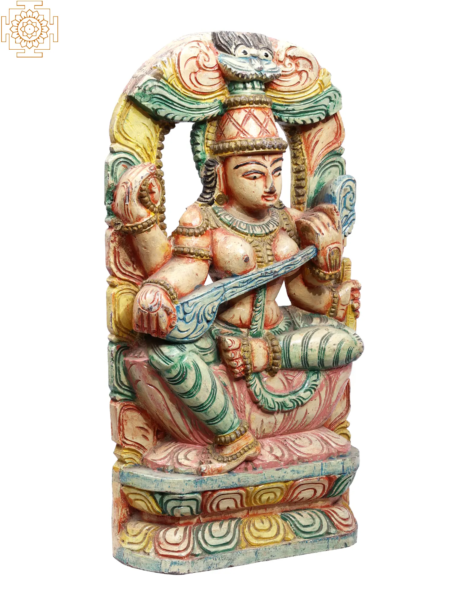 18" Wooden Colorful Sitting Goddess Saraswati Playing Veena