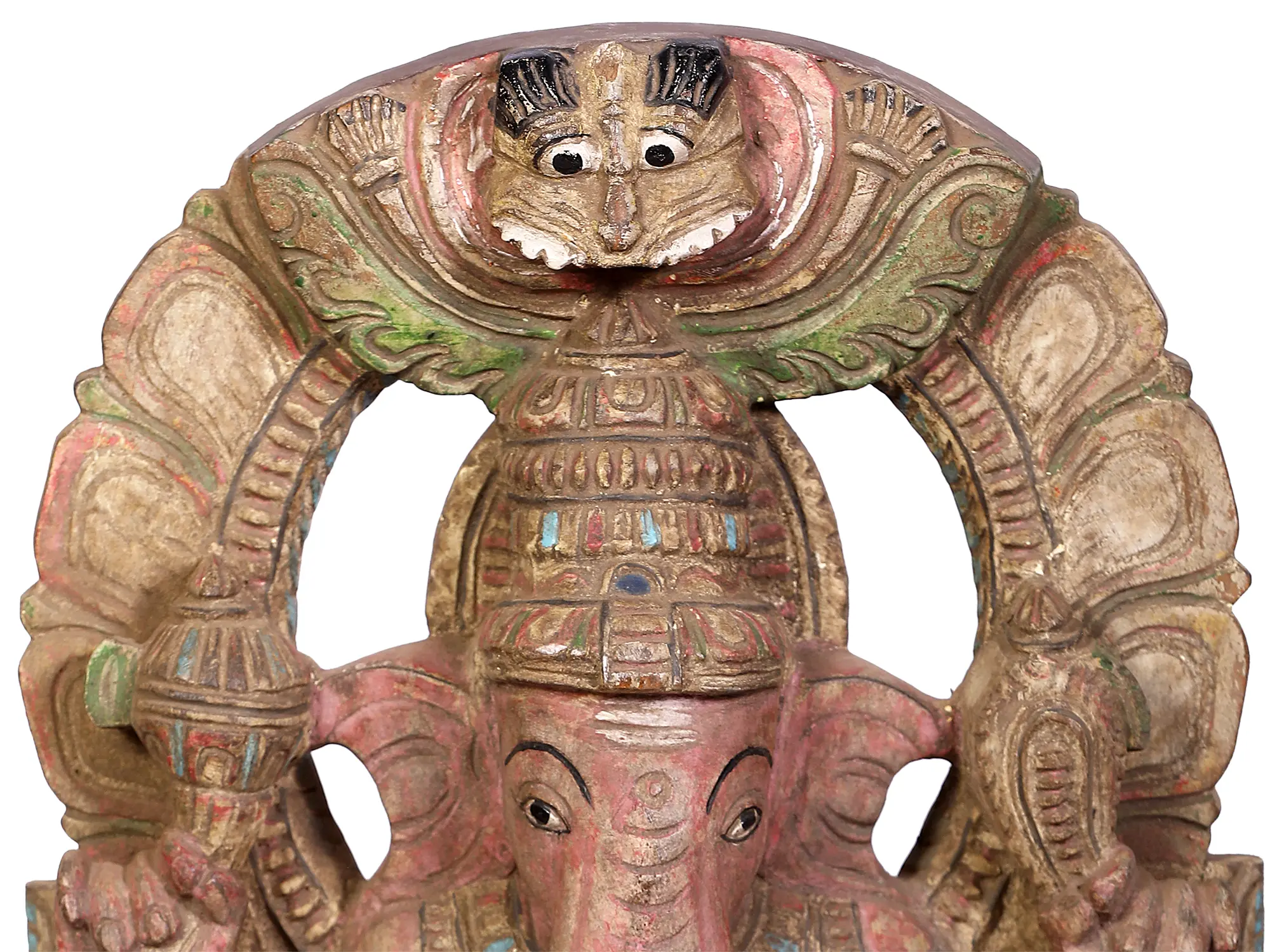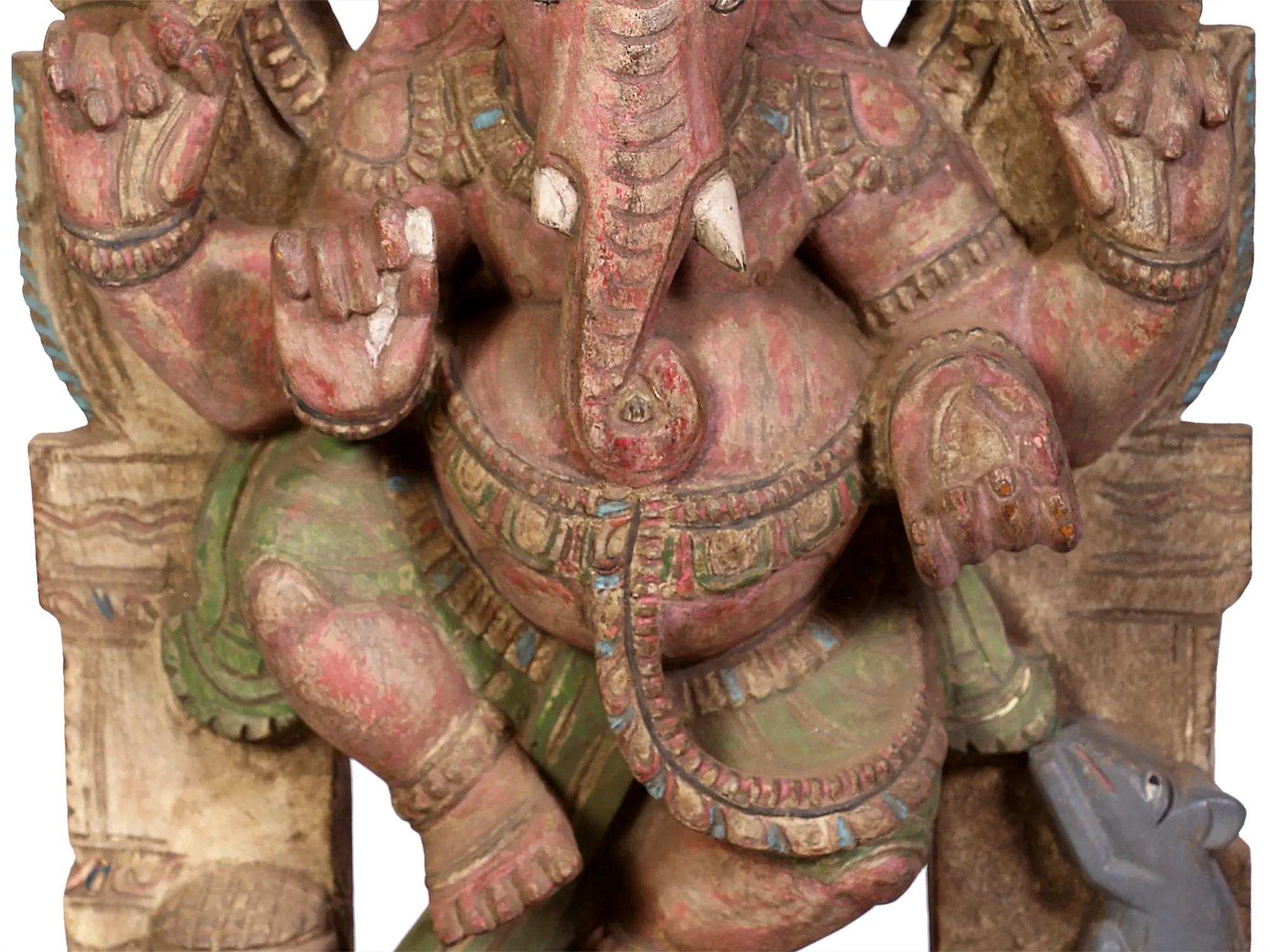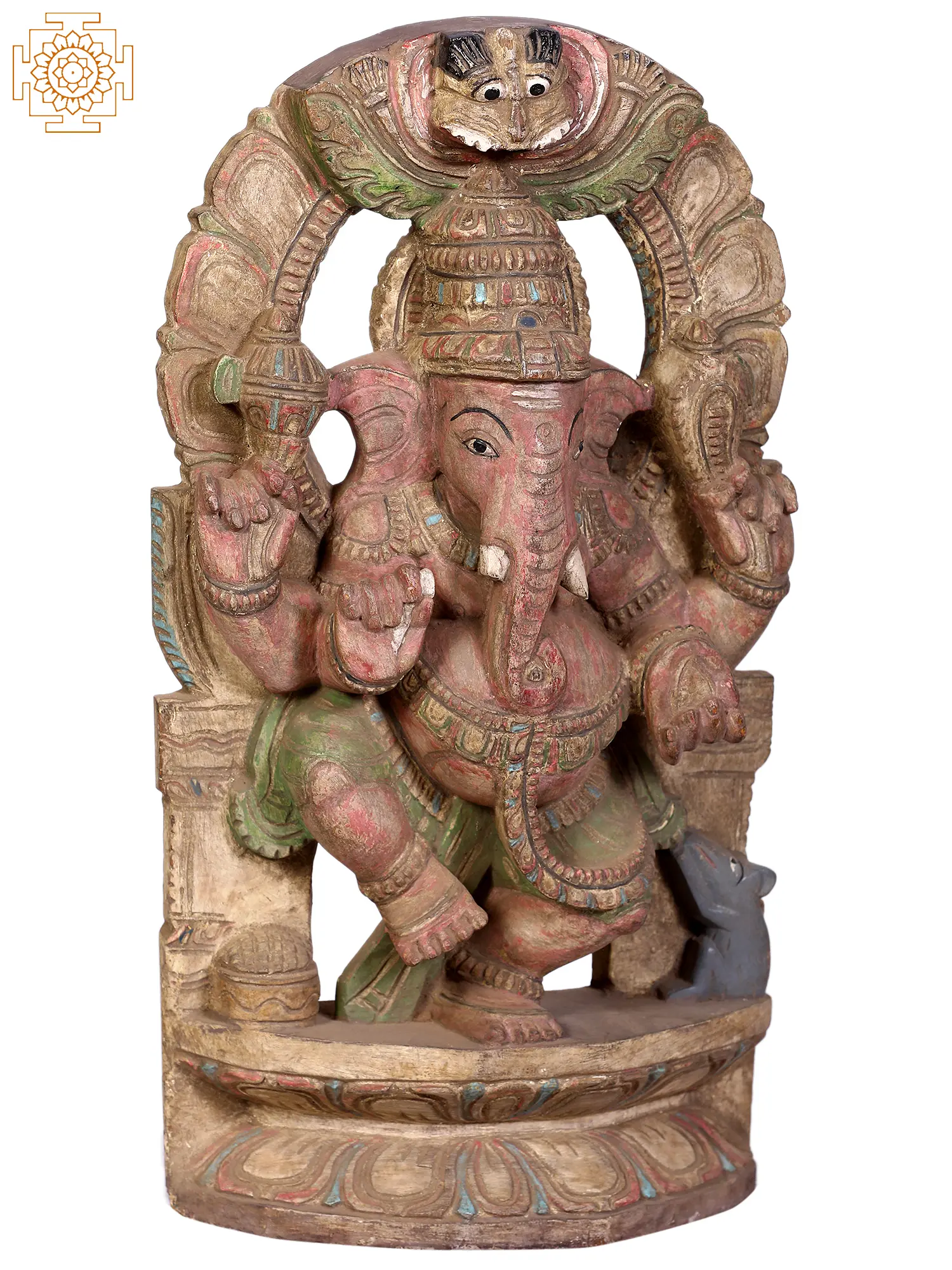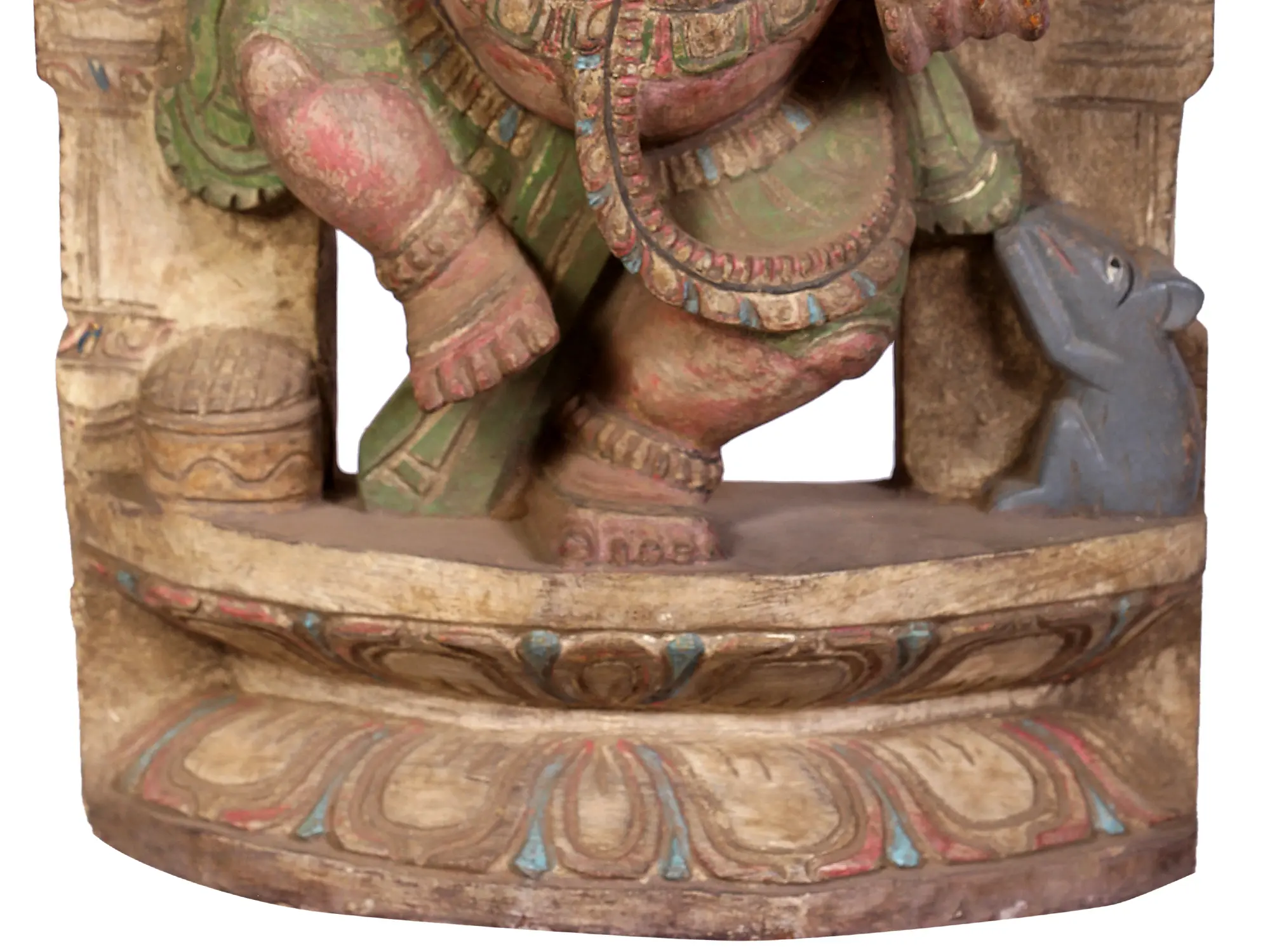 In the artistry of this wooden statue, Lord Ganesha, the harbinger of auspicious beginnings, comes alive in a divine dance upon a “Kirtimukha throne”. His form radiates with celestial grace, swaying in the enchanting “Tribhanga posture”. One leg is elegantly raised, infusing the scene with boundless joy. Clutched in his four hands are sacred symbols of his benevolence and power—a broken tusk, the noose, and the goad. His visage is a blend of serenity and exuberance, symbolising the harmonious coexistence of strength and compassion. Beside the dancing deity, his faithful “Mushaka”, the humble mouse, offers prayers, epitomising loyalty and devotion in the divine presence.