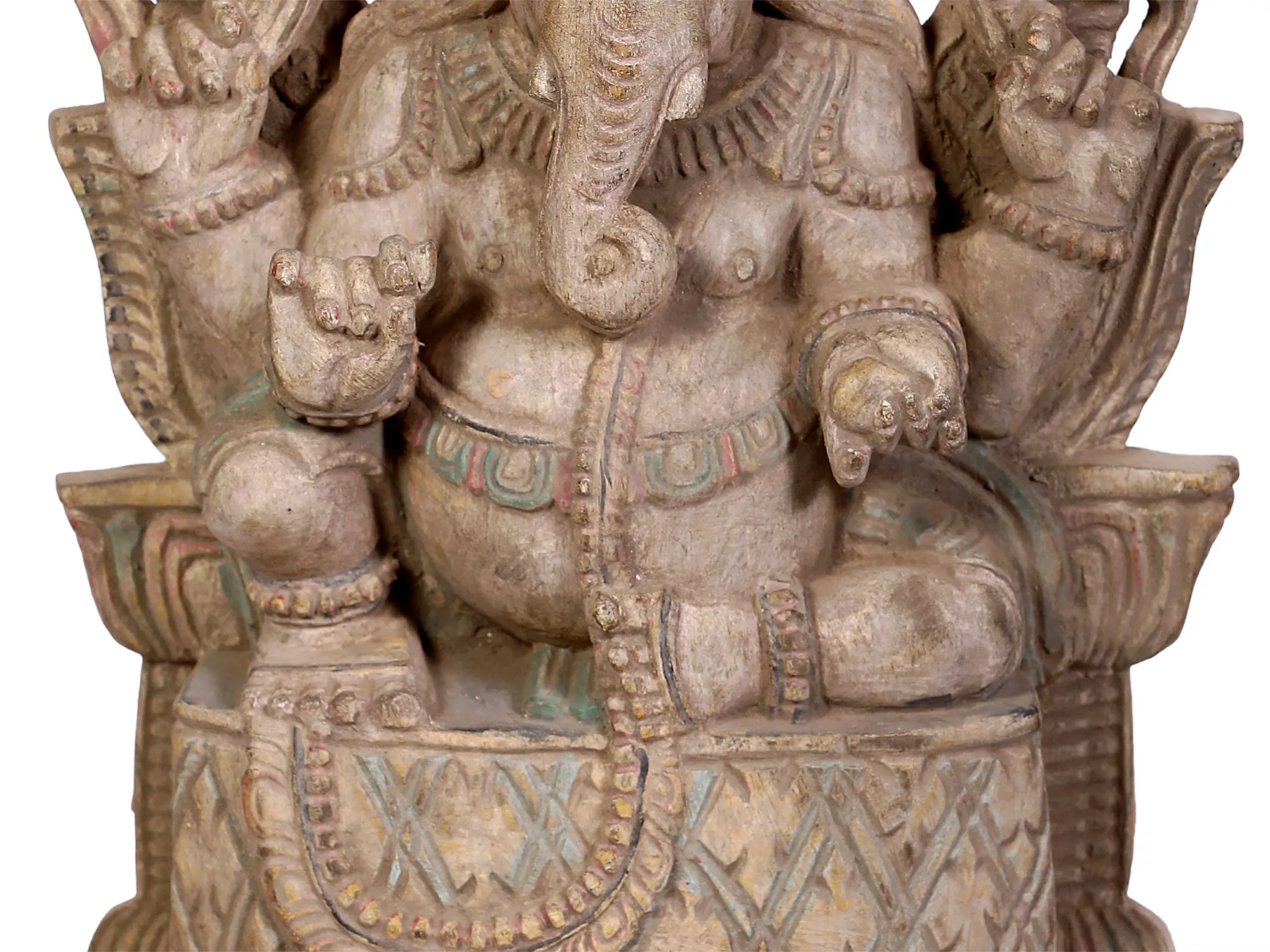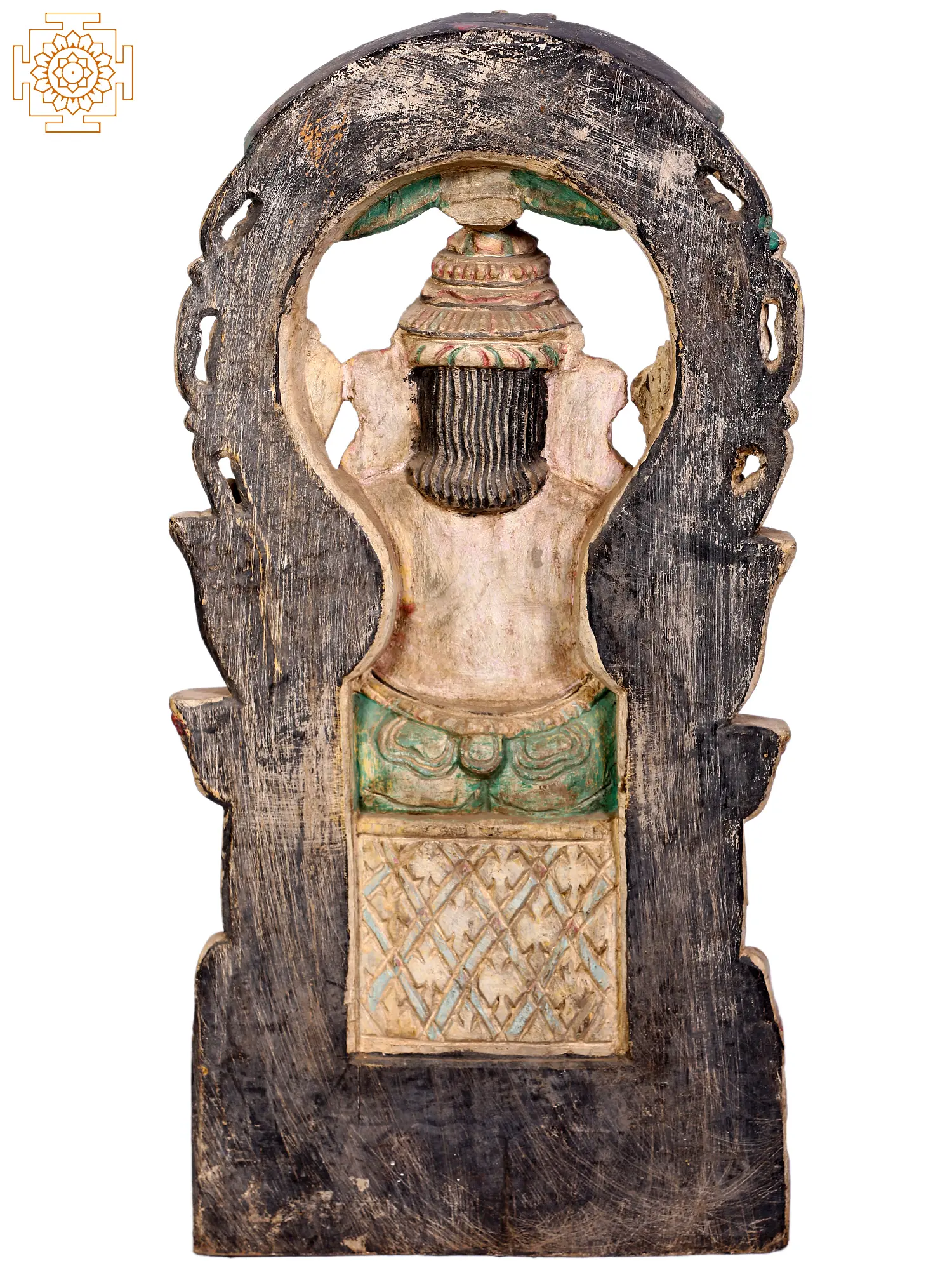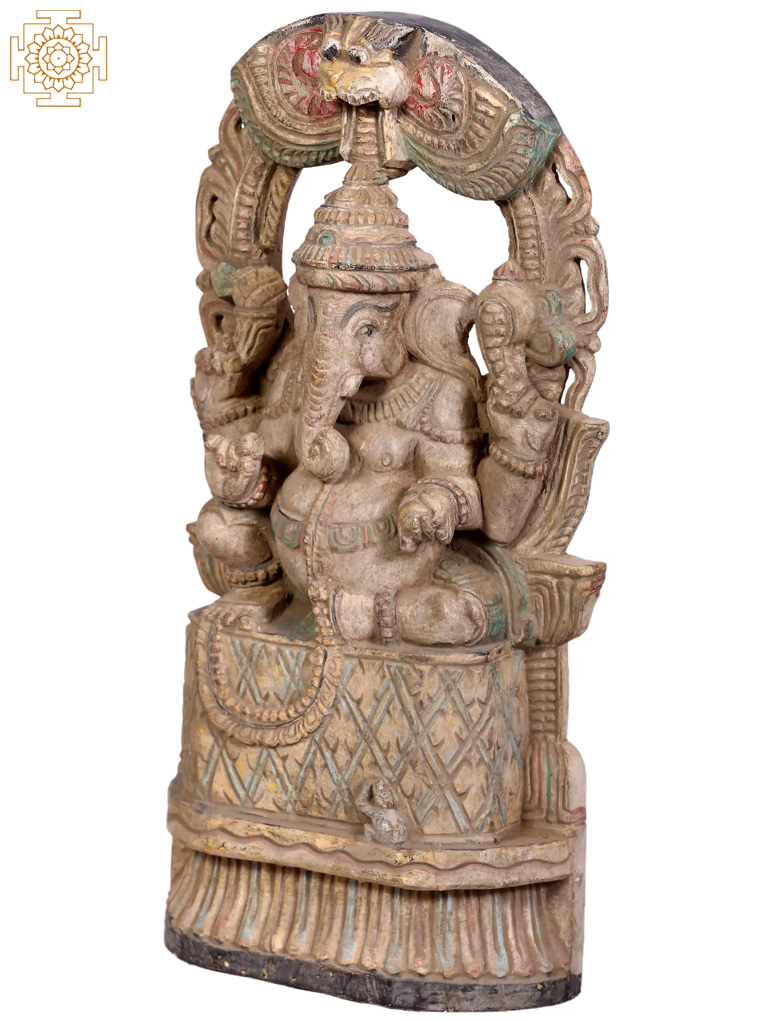 Lord Ganesha, in this sacred wooden form, embodies the eternal dance of creation, preservation, and fiery dissolution. Encased within an ornate arch, his presence transcends the physical realm, inviting reverence. In this divine spectacle, the God of time, “Mahakala”, hovers as the ultimate claimant of all existence. Ganesha, the remover of obstacles, sitting in “Utkutakasana posture”, exuding regal magnificence. A goad and a noose in his hands symbolise guidance and restraint. Adorned with regal aura, he beckons us to seek balance amidst the cycles of existence. This artwork signifies the profound harmony between creation and dissolution, the delicate balance maintained by the divine lord.