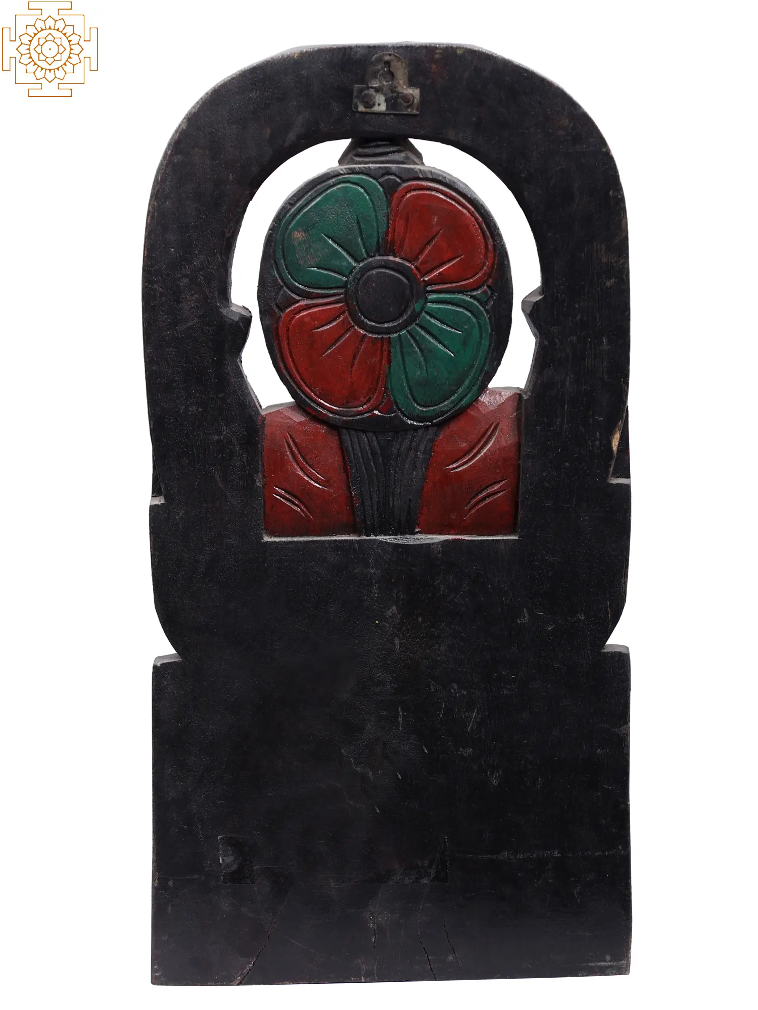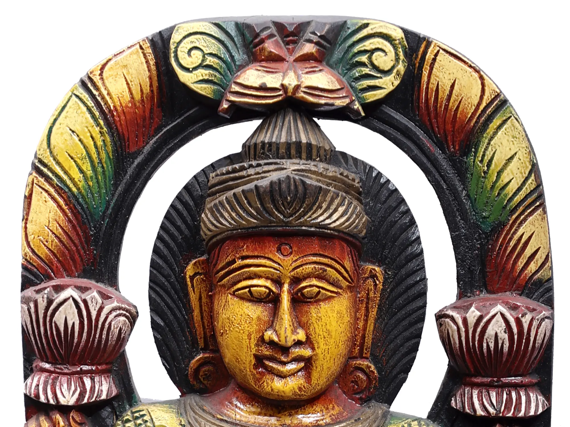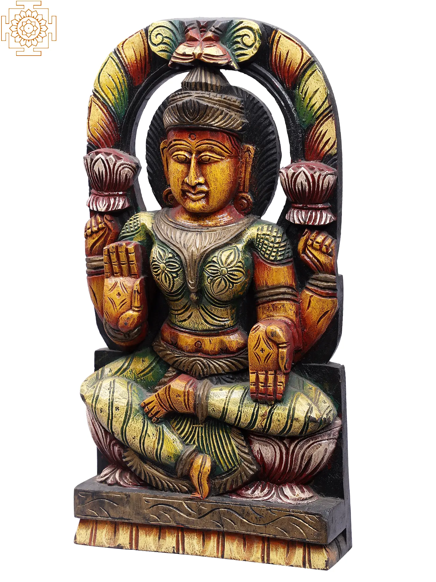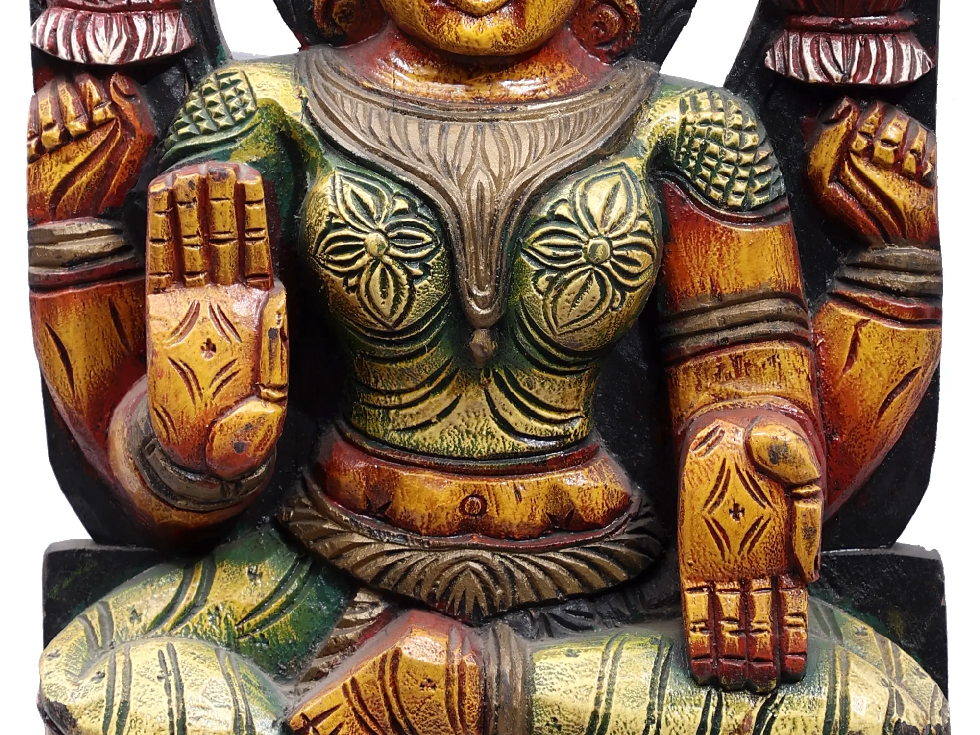 Infused with ashtetic colors and a simple carving, this wooden statue and wall hanging of goddess Lakshmi is an auspicious motif in your space, to fill it with the heavenliness of the Chatrubhuja goddess. Devi Lakshmi is in her popular form, carrying the lotuses in her secondary hands, and raising her primary hands in Abhaya and Varada mudra. She is Padmasana- sitting on a lotus throne, surrounded by a Kirtimukha or the face of glory, symbolizing her gloriousness and royalty.
