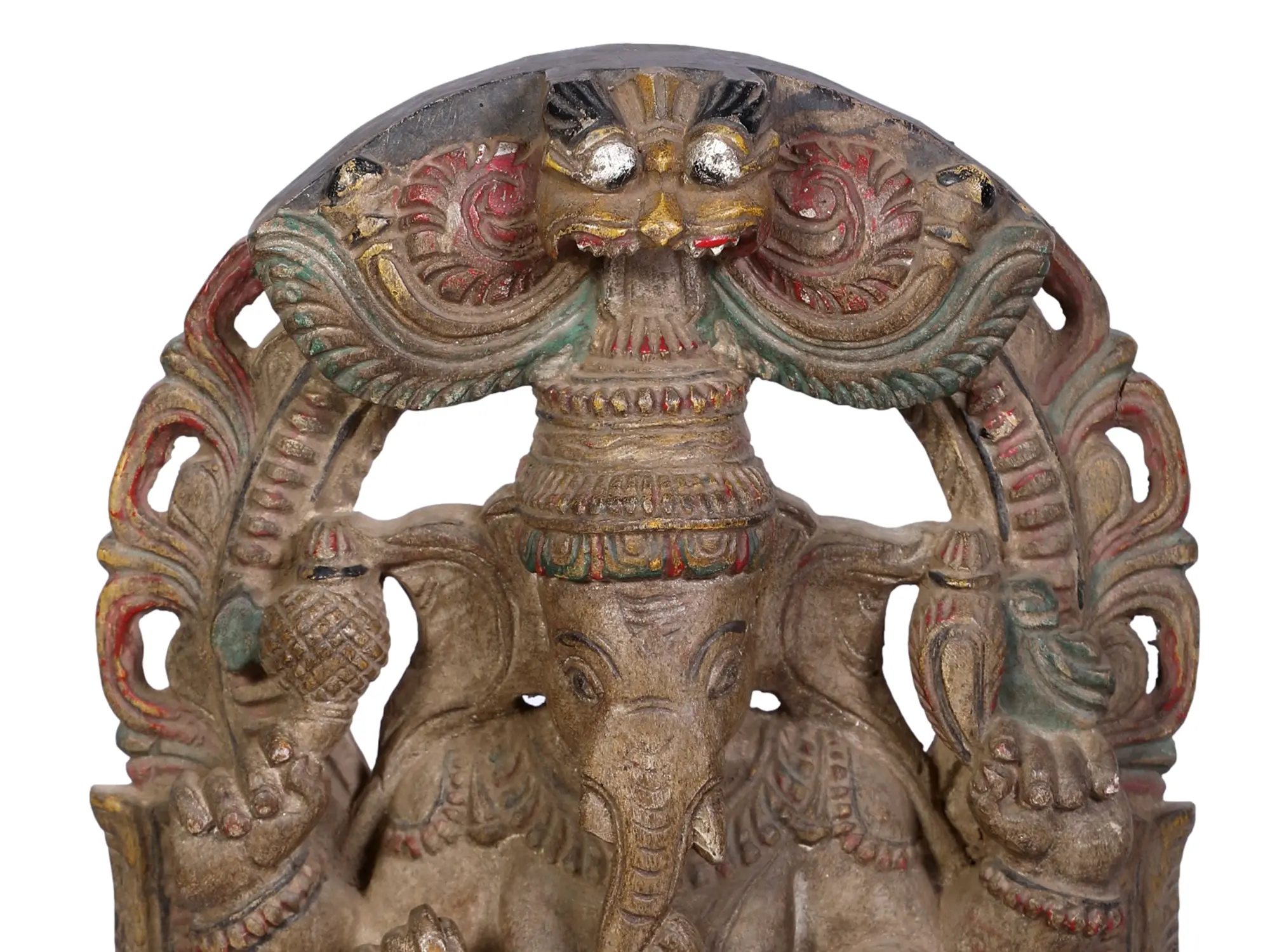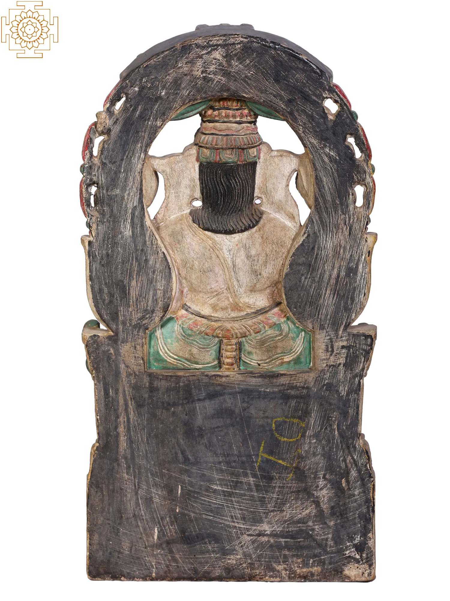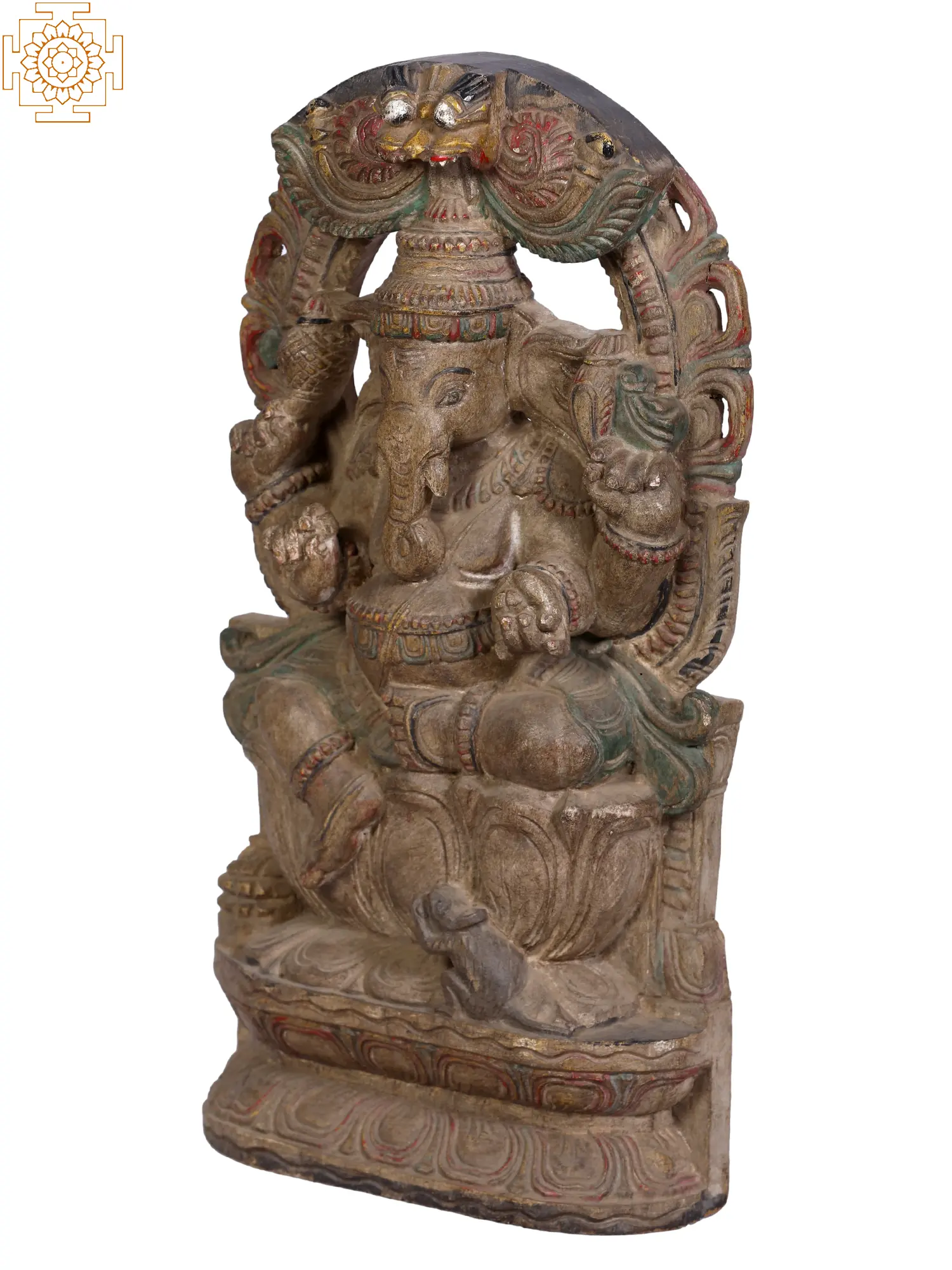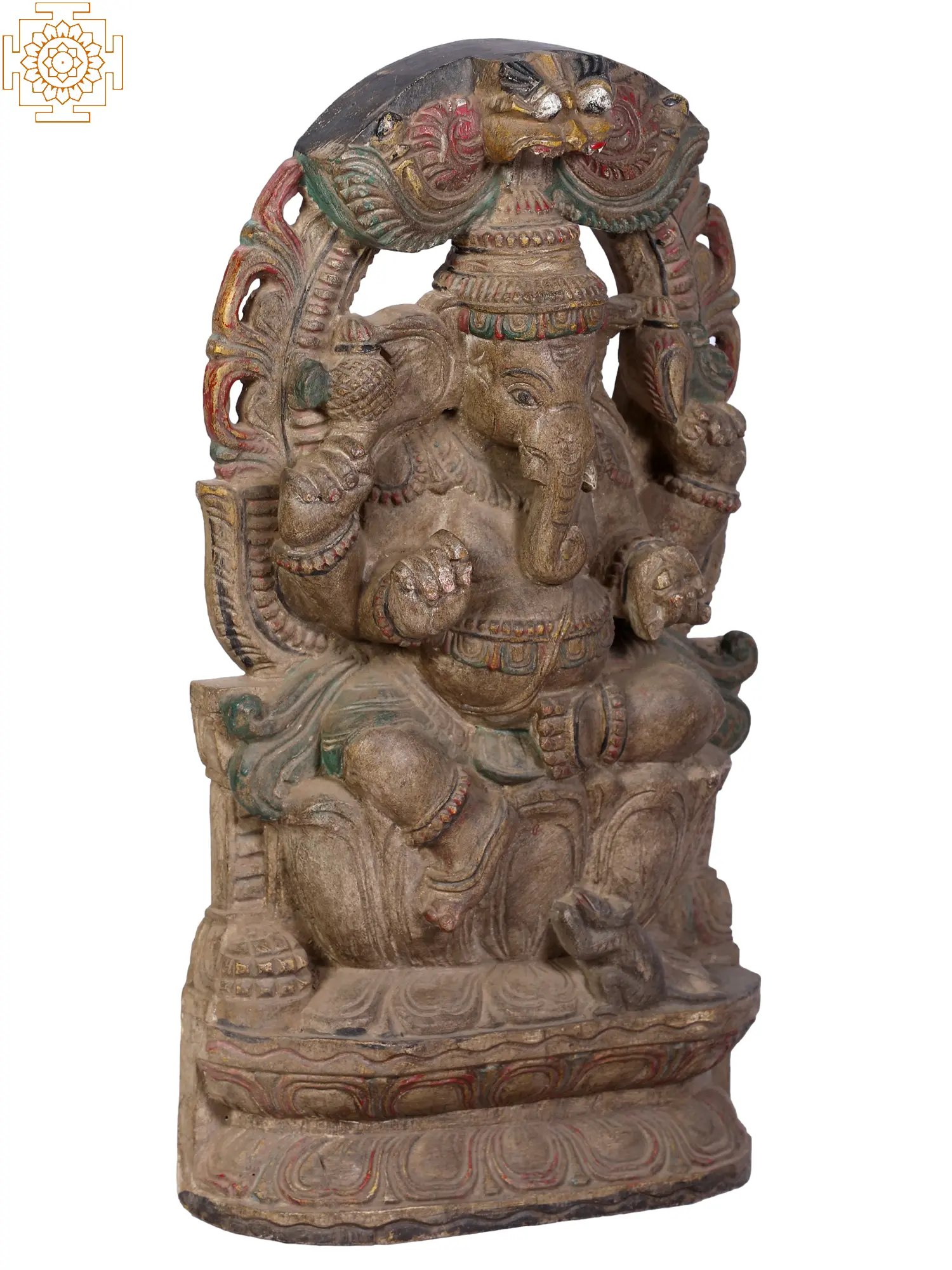 Lord Ganpati, also known as “Vighnaharta”, resplendent and serene, graces the cosmos seated in the “Lalitasana posture”, upon the exalted Kirtimukha throne. He carries a goad and a noose, symbols of divine guidance and restraint. With tender elegance, his front right hand clutches his broken tusk, a testament to sacrifice, while the left cradles a Modaka, the sweet essence of life. Regally adorned, he bears a rotund belly and eyes that mirror galaxies. Near his foot, his loyal “Mushaka”, humble and reverent, offers prayers. This wooden sculpture embodies wisdom, benevolence, and the timeless dance of existence.
