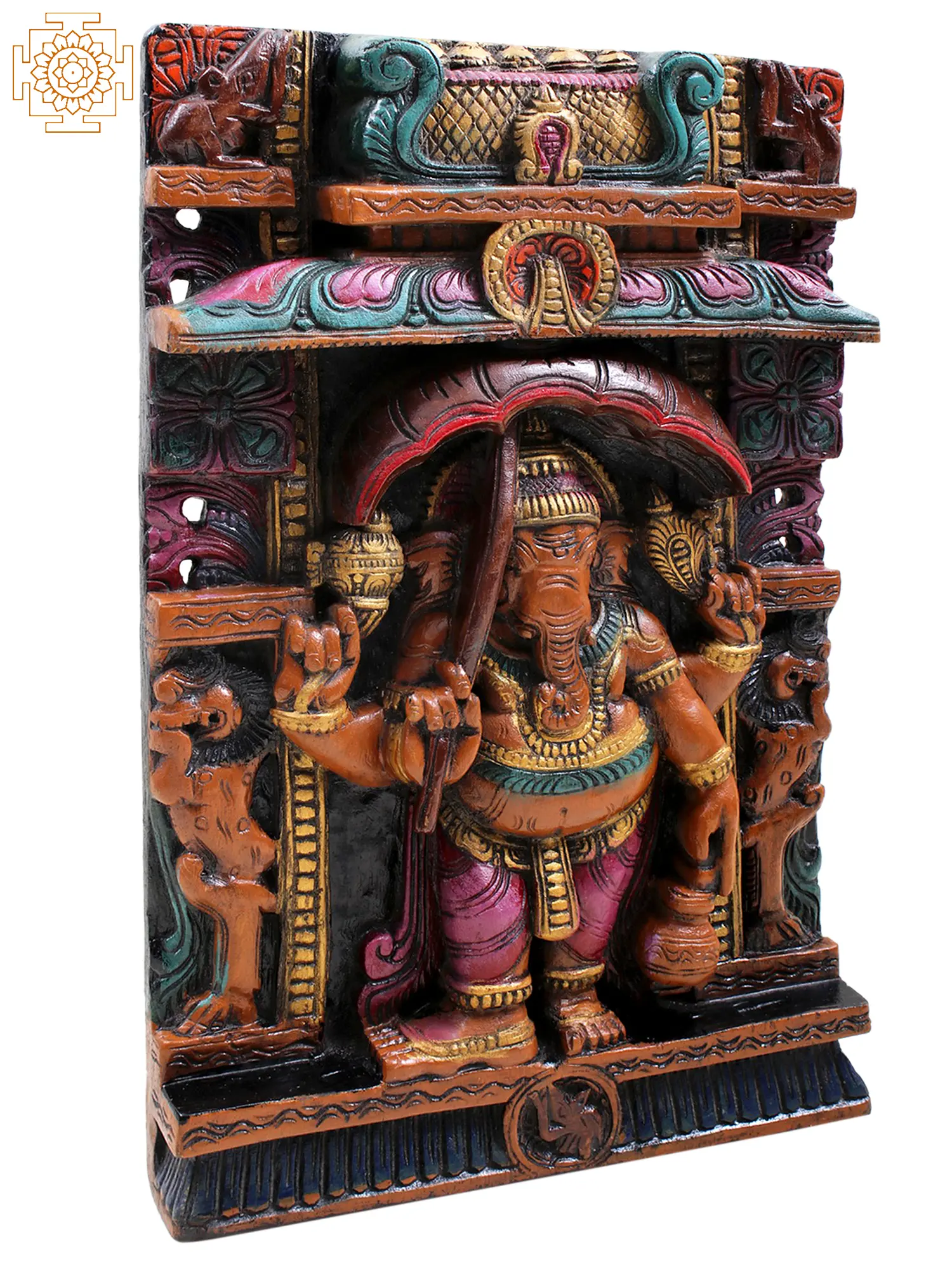 Invite the auspicious presence of Lord Ganesha into your home with this exquisitely carved wooden wall hanging. Standing at 18 inches tall, this piece is a testament to skilled craftsmanship and artistic devotion. Lord Ganesha, the remover of obstacles and the patron of arts and sciences, is depicted in his majestic form, ready to bless your living space with wisdom, good fortune, and prosperity. The intricate details showcase his divine attributes, from the gentle curve of his trunk to the symbolic motifs adorning his attire. Each element is carefully rendered in solid wood, creating a tangible connection to ancient traditions and spiritual reverence.