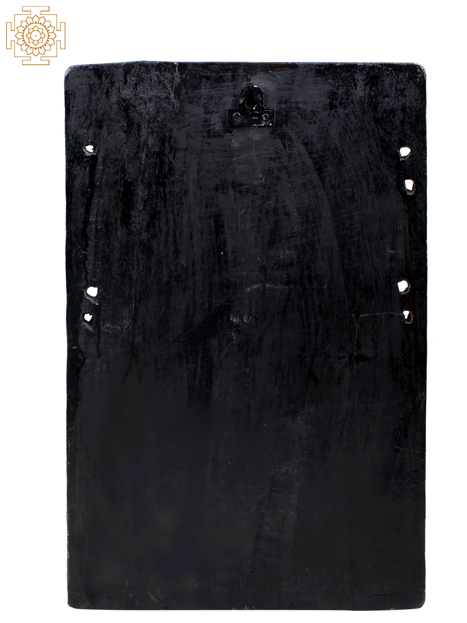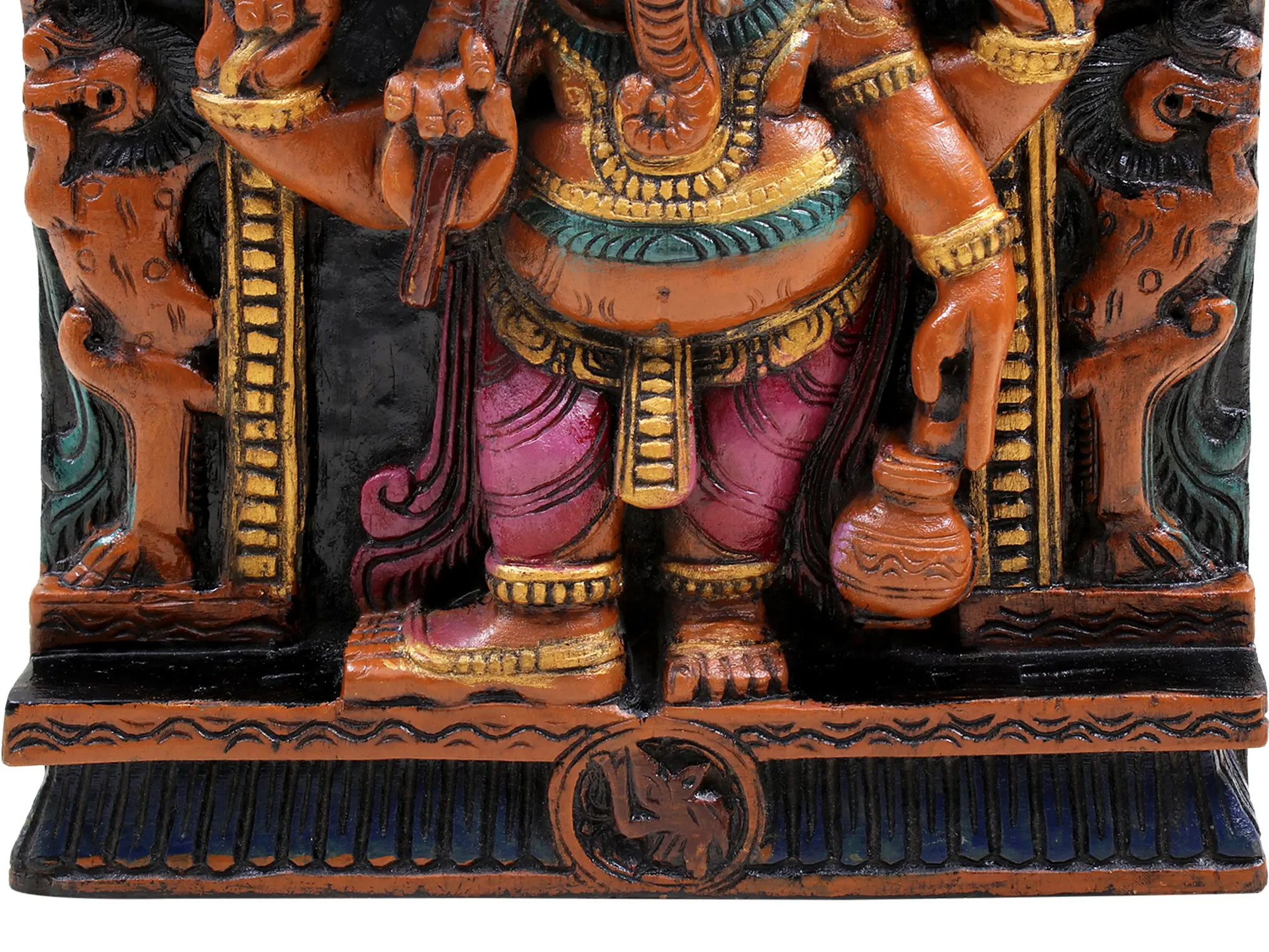 This wall hanging is more than just a decorative item; it's a piece of art imbued with spiritual significance. Crafted from high-quality wood, it has been meticulously carved and hand-painted to highlight the rich textures and vibrant colors. The deep reds, earthy browns, and touches of gold and teal create a visually captivating piece that will become a focal point in any room. The surrounding decorative elements, including the flanking lion-like figures and the ornate architectural frame, further enhance the grandeur and sacred aura of the depiction. This artwork is designed to be both a spiritual anchor and a beautiful addition to your home décor, bringing a sense of peace and divine harmony to your surroundings.