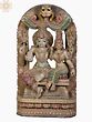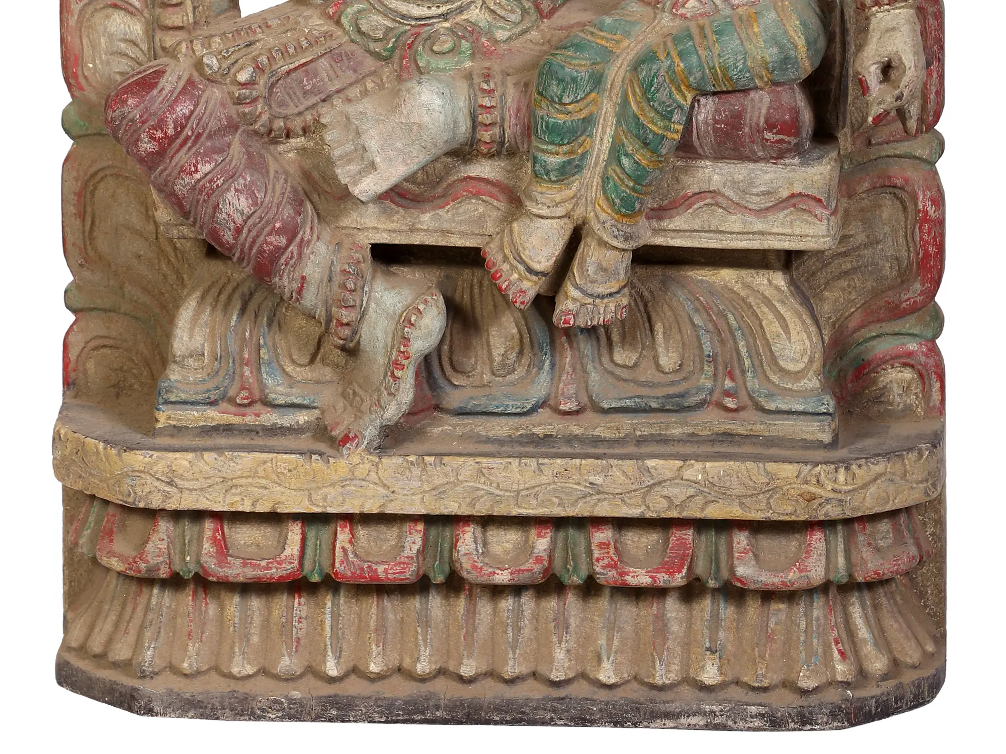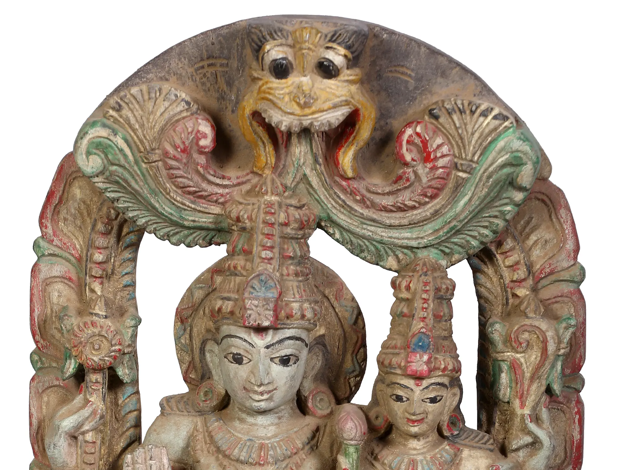 This exquisite wooden carving captures the divine essence of Lord Vishnu and his consort, Devi Lakshmi, seated regally upon their throne. This representation embodies the eternal union of sustenance and prosperity, a cornerstone of Hindu philosophy. Lord Vishnu, the preserver and protector of the universe, is depicted with serene grace, his presence radiating a calming aura. Beside him, Devi Lakshmi, the goddess of wealth, fortune, and beauty, sits with equal poise, her gentle smile bestowing blessings of abundance and well-being. The carving itself is a testament to masterful craftsmanship. Each figure is rendered with meticulous detail, from the delicate ornamentation adorning their crowns and necklaces to the intricate folds of their garments. The wood has been artfully shaped to convey a sense of movement and life, even in this seated posture. The subtle, aged patina of the wood, enhanced by hints of traditional colors, lends an air of antiquity and spiritual depth to the piece, suggesting it carries stories and blessings from generations past.
