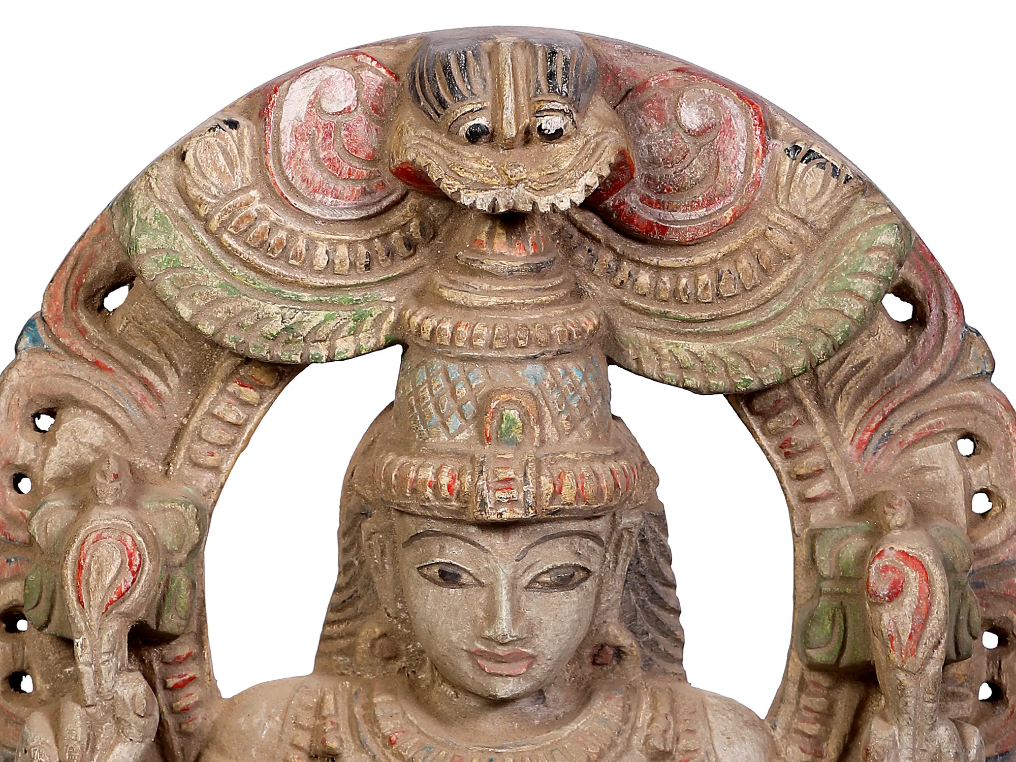 The artistry displayed in this wooden carving is a testament to the rich tradition of Indian woodcraft. The texture and grain of the wood are skillfully utilized to bring the divine form to life. The subtle use of traditional colors enhances the sacredness of the piece, highlighting key elements and adding a touch of vibrancy. The Prabhavali itself is a masterpiece of design, with its flowing lines and symbolic motifs, reminiscent of the celestial aureoles seen in ancient iconography. This piece is more than just an object of art; it is a conduit to the divine, inviting peace, prosperity, and spiritual connection into your home or sacred space. It serves as a constant reminder of the eternal principles of preservation and cosmic balance that Lord Vishnu represents.