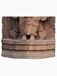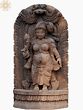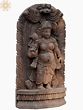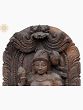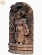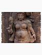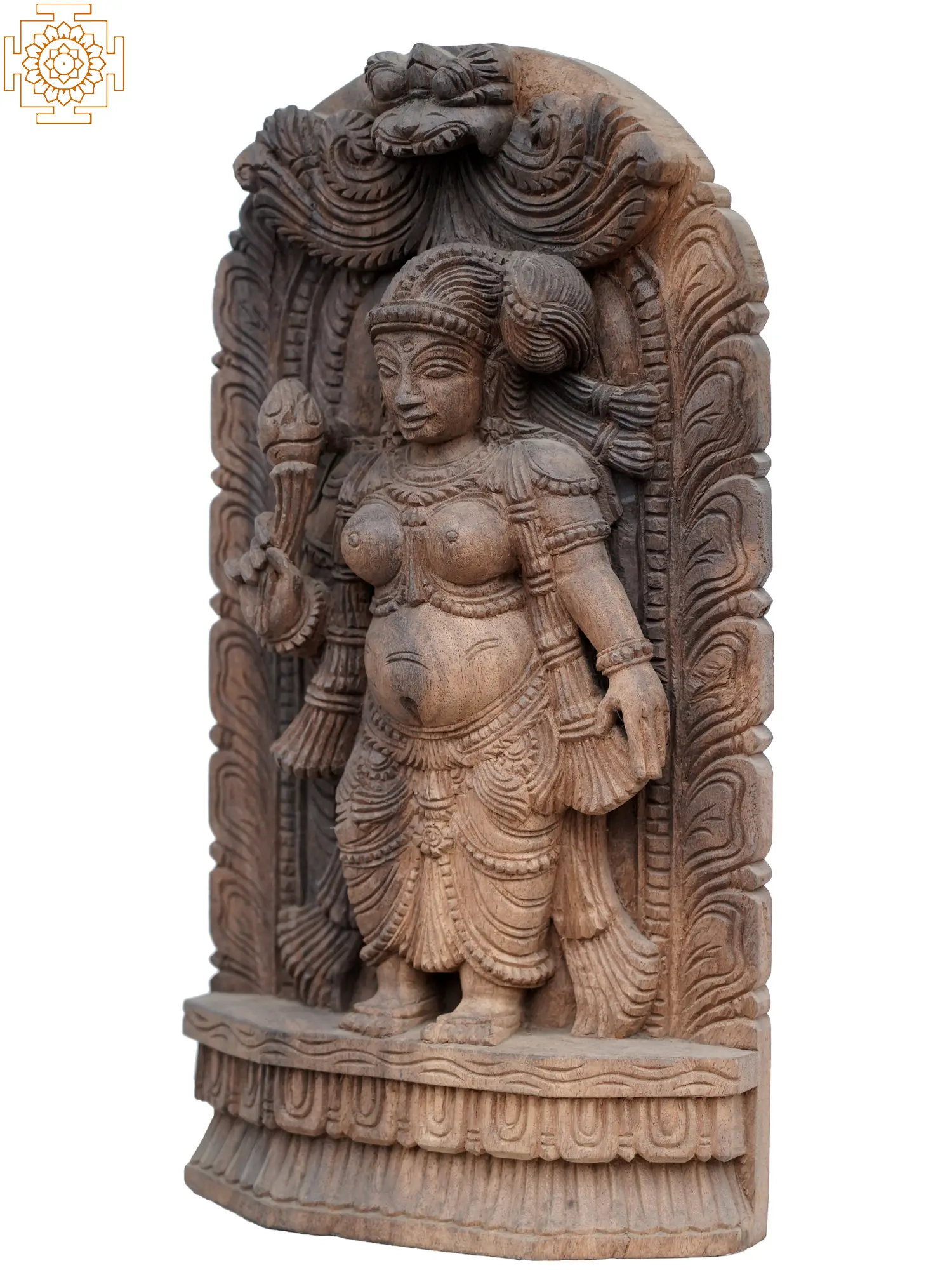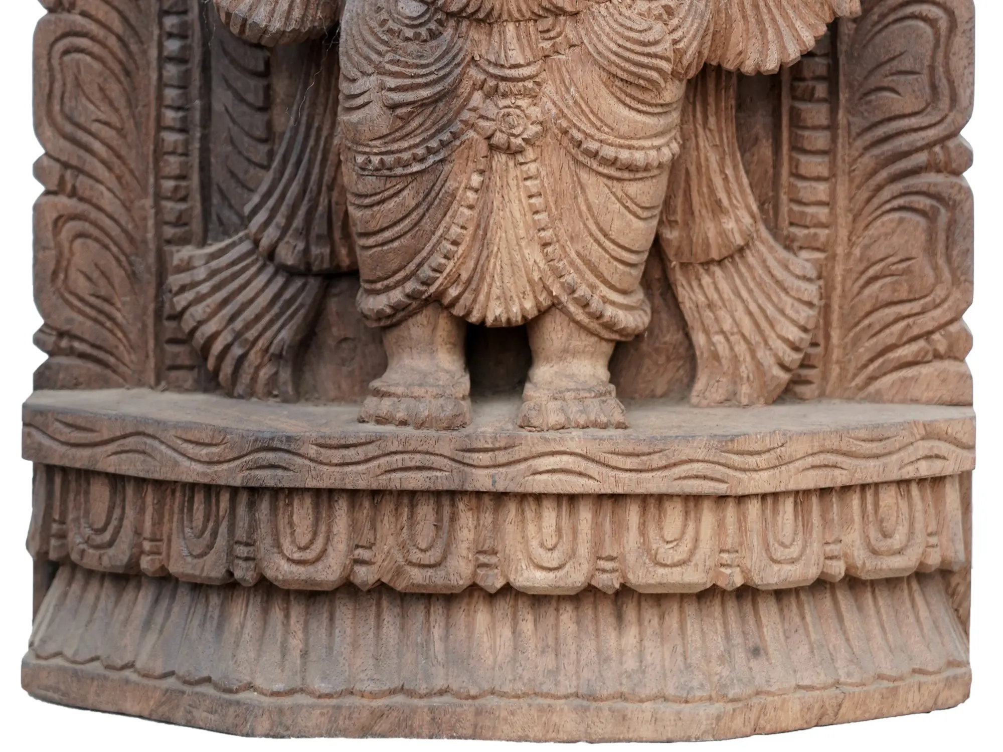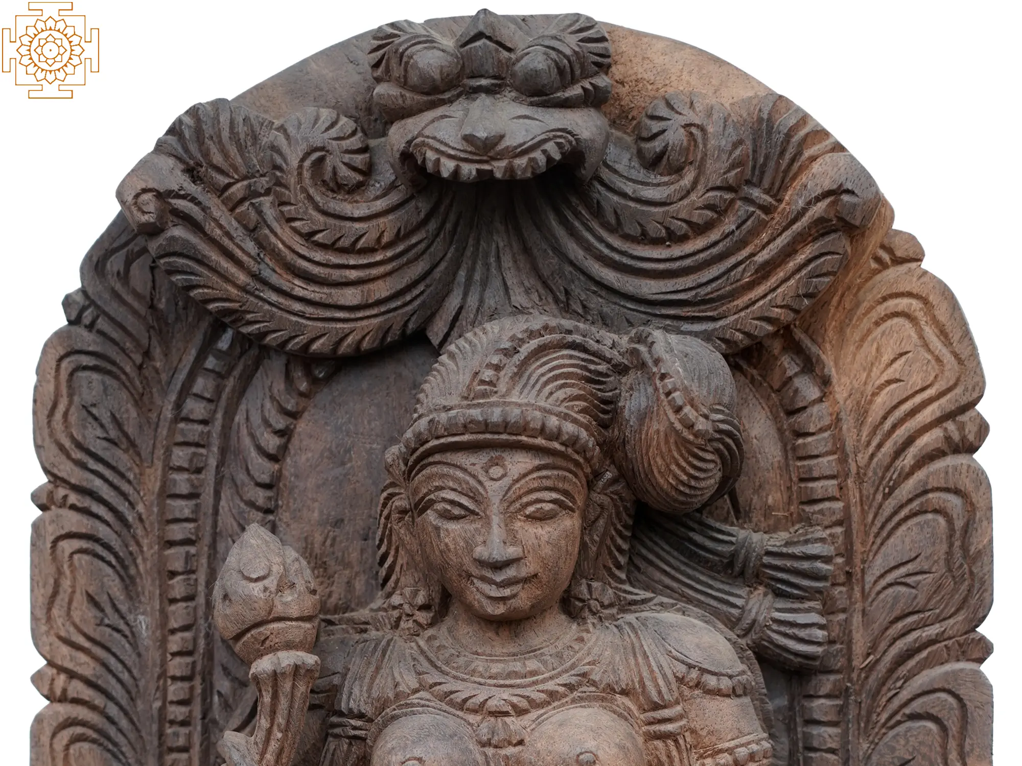 Standing on a lotus pedestal, surrounded by a splendid Kirtimukha aura, the woman in this wooden statue is identified as a Nair Lady from Kerala by her unique and elaborate hairdo. In the sacred realm of Hindu temples, her presence can be explained in several ways. She can be seen as a symbol of devotion, which she offers to the divine through the flower in her hand. She is also seen as the manifestation of the divine and fertile virtues of woman, highlighted by her accentuated womb and bosoms, which are symbols of maternal virtues and a universally sacred element in art.