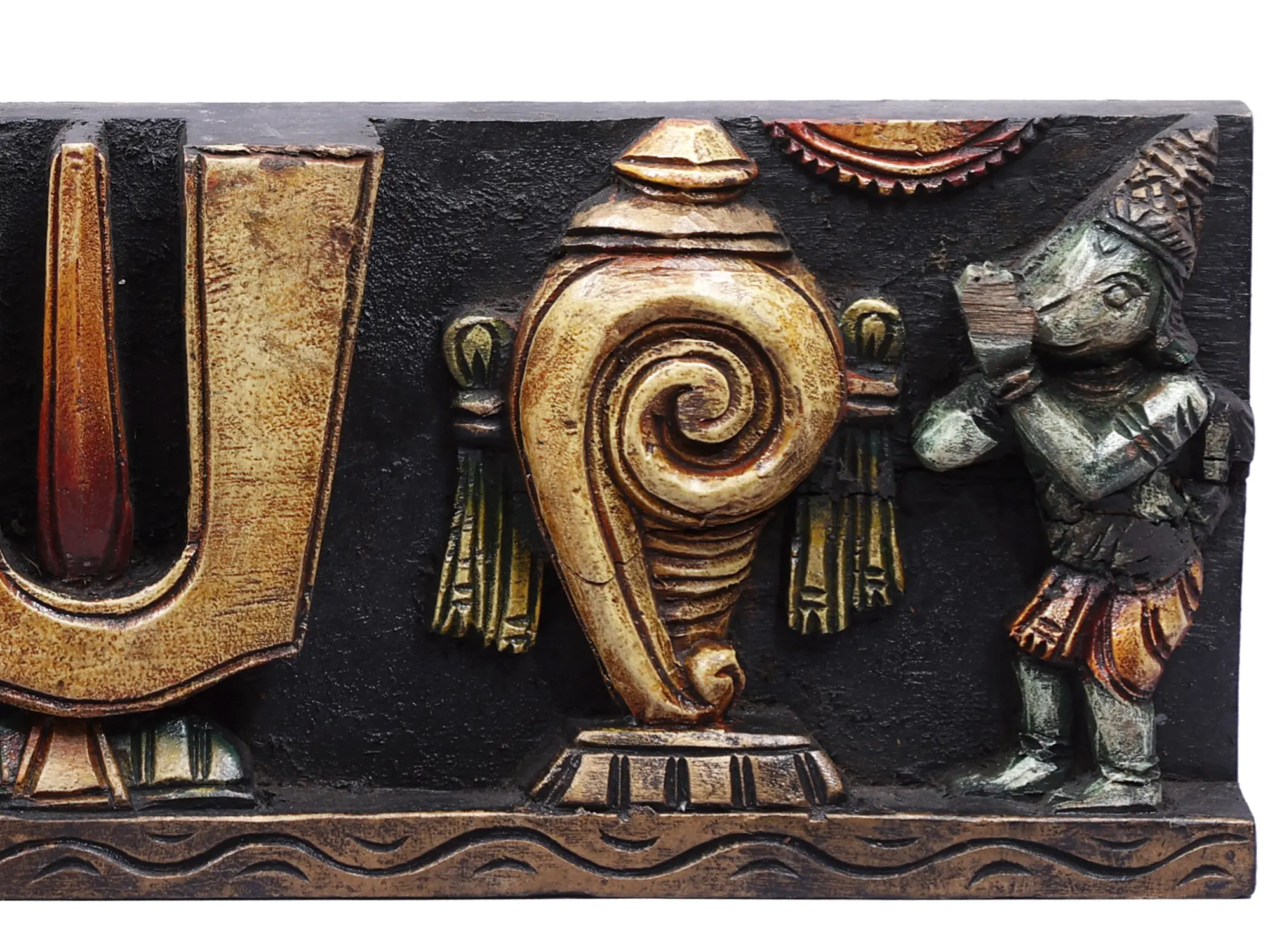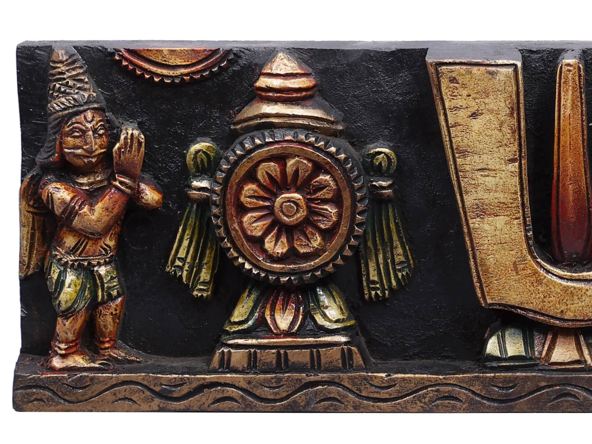 At the heart of this panel stands the majestic Vaishnava Tilak, a symbol of Vishnu's presence and grace. The U-shaped mark, often seen adorned on the foreheads of devotees, represents the divine footsteps of Lord Vishnu. Flanking this central symbol are the divine Sudarshana Chakra, the celestial discus of Vishnu, representing cosmic order, protection, and the power to destroy evil, and the Shankha, the conch shell, whose resonant sound is believed to dispel negativity and invoke auspiciousness. Together, these elements form a powerful representation of divine authority and spiritual safeguarding.