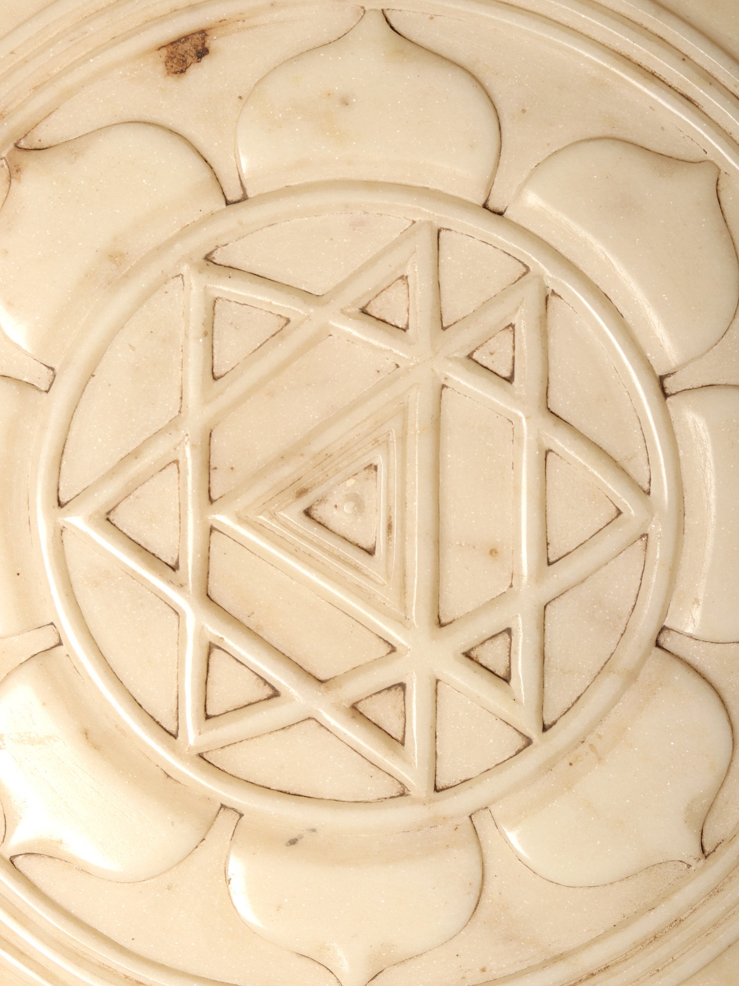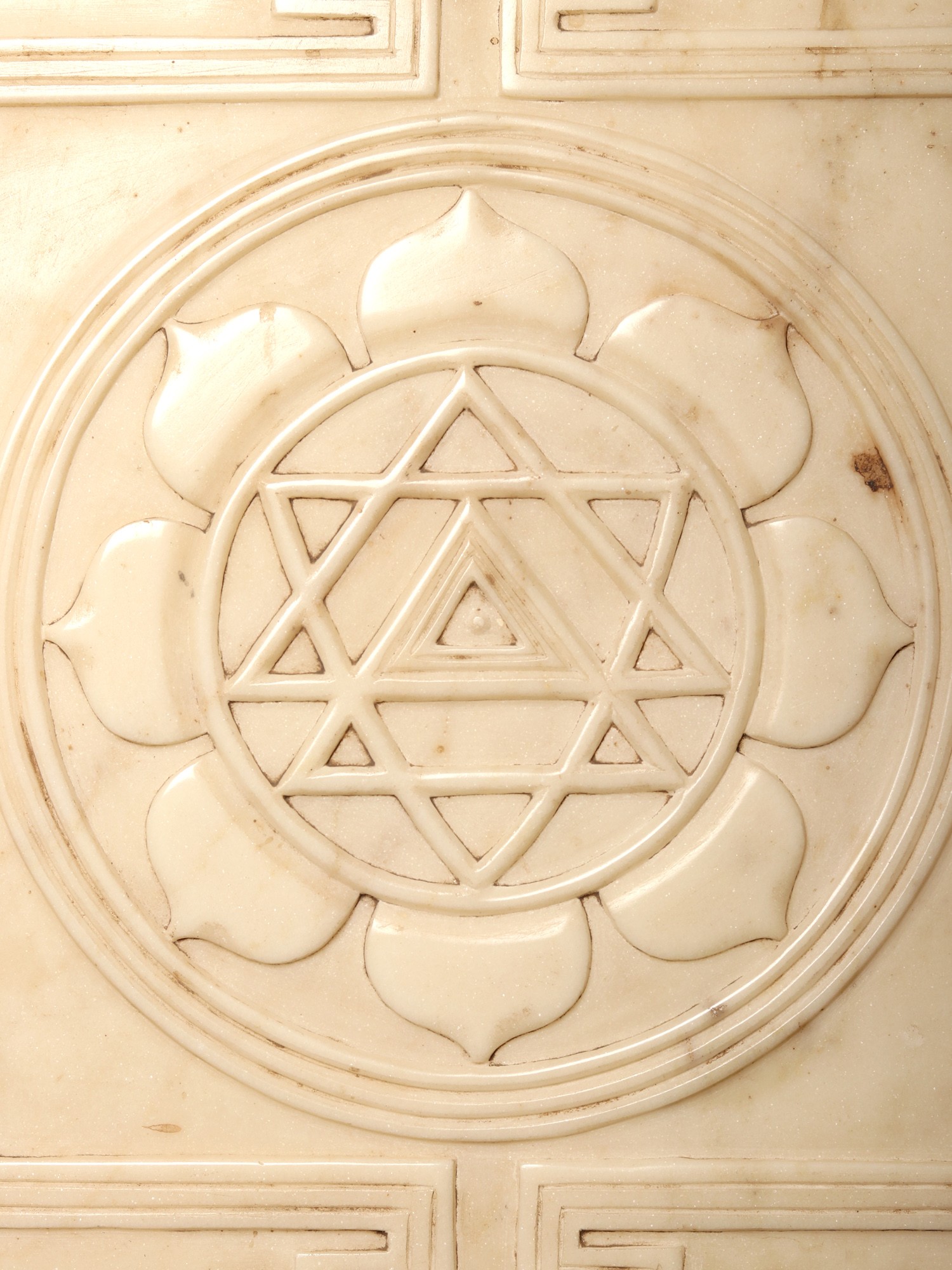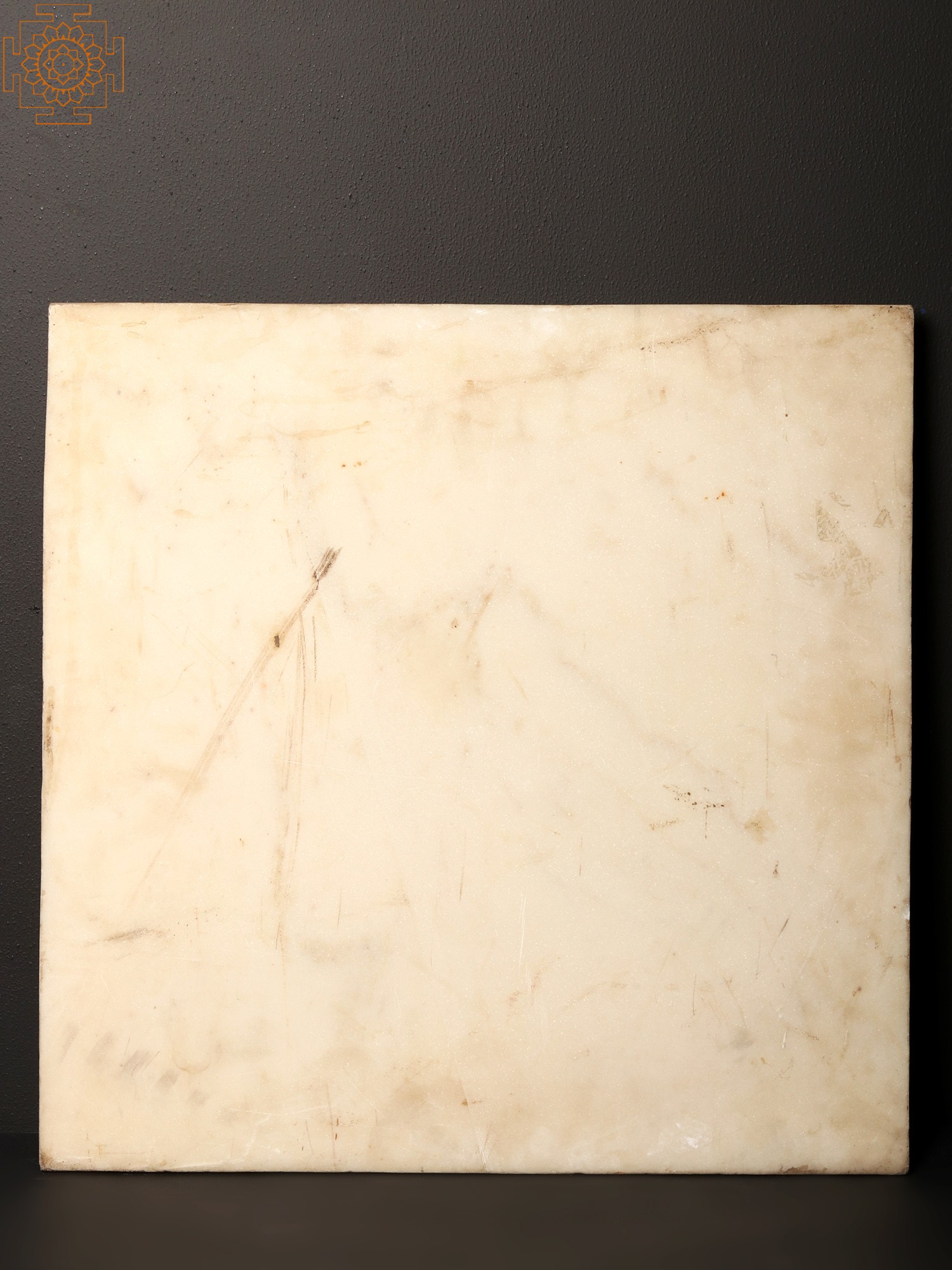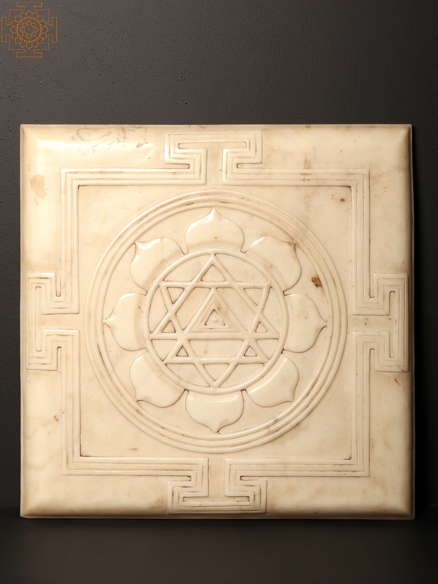 This 18" x 18" x 1.3" Sri Yantra is substantial enough to make a bold statement, yet its relatively flat profile allows for versatile placement. Whether displayed prominently on a shelf, mantelpiece, or incorporated into a more elaborate altar setup, this Yantra will add a touch of profound spiritual elegance to your space. Its solid marble construction ensures longevity and durability, a testament to its enduring value. It is a piece meant to be treasured and passed down through generations, carrying its mystical energy and spiritual significance into the future. The beauty and serenity of this piece will transform any space into a haven of peace and contemplation.
