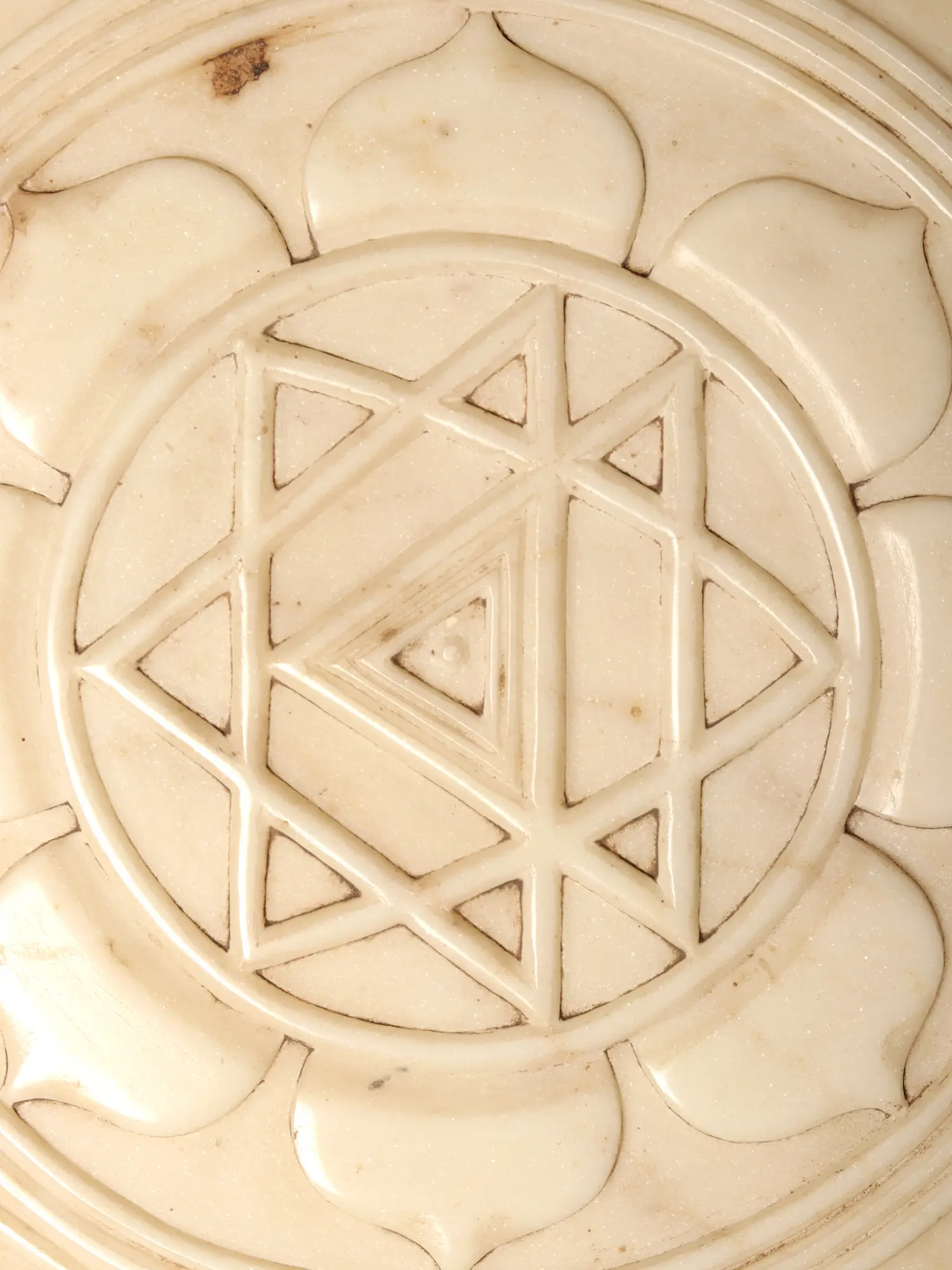 This exquisite 18" Sri Yantra, meticulously crafted from pristine white marble, is more than just a decorative piece; it's a portal to ancient wisdom and spiritual energy. The Sri Yantra, a fundamental diagram in Hindu and Buddhist tantric traditions, is considered the ultimate mystical diagram, representing the cosmos and the divine feminine energy, Shakti. Its intricate geometric patterns are believed to harmonise energies and promote spiritual growth. The interlocking triangles, circles, and squares create a mesmerizing visual tapestry, each element carrying profound symbolic meaning. The central point, the bindu, is considered the source of creation, radiating outwards into the manifested universe.