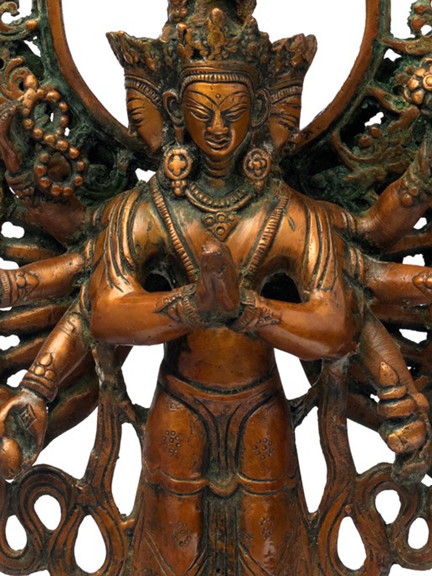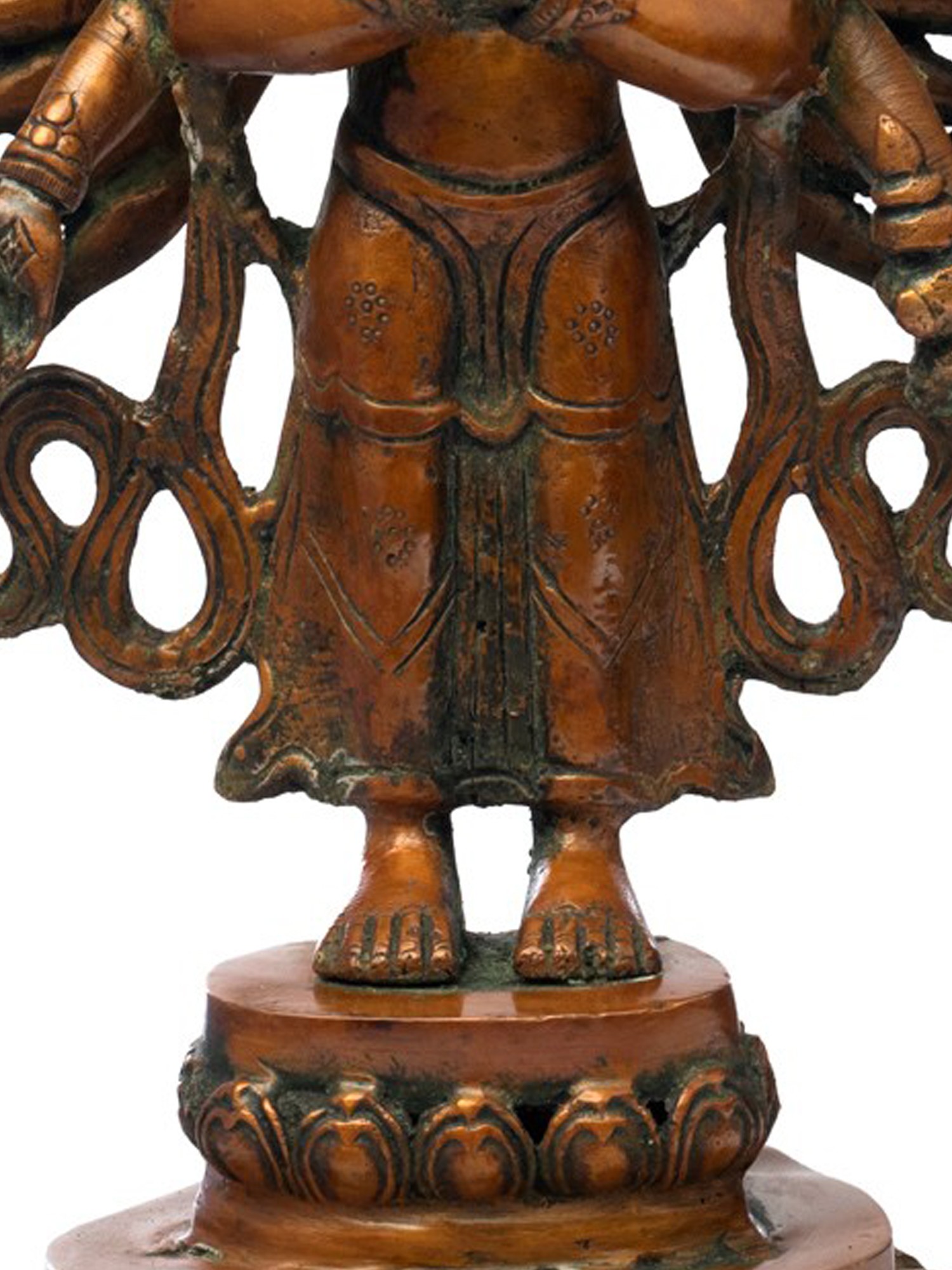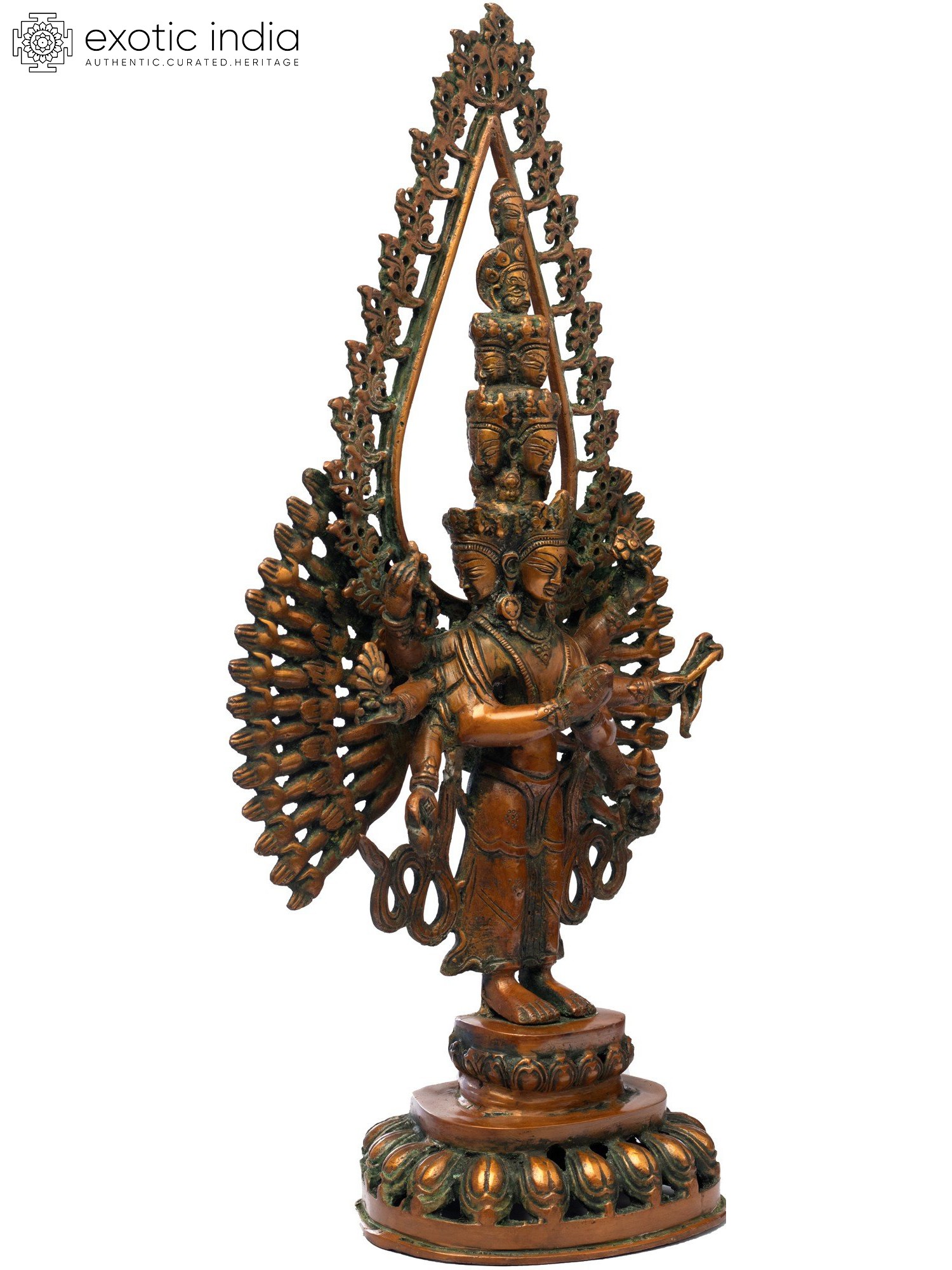 He has eleven thousand heads, which His single head resolved into a long time ago when He turned His mind to the sum of mortal suffering; and eleven thousand arms, which enable Him to work towards multiple causes for His devotees. This gorgeous brass composition brings out the beauty of this Bodhisattva to perfection. He stands with His brow steeped in dhyana, His hands in the namaskaram mudra while the rest of His arms flank the figurine. An aureole the shape of a lotus bud frames the towering succession of His infinite heads. Note the perfect symmetry of the composition despite the complexity of the deity in question. A two-tiered traditional lotus pedestal completes the divine sculpture.