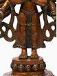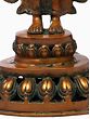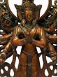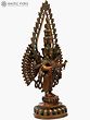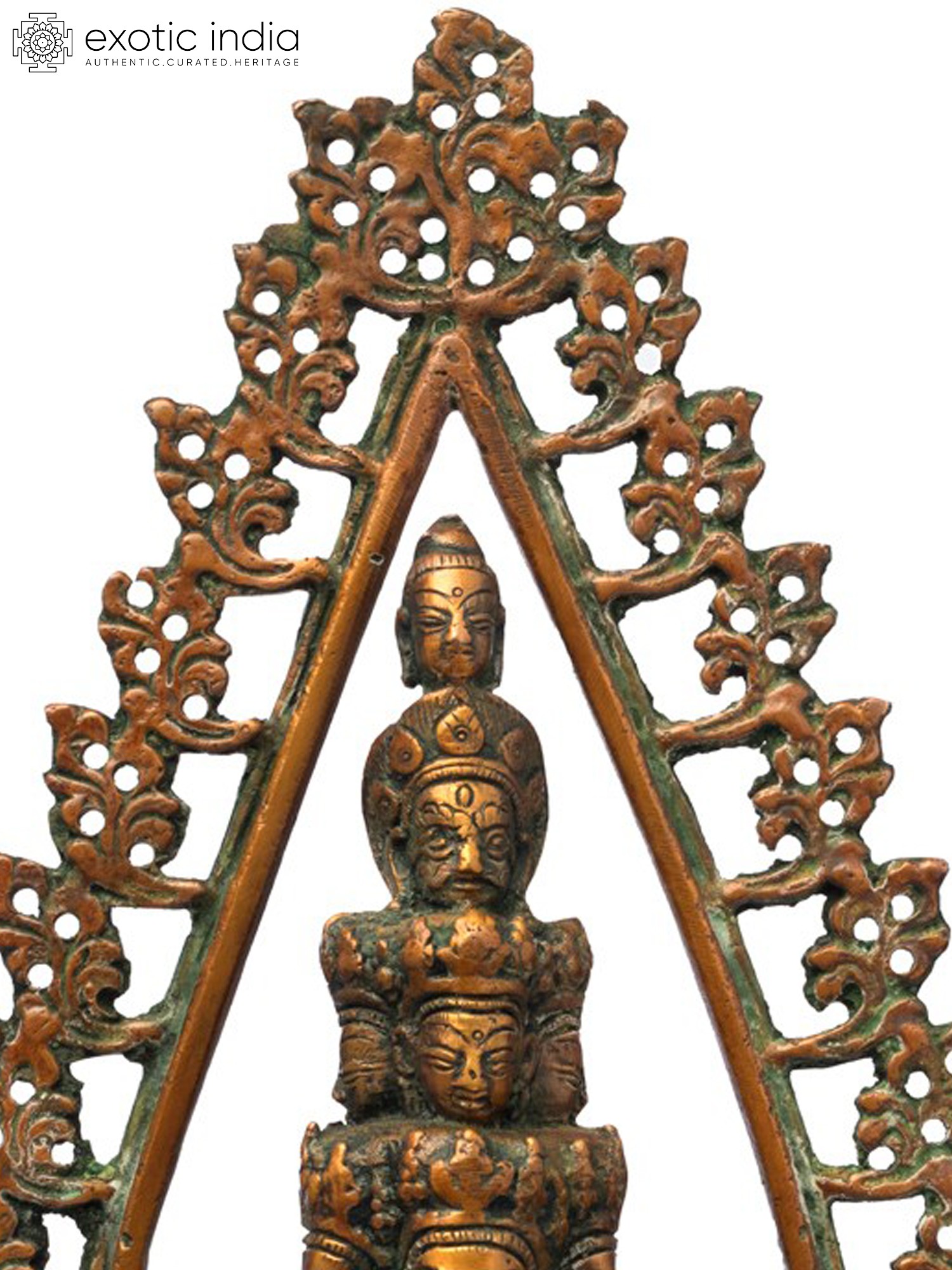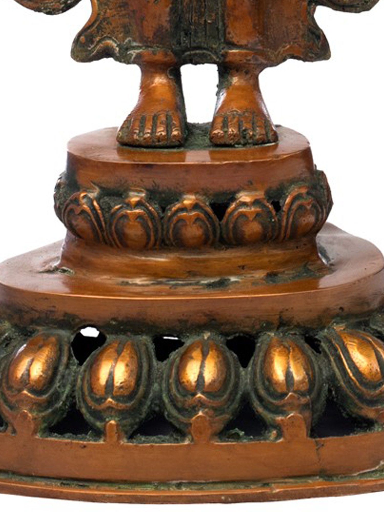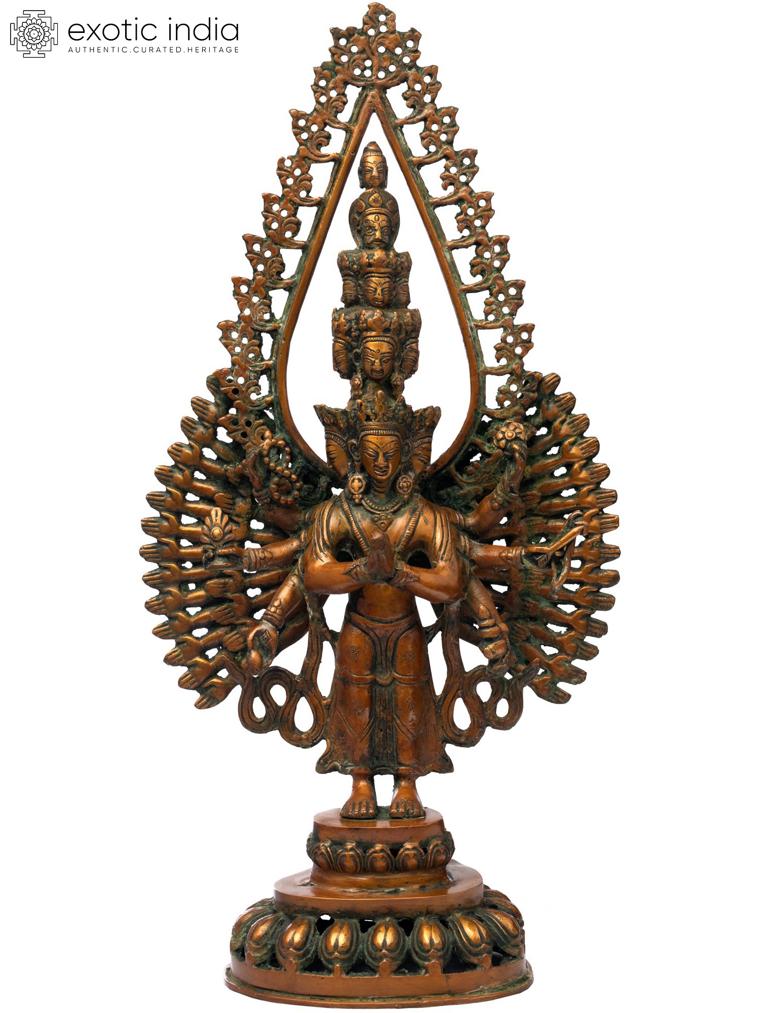 He has eleven thousand heads, which His single head resolved into a long time ago when He turned His mind to the sum of mortal suffering; and eleven thousand arms, which enable Him to work towards multiple causes for His devotees. This gorgeous brass composition brings out the beauty of this Bodhisattva to perfection. He stands with His brow steeped in dhyana, His hands in the namaskaram mudra while the rest of His arms flank the figurine. An aureole the shape of a lotus bud frames the towering succession of His infinite heads. Note the perfect symmetry of the composition despite the complexity of the deity in question. A two-tiered traditional lotus pedestal completes the divine sculpture.