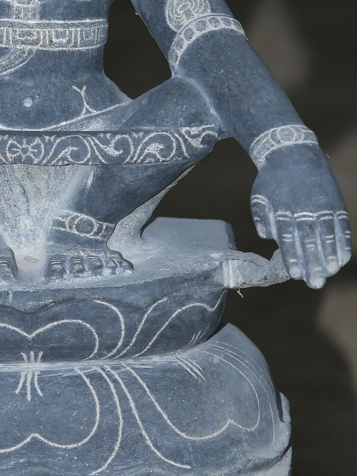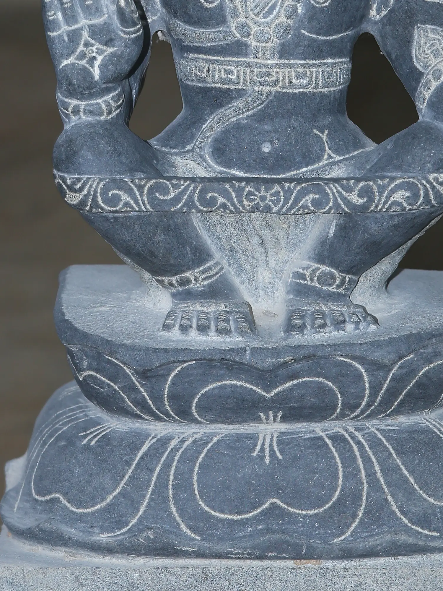 The smooth granite finish enhances the statue’s elegance while emphasizing every intricate detail, from the folds of his clothing to the sacred belt (Yajnopavita) draped across his body.