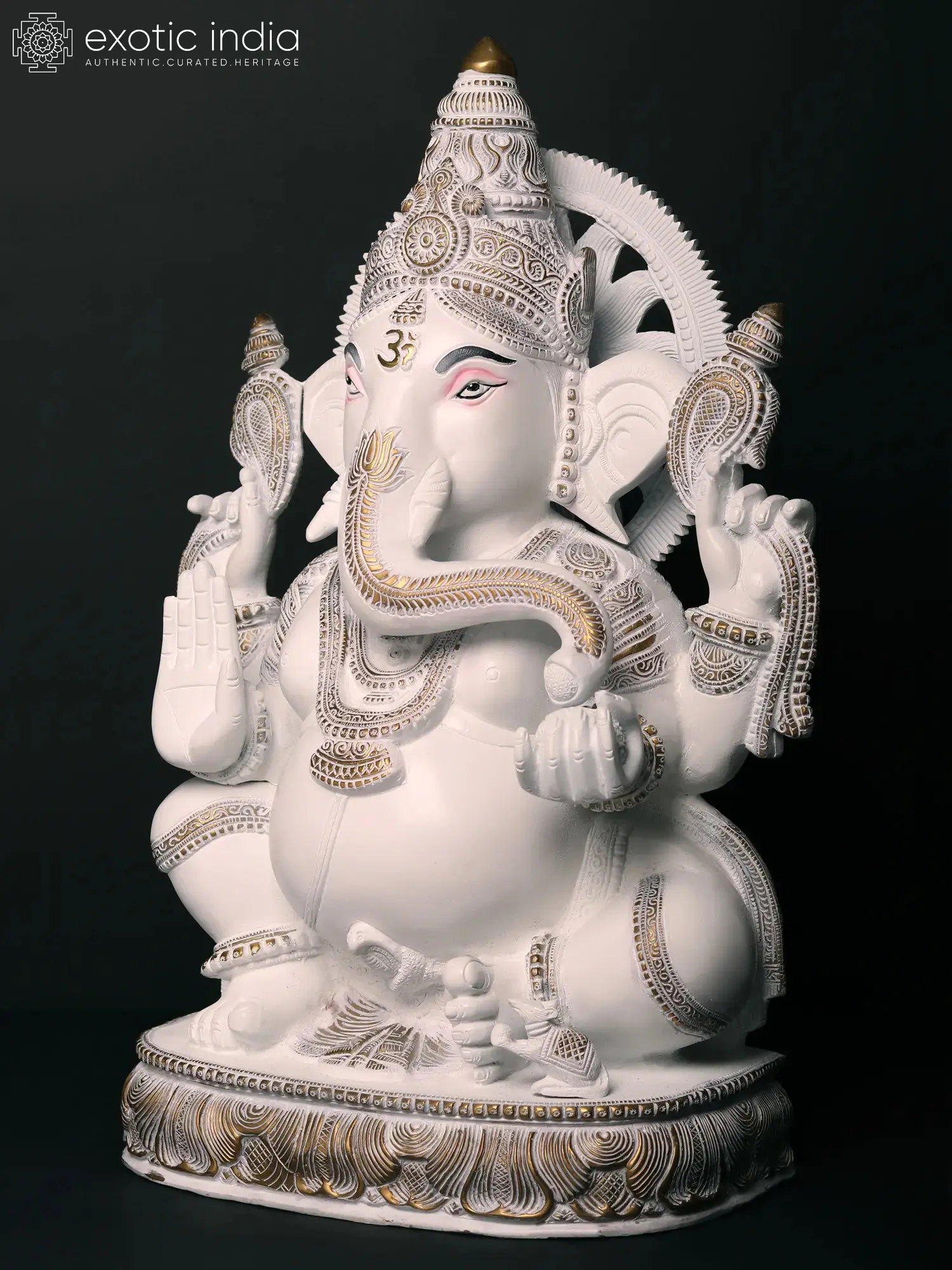 This depiction of Lord Ganesha emanating a pure white aura is stunning. Surprisingly, it is a wonderfully painted white brass statue. The milky white color of the statue provides the beholder with a completely different vision of the god than the more common grey or pink one. The statue features highly distinctive gold adornment painted on the white figure. Behind the statue, there is a halo of light in the shape of a sun, indicating the blessings of the Sun God, which accompany the blessings of Lord Ganesha. This statue is a magnificent work of art that may hypnotize the spectator with its hypnotic aura; having this statue at home would fill the devotee's heart with joy.