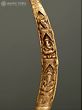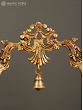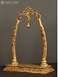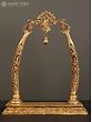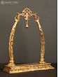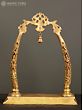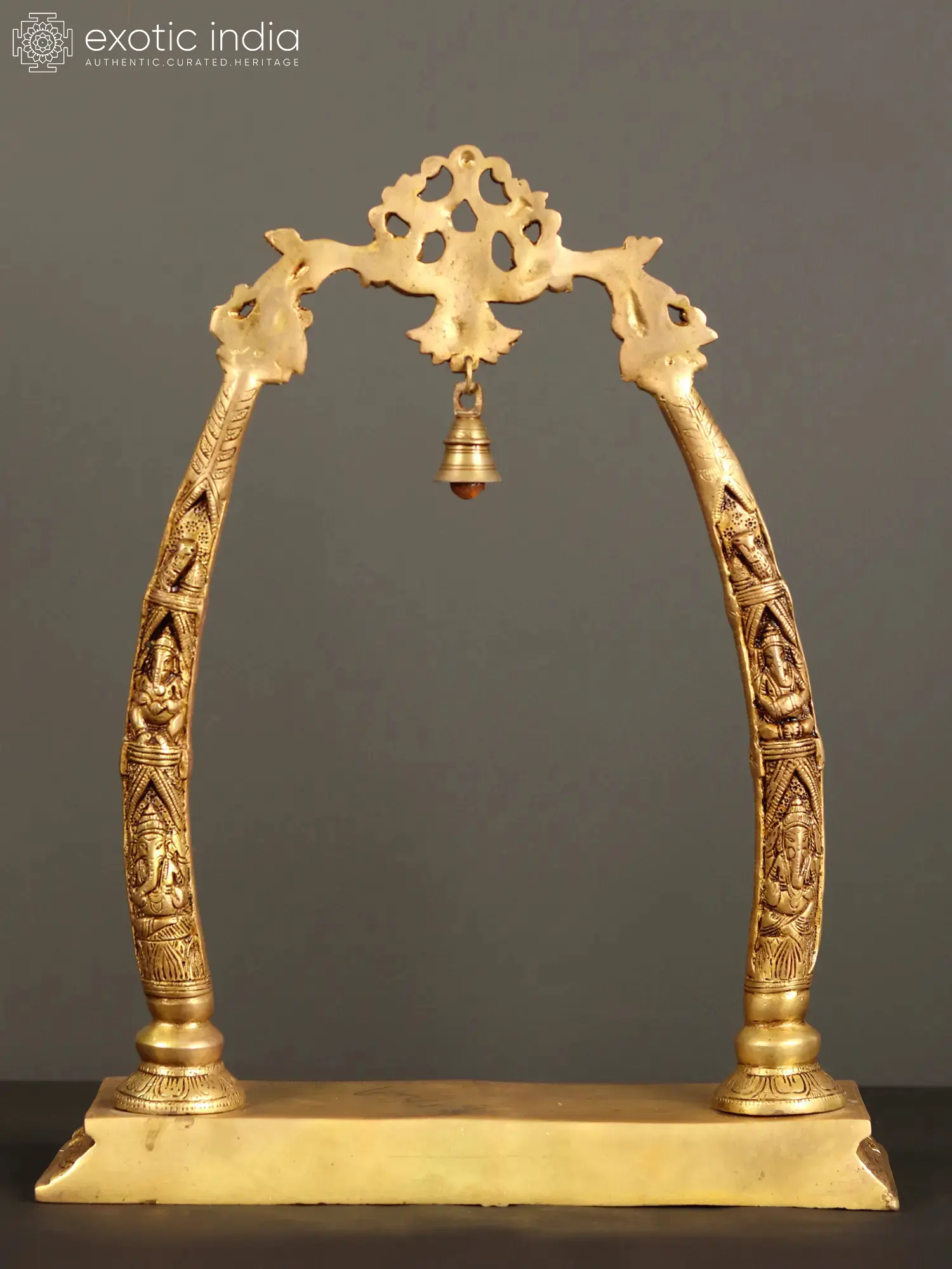 An element that encapsulates grandeur and aesthetics, this brass aureole with images of Sri Ganesha is a beautiful component for any sacred space. Made with pure brass, the aureole has a simple rectangular base with a vegetation motif etched on it. Two pillars shaped like elephant tusks emerge from their lotus bases and combine on the top with a mesmerizing foliage structure. A ghanti or bell hangs from the center of aureole and inside the tusks are images of Ganapati in his benevolent roopa and as a divine musician, infusing the composition with holiness.
