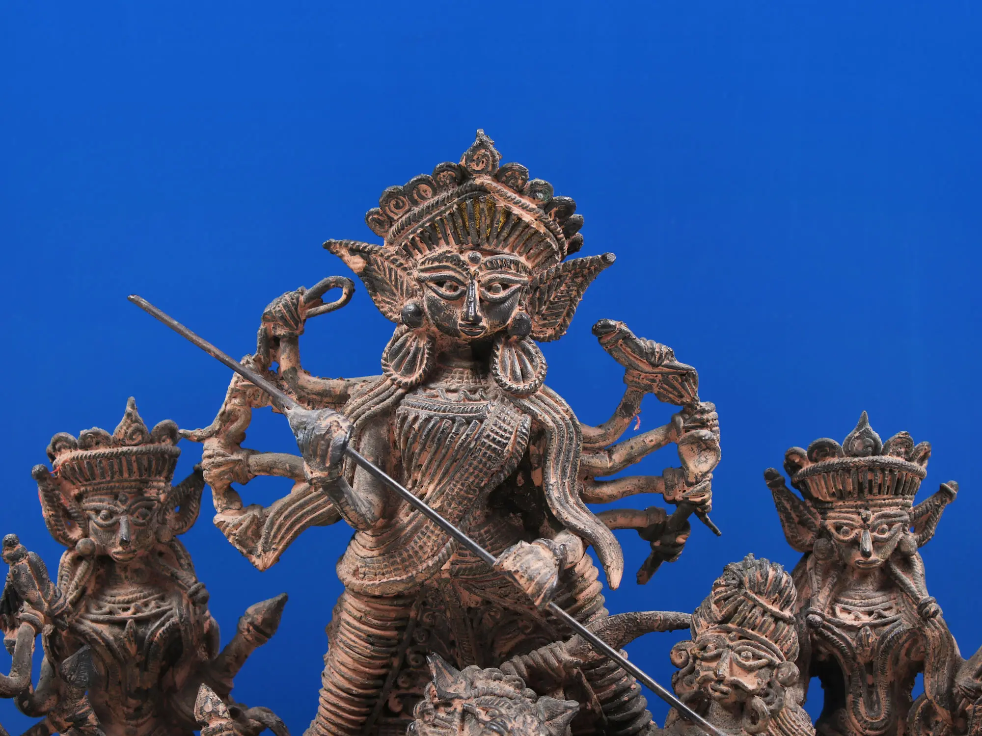 The composition is a dynamic tableau, centered around the triumphant Goddess. Flanking her are other significant deities, often depicted as her divine companions or emanations. The presence of Lord Ganesha, the remover of obstacles and patron of arts and sciences, suggests blessings and auspicious beginnings. Other figures, perhaps representing aspects of nature or the celestial realms, add depth and complexity to the scene, all unified by the overarching narrative of divine intervention. The powerful lion, the Vahana (mount) of Durga, stands proudly beside her, a symbol of her regal authority and indomitable spirit. Together, they form an iconic representation of the divine feminine power that protects and nurtures creation.