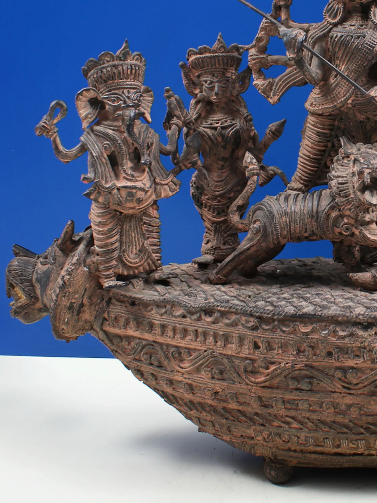 Meticulously crafted from high-quality brass, this sculpture showcases the intricate artistry and dedication of traditional metalworkers. The detailed ornamentation, from the divine figures' crowns and attire to the elaborate patterns adorning the base, speaks volumes about the rich artistic heritage from which it originates. The base itself is designed to resemble a boat or a chariot, perhaps symbolizing the journey of life, the passage through challenges, or the divine vessel that carries devotees through the cosmic ocean. The patina and texture of the brass enhance its antique appeal, giving it a timeless quality that suggests a lineage stretching back through generations of devotional art.