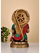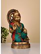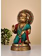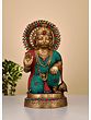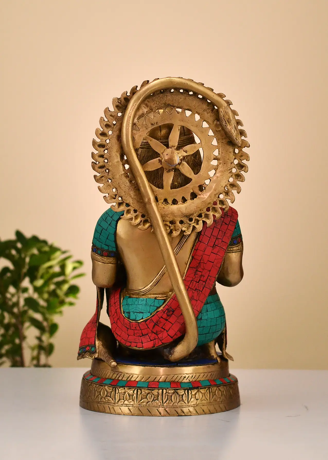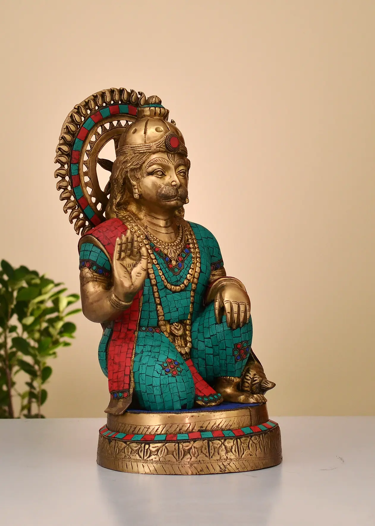 This breathtaking statue captures the very essence of Lord Hanuman’s majestic presence. He sits on one knee, a symbol of humility, with his right hand poised in the “Ashirwad Mudra”, bestowing blessings upon all who approach. Adorned in regal attire, He wears necklaces, sacred Mala that whispers of devotion, and Kundals that gleam like stars in the night sky. Atop his noble brow rests a regal crown, “the Pitambar”, signifying his divine sovereignty. The fiery chakra or halo behind Lord Hanuman’s head signifies his cosmic authority. Beside him, his mighty mace rests, a silent sentinel of strength. Crafted in brass and embellished with intricate inlay work, this statue encapsulates the grace, power, and eternal compassion of Lord Hanuman.