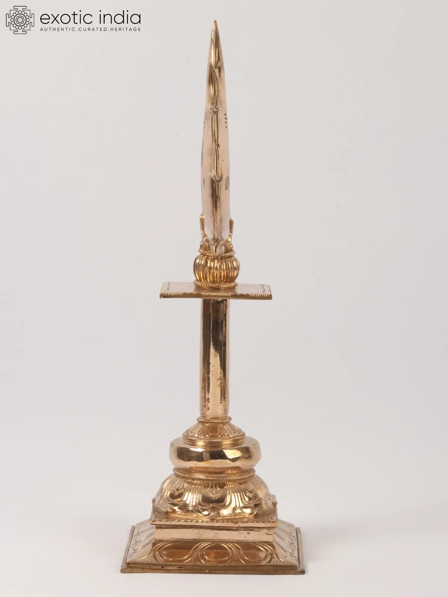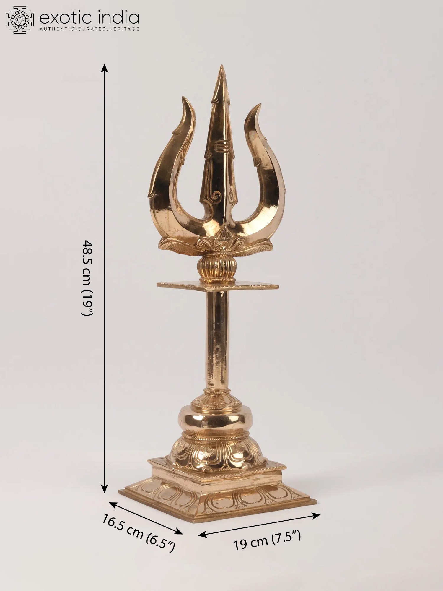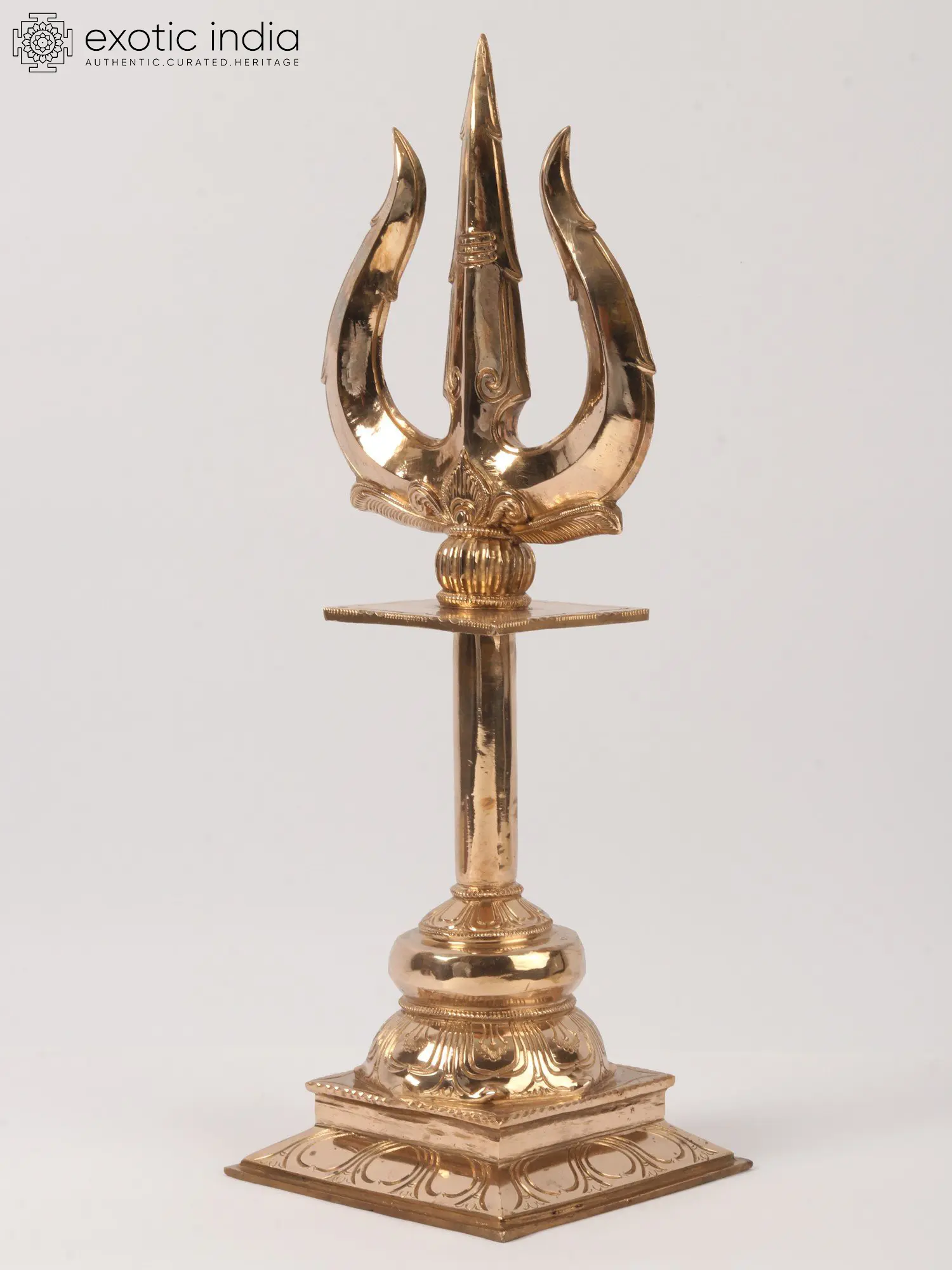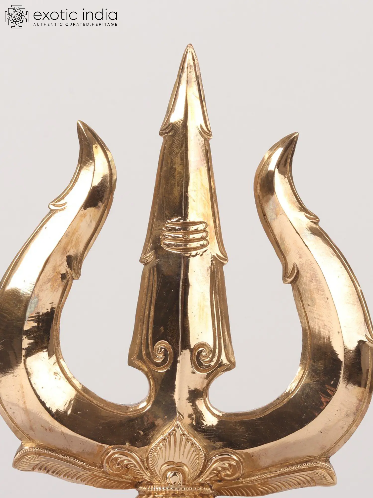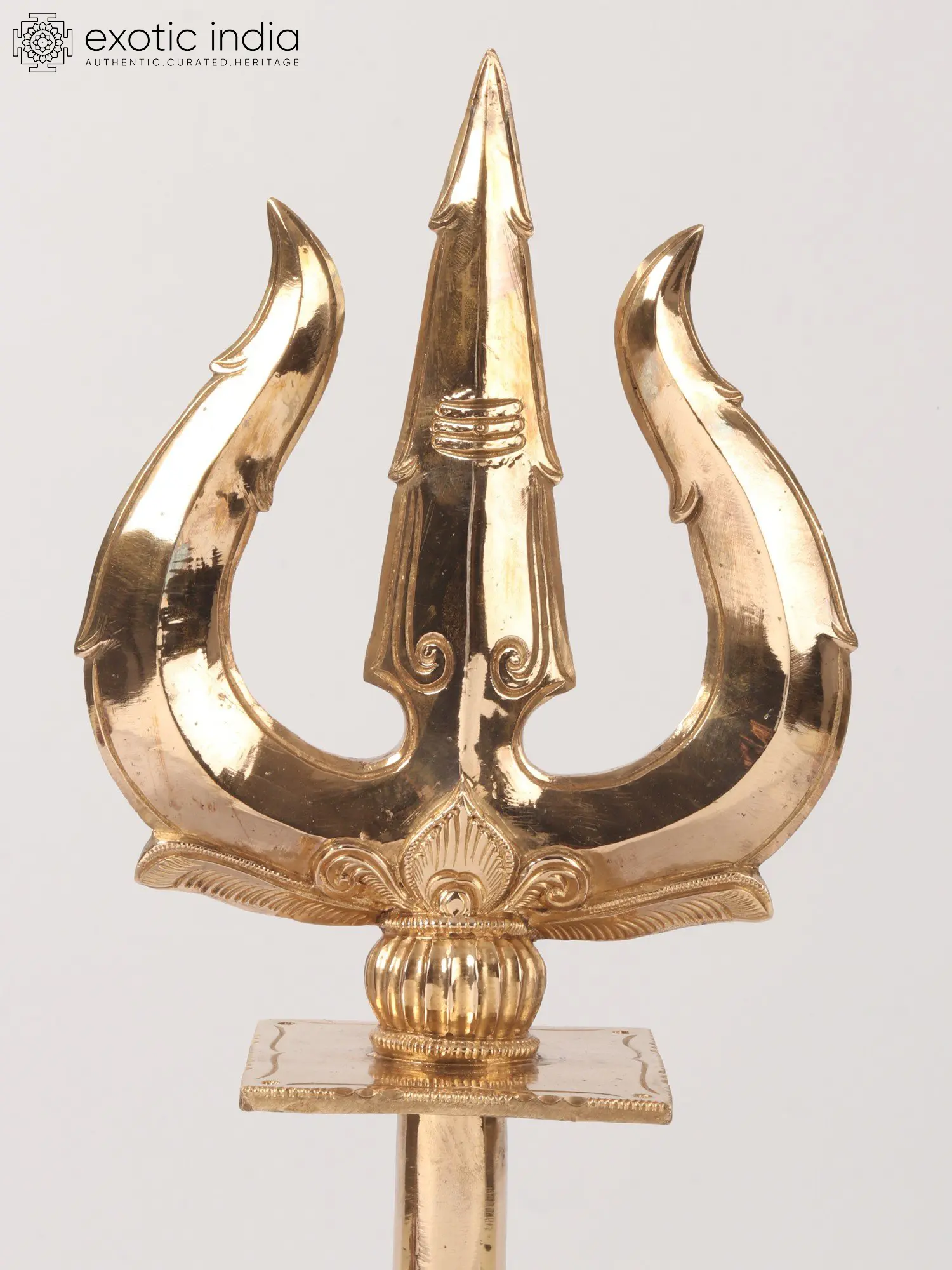 This bronze Trishul is a revered emblem in Hinduism, having significant spiritual significance. It portrays Lord Shiva's almighty trident, a sign of his cosmic power, with three prongs merging into a single point. Trishul's three prongs represent the Hindu trinity of Brahma, Vishnu, and Mahesh. It is also associated with other important spiritual religious symbols, such as the three Kaalas, or the past, present, and future. Lord Shiva, the destroyer of false ego and Maaya (attachment), is depicted bearing the Trishul, defeating demons of illusion and greed, and inspiring people to follow the spiritual path. This Trishul is put on three lotus pedestals placed on each other for transportation and the convenience of posing with the Lord Shiva idol during ceremonies.