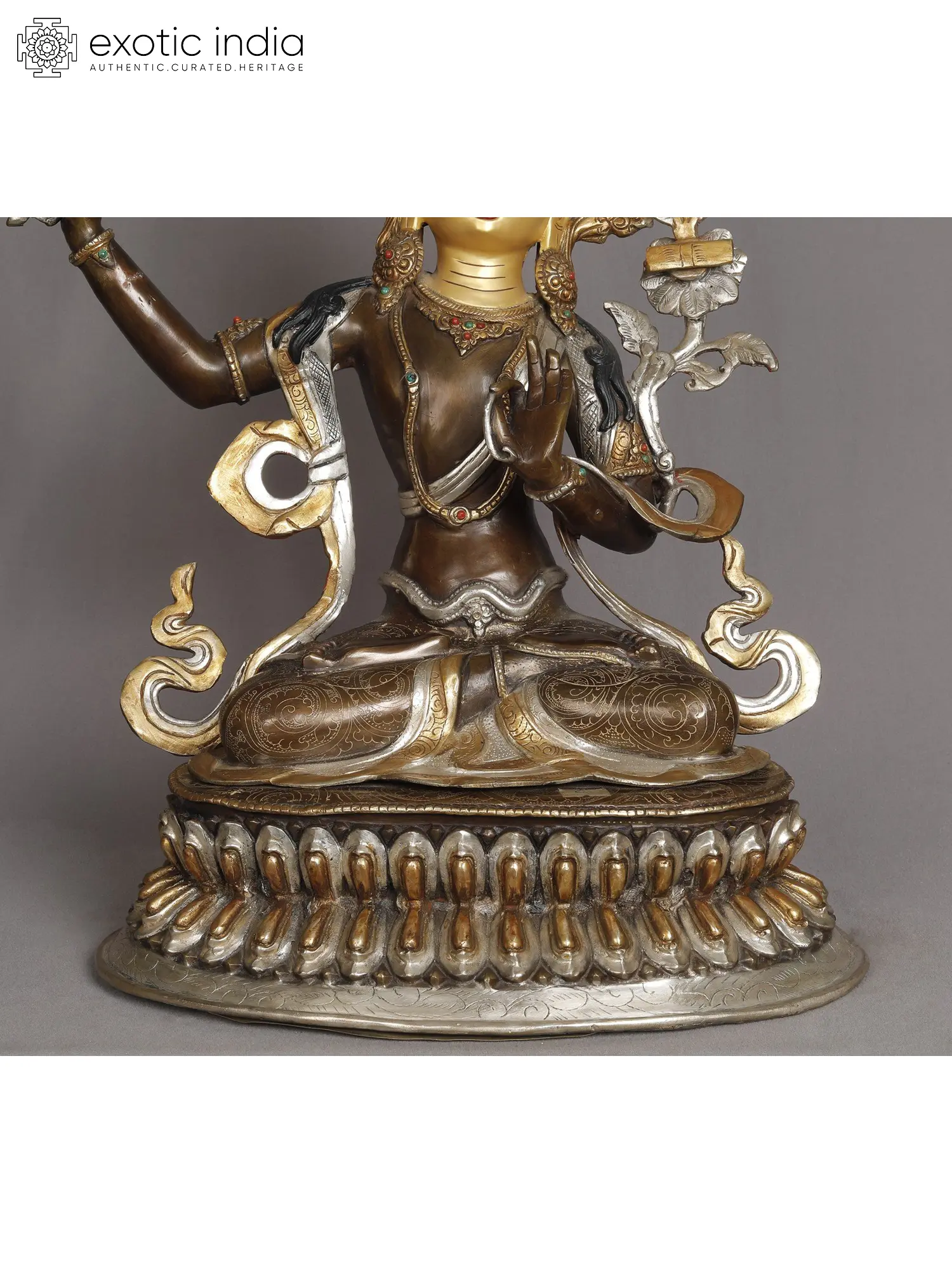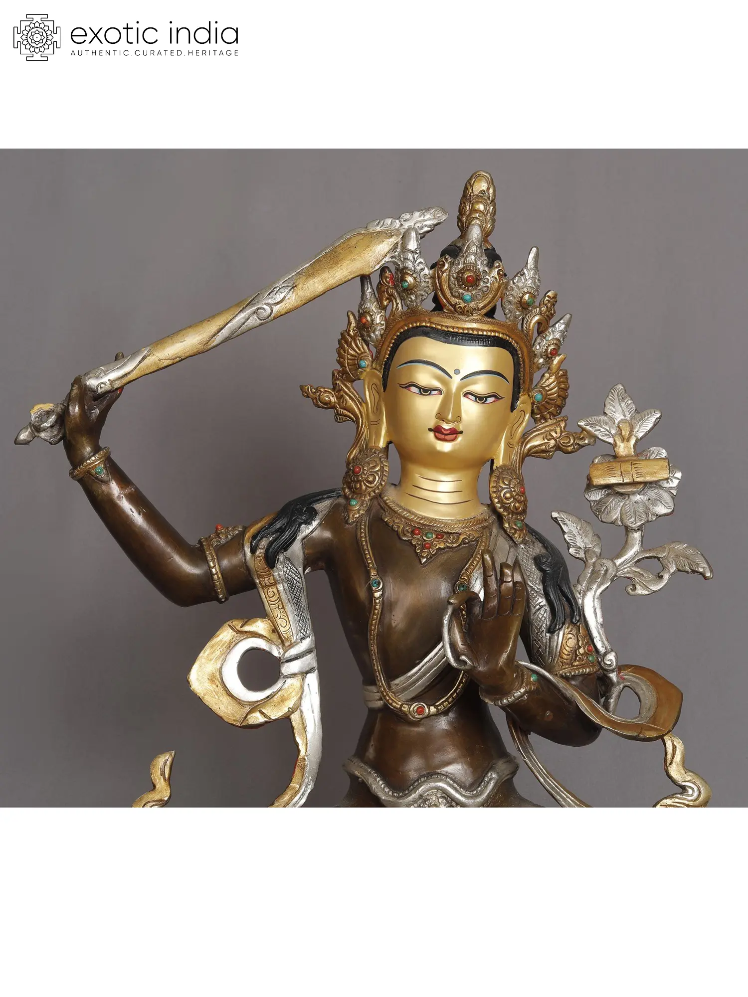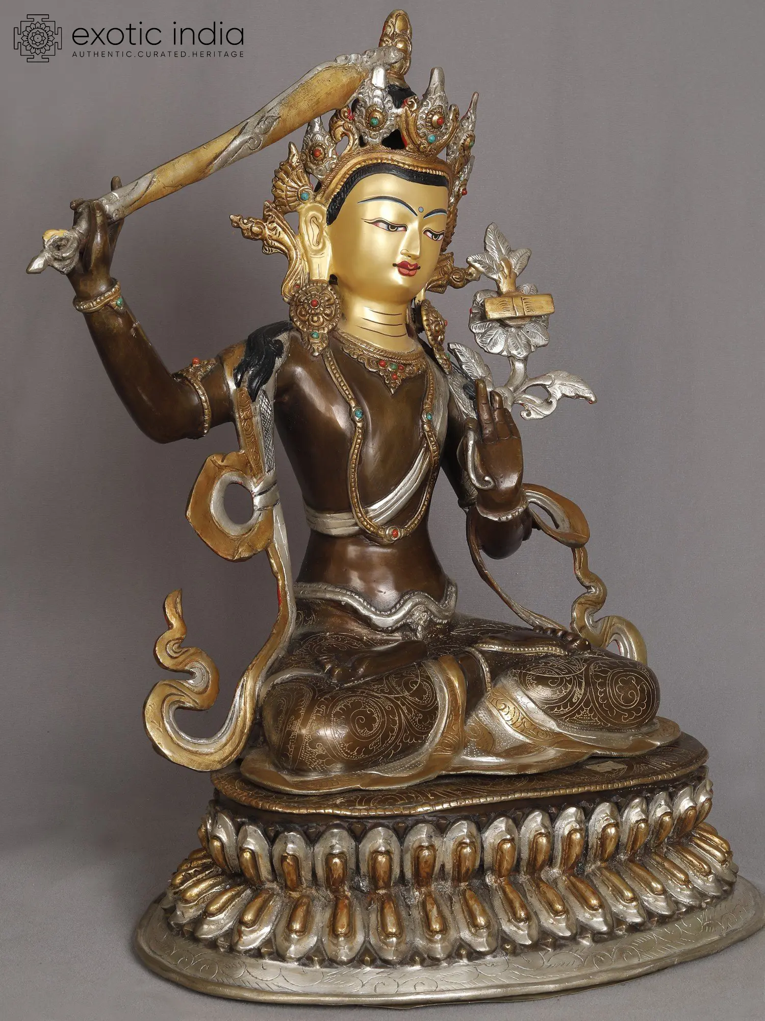 His left hand, embracing the stem of a lotus, carries a book—the Prajnaparamita or Perfection of Wisdom teaching. Seated on a lotus throne, Manjushri draws a parallel with the lotus's unstained purity in muddy waters, reflecting wisdom's transcendence over delusion.