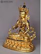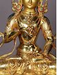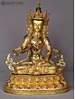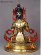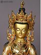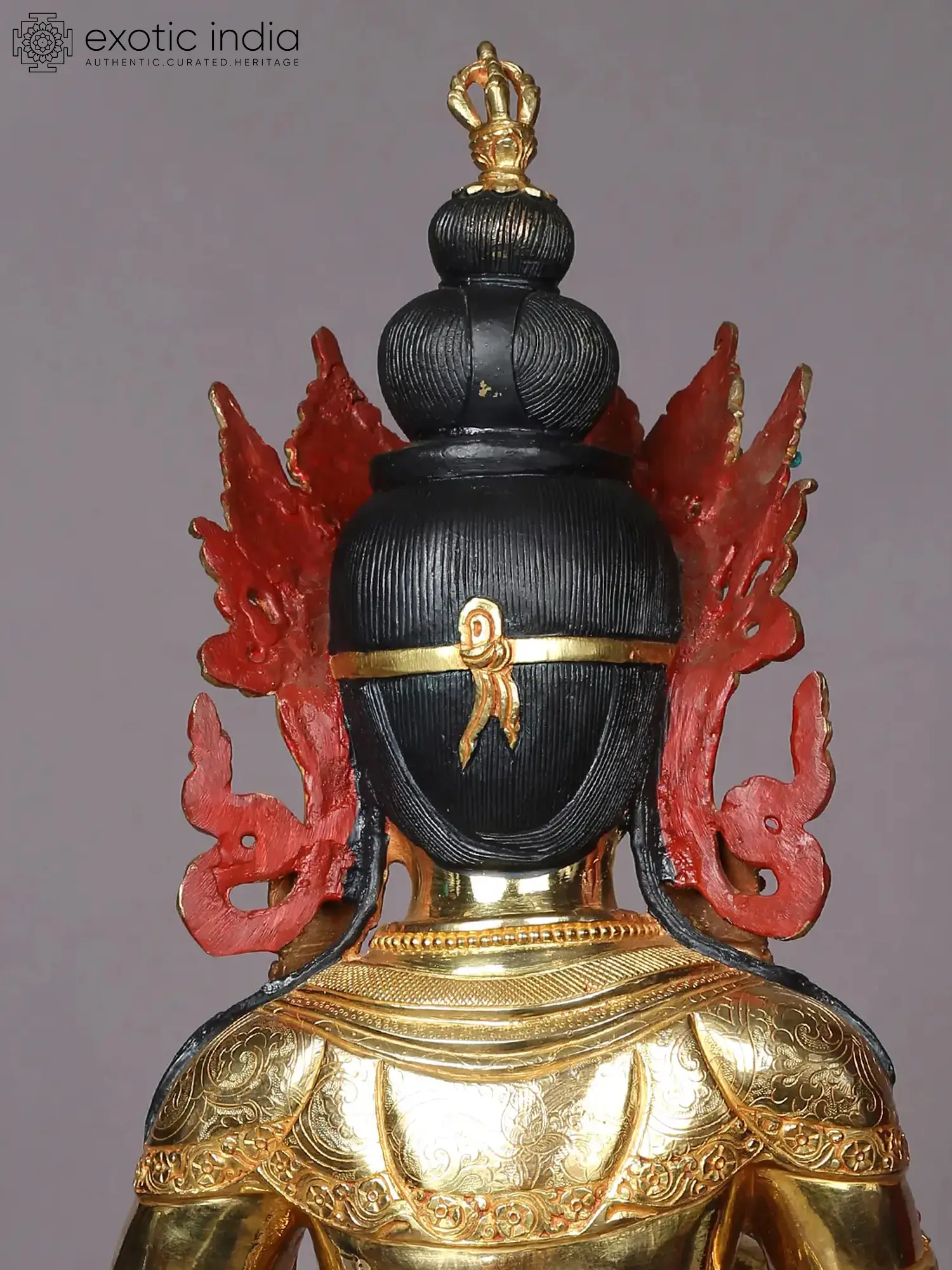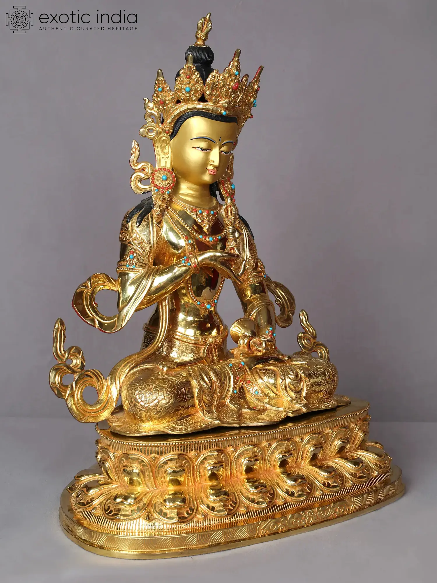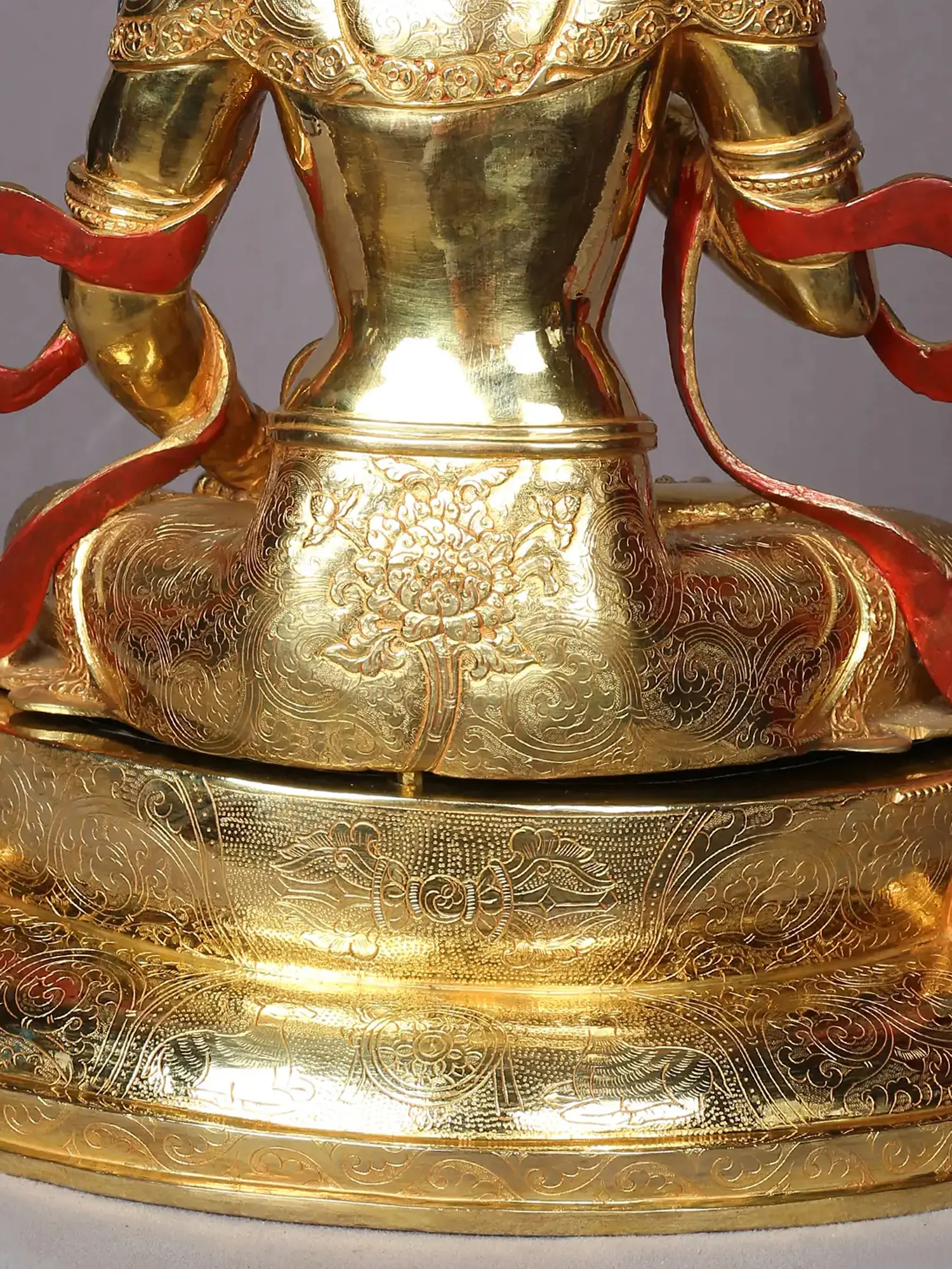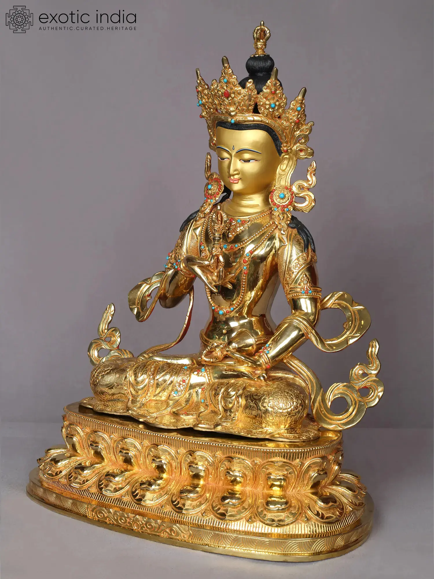 Vajrasattva- the essence of Vajra or the supreme manifestation of wisdom is a Bodhisattva in the Vajrayana tradition, which in its simplest form is the materialization of the enlightened potential that resides among us all. As the crown prince of Buddha, Vajrasattva in this gilded copper Nepalese statue wears pristinely patterned attire, traditional ornaments, and an elaborate hairdo. The Vajra and bell in Vajrasattva’s hands are a union of wisdom and compassion, required to achieve the blessings of this mighty Bodhisattva. Richly inscribed, the statue on its reverse has the Vajra, deer, and chakra symbols empowering the composition.